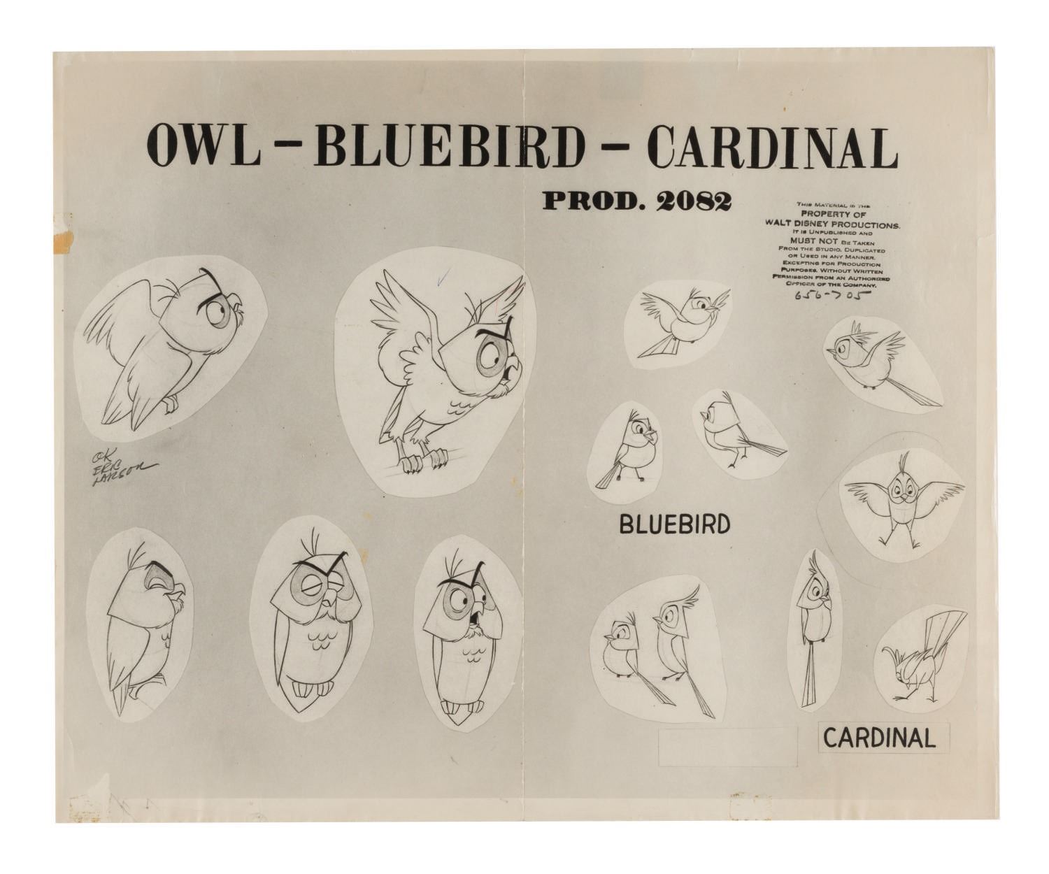 (Disney, 1956) A photostat model sheet of birds from Walt Disney's 1959 release Sleeping Beauty." The piece features (3) bird characters in numerous expressions to aid the animators during production of the film. Measuring 14"x17", the sheet is in very good condition, despite minor fading and a vertical crease.