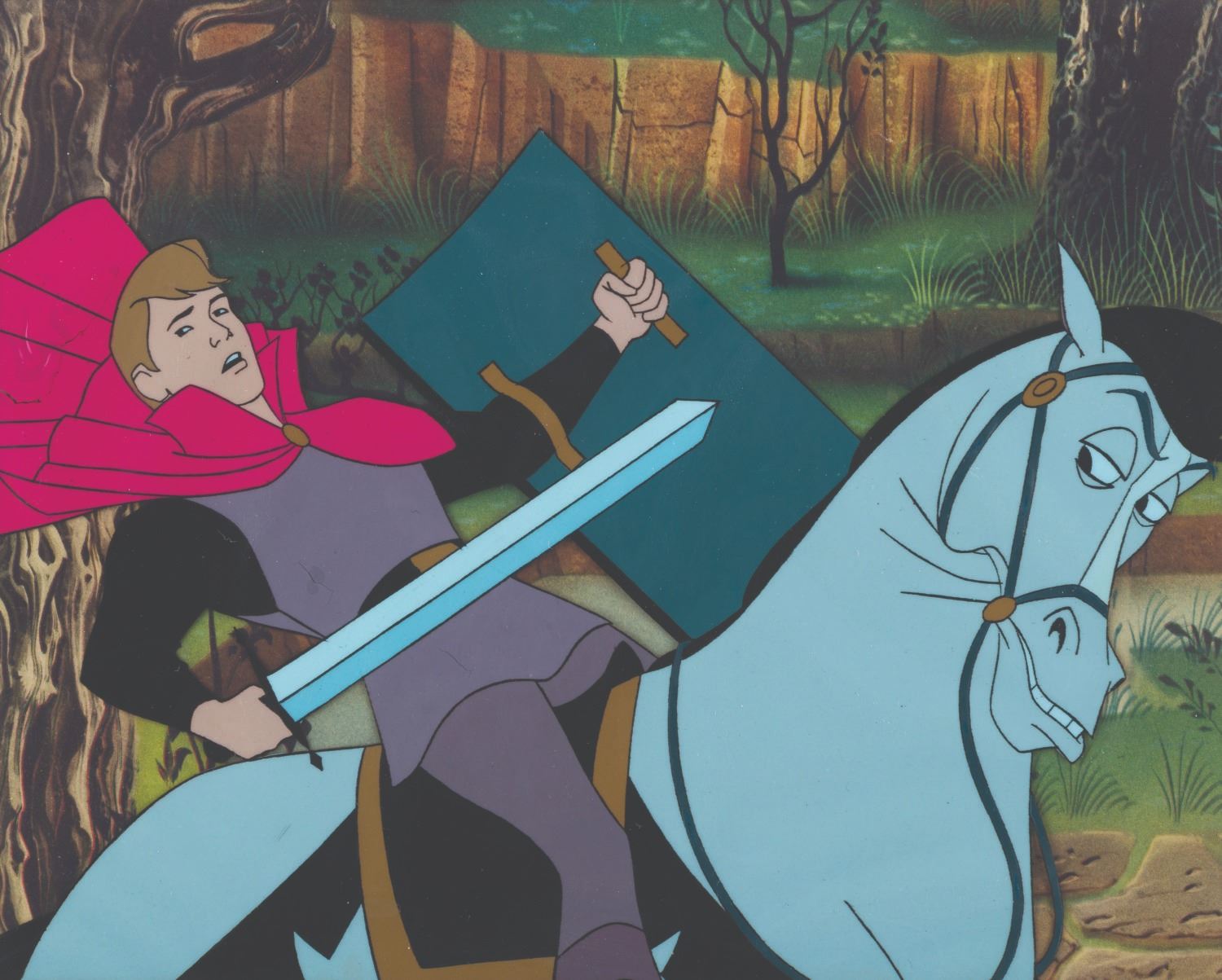 (Disney, 1959) An original production cel of Prince Phillip and Samson from "Sleeping Beauty,” with a color copy background. This cel was sold at the Disneyland Art Corner, and comes with the original Art Corner gold label on the back of the matte. Prince Phillip and Samson have an image size of 6.75” x 10” on an 8” x 10” visible cel. The entire matted piece measures 11” x 14”. The piece displays in very good condition with light paint cracking to Phillip’s cape and armor, light warping from age, and edge wear and heavy discoloration to the matte from age.