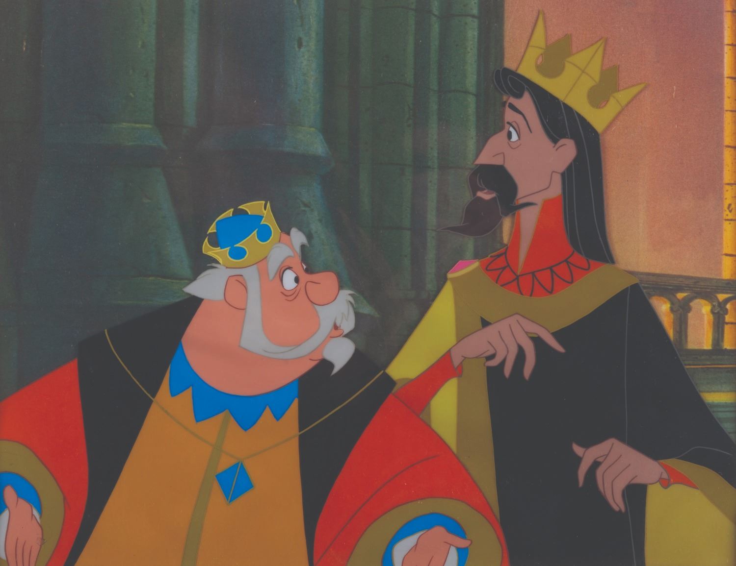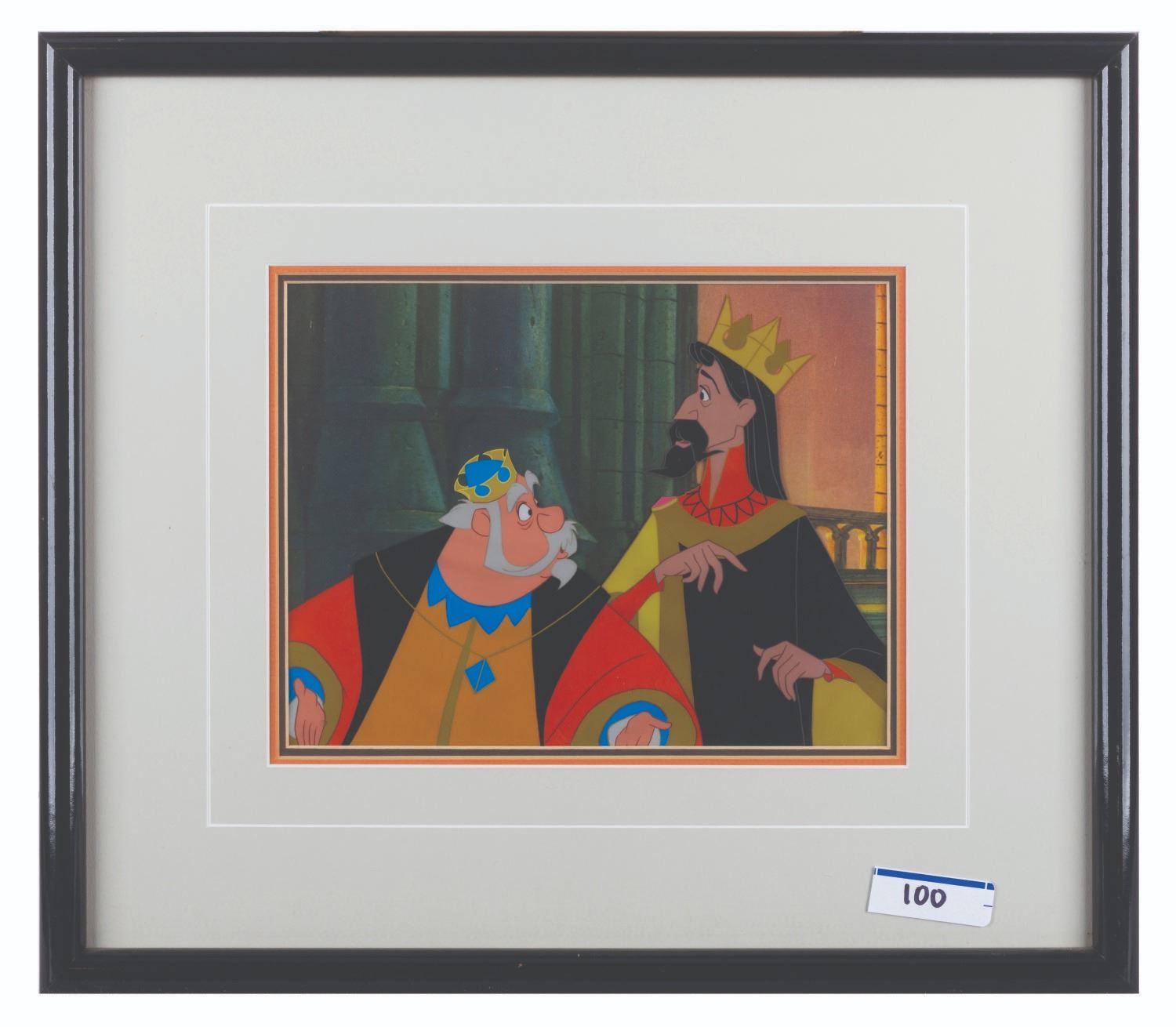 (Disney, 1959) An original production cel of King Hubert and King Stefan from "Sleeping Beauty,” with a color copy background. This cel was sold at the Disneyland Art Corner, and comes with the original Art Corner gold label on the back of the frame. King Hubert and King Stefan have an image size of 6.5” x 8.75” on a 7” x 8.5” visible cel. The entire framed and matted piece measures 14” x 16”. The cel displays in very good condition with light discoloration from pigment loss to Stefan’s left sleeve and chest and light warping from age.
