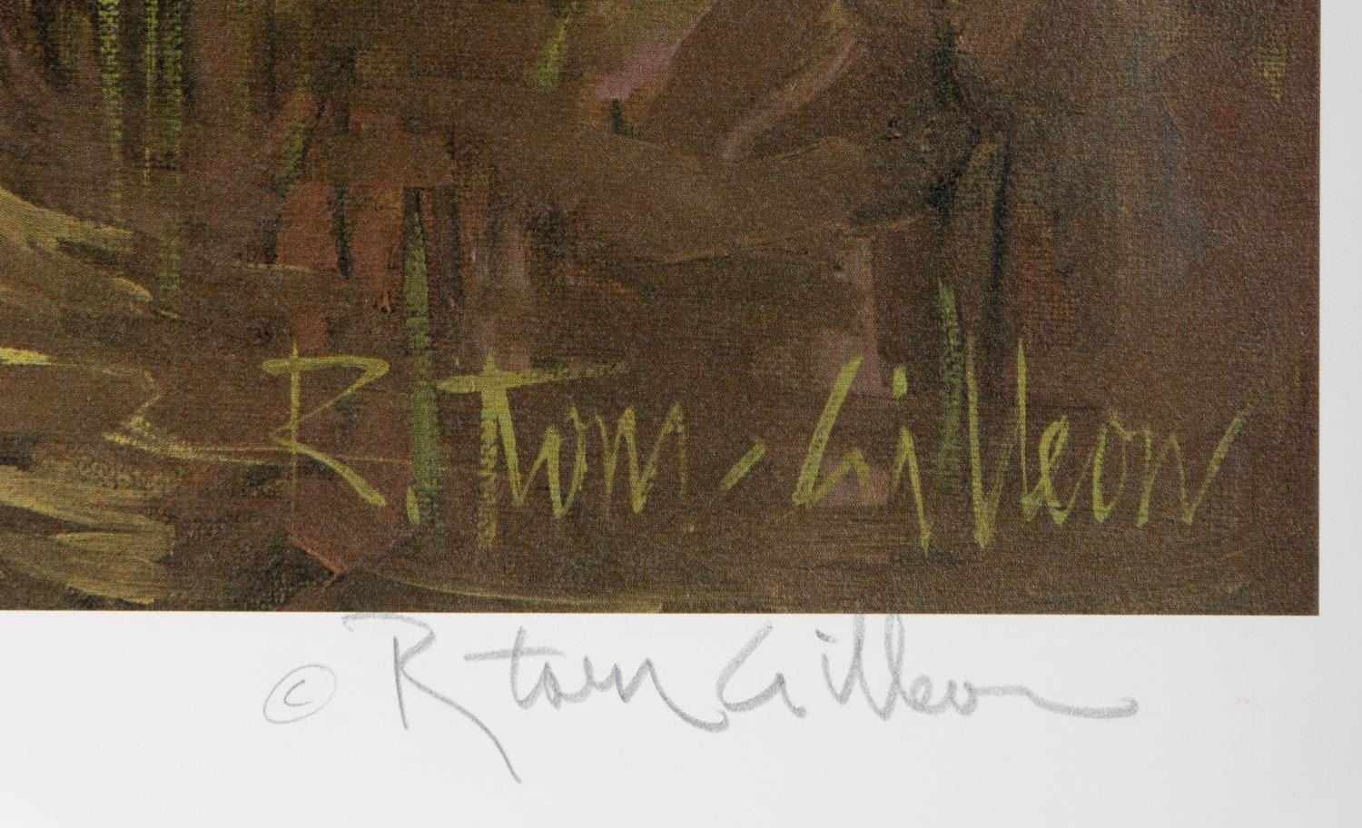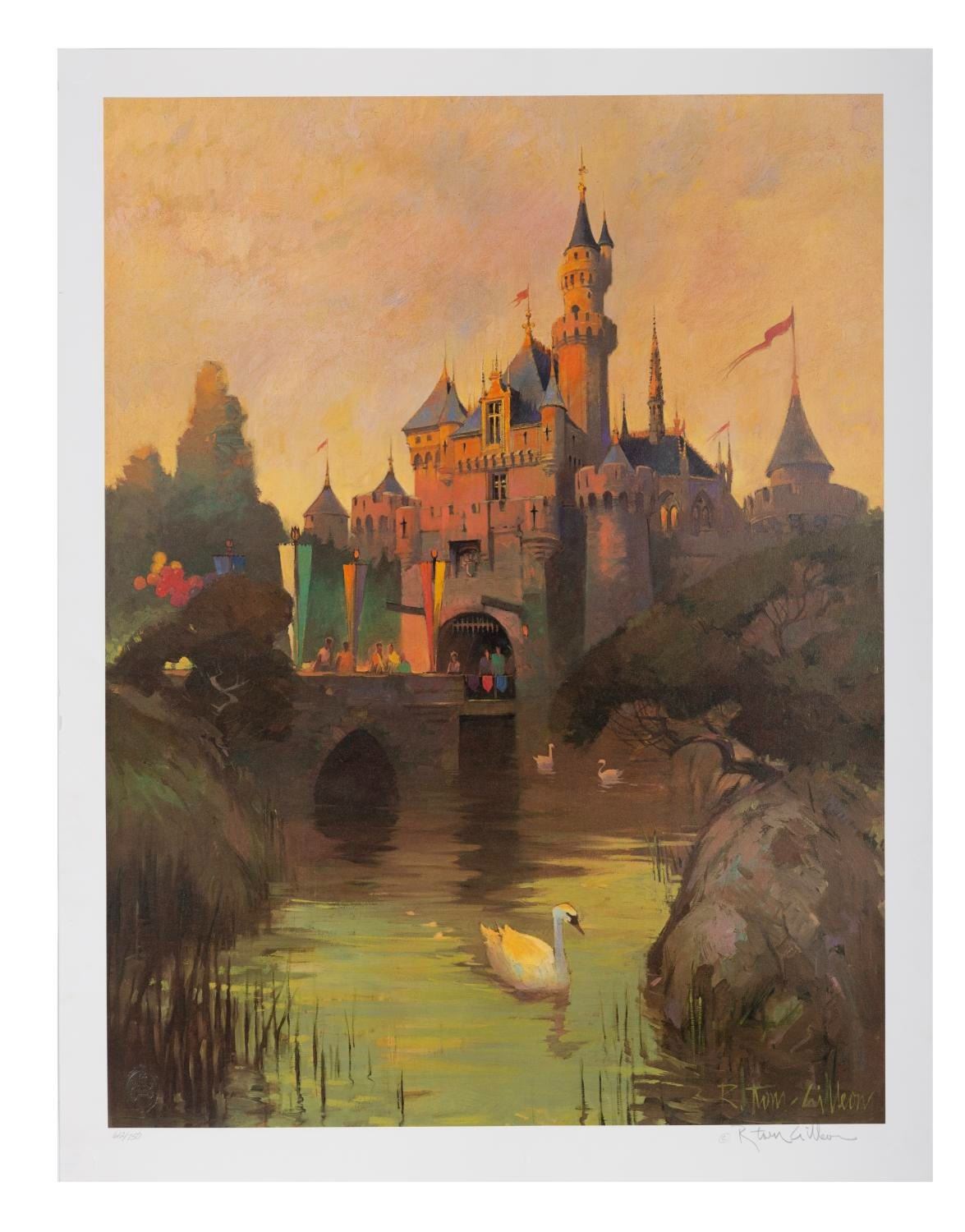 (Disneyland, 1988) A "Sleeping Beauty's Castle at Twilight" print by R. Tom Gilleon. This lithograph numbered "612/750" was released exclusively through the Disney Gallery and has been signed by the artist in pencil. Measuring 27"x35", this limited edition piece is in very good condition exhibiting minor wear to its edges and corners.