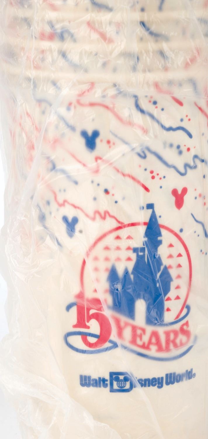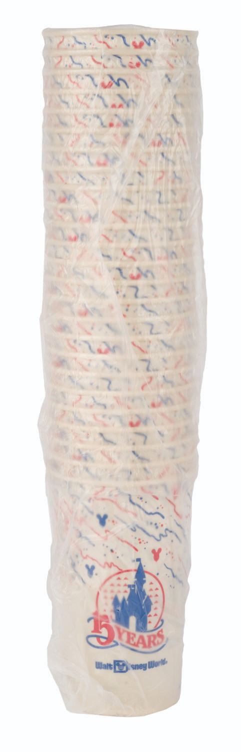 (Walt Disney World, 1986) An unopened sleeve of twenty-five 44 ounce wax paper cups from Walt Disney World's 15th anniversary year. Measuring 4.5" x 19", the stack is in fine unused condition.