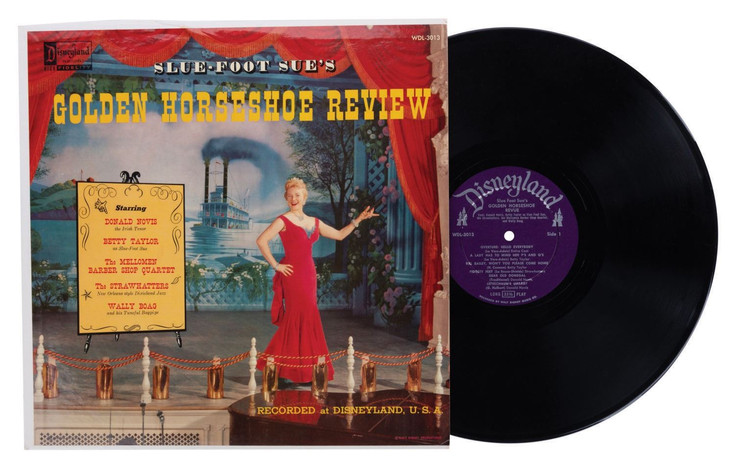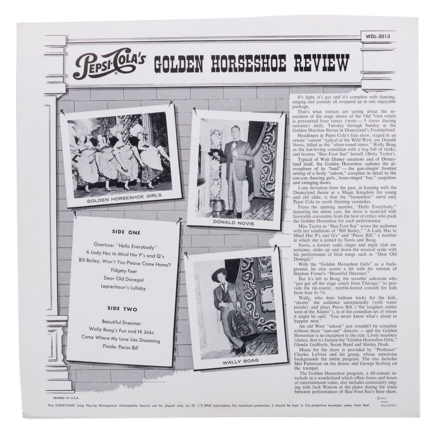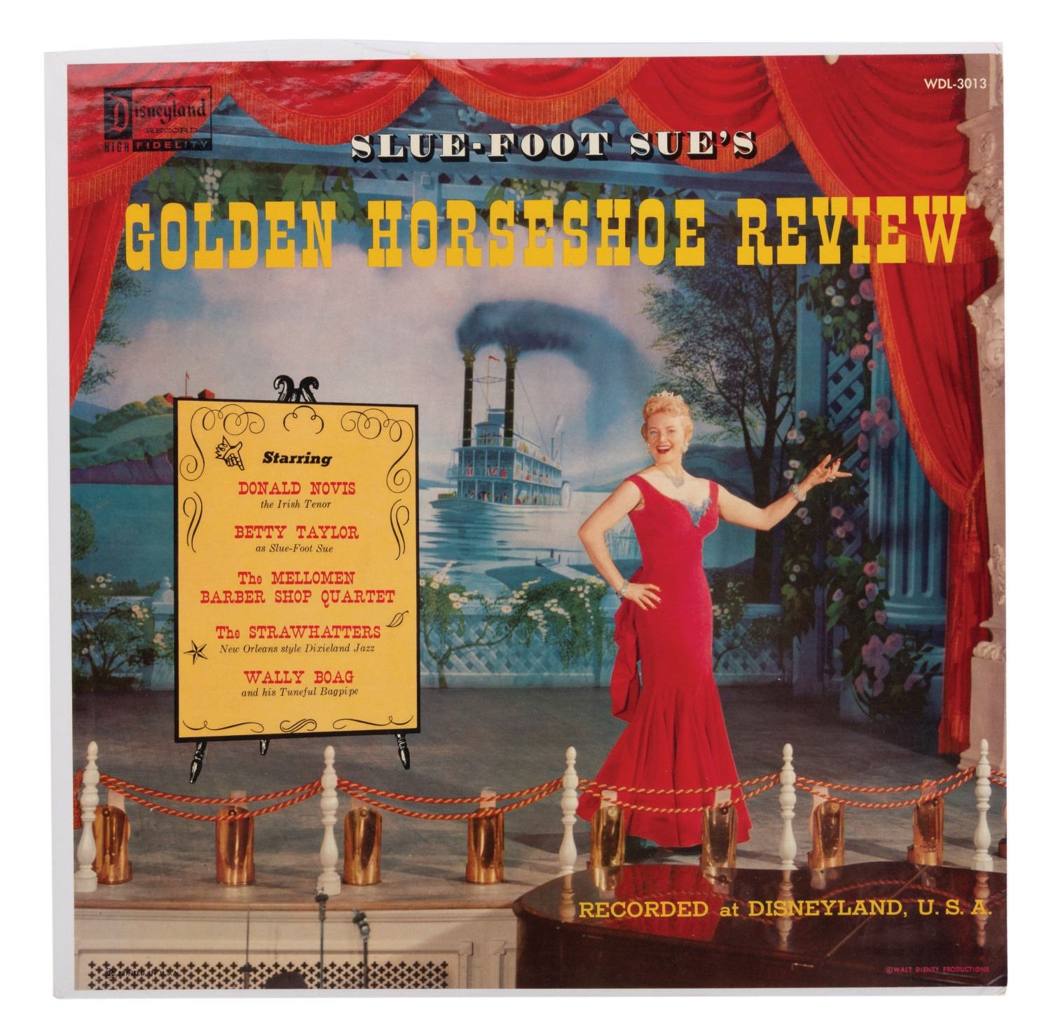 (Disneyland, 1955) A vintage Slue-Foot Sue's Golden Horseshoe Review vinyl LP. The record sleeve features photo imagery of stars Betty Taylor, Donald Novis, Wally Boag, and those fabulous Golden Horseshoe Girls. The album is the official soundtrack to the Disneyland stage show that ran at the Golden Horseshoe Saloon for a world record 39,000+ performances. The 12" 33 1/3rpm record and 12.25"x12.25" sleeve are in very good condition with light surface wear to edges and corners of the sleeve.
