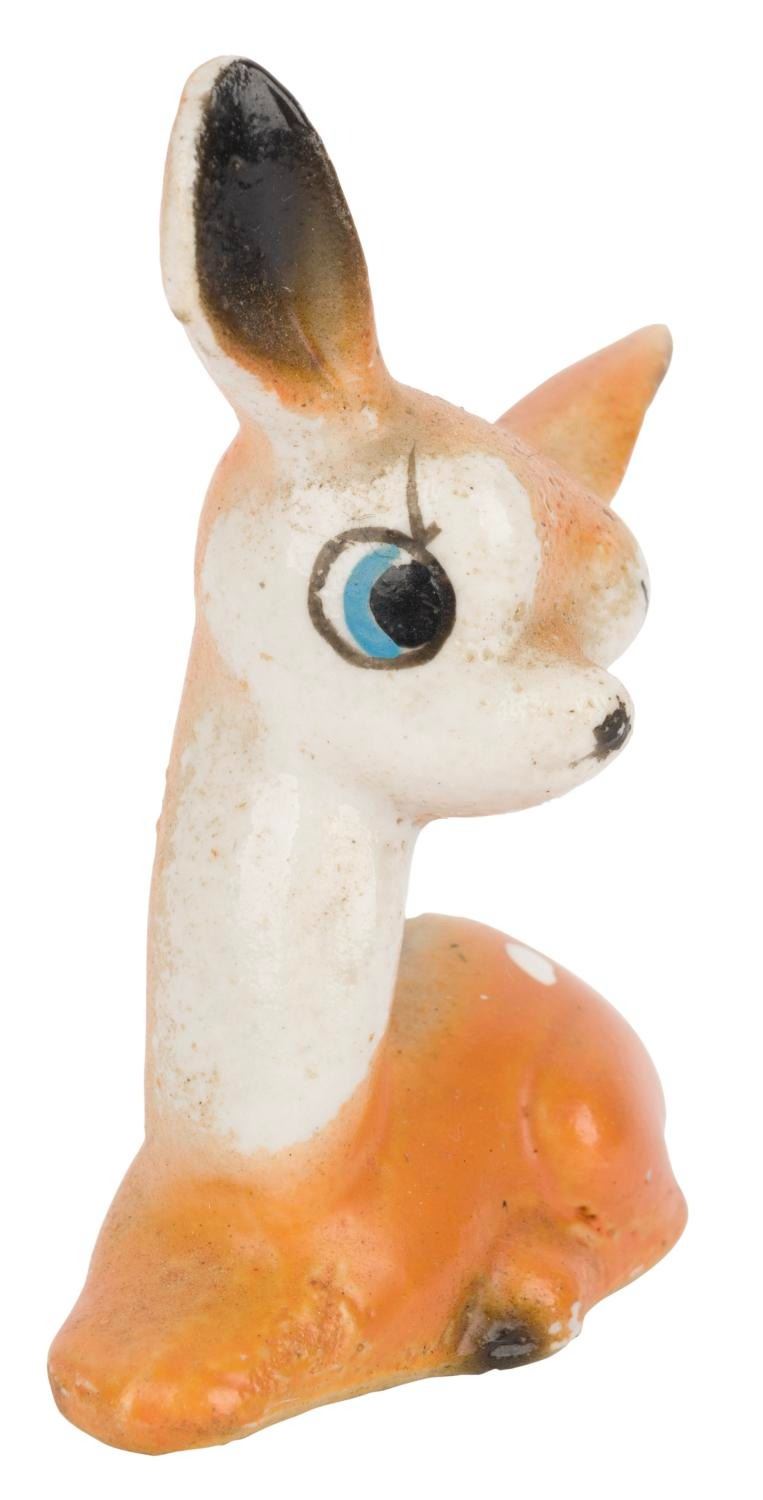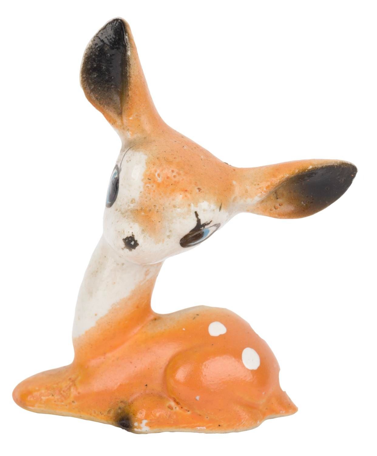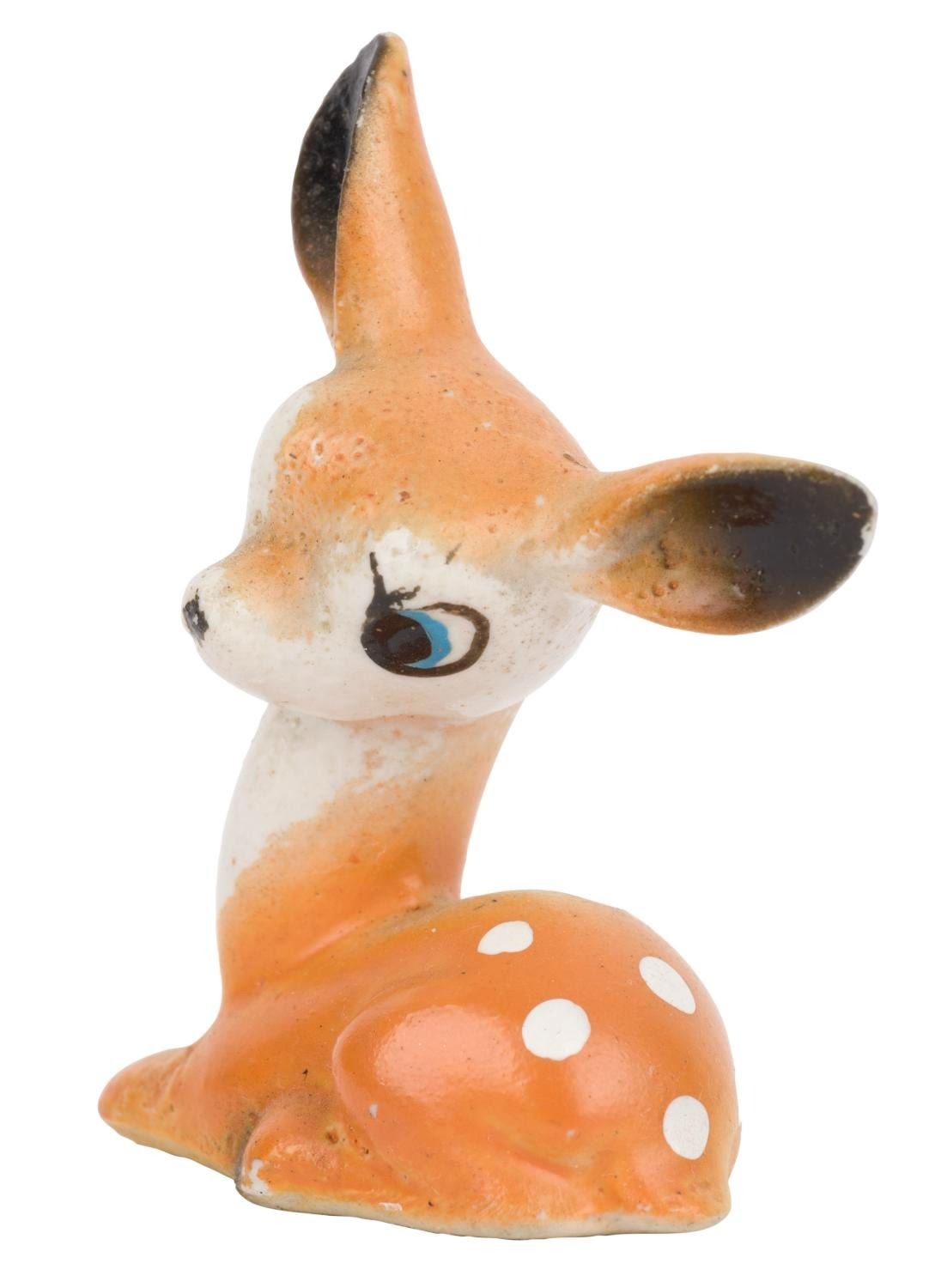 (Disney, 1950s-60s) A small ceramic figurine of Bambi, possibly unlicensed. Standing 2.25" high, the figurine is in very good condition with light wear from age.