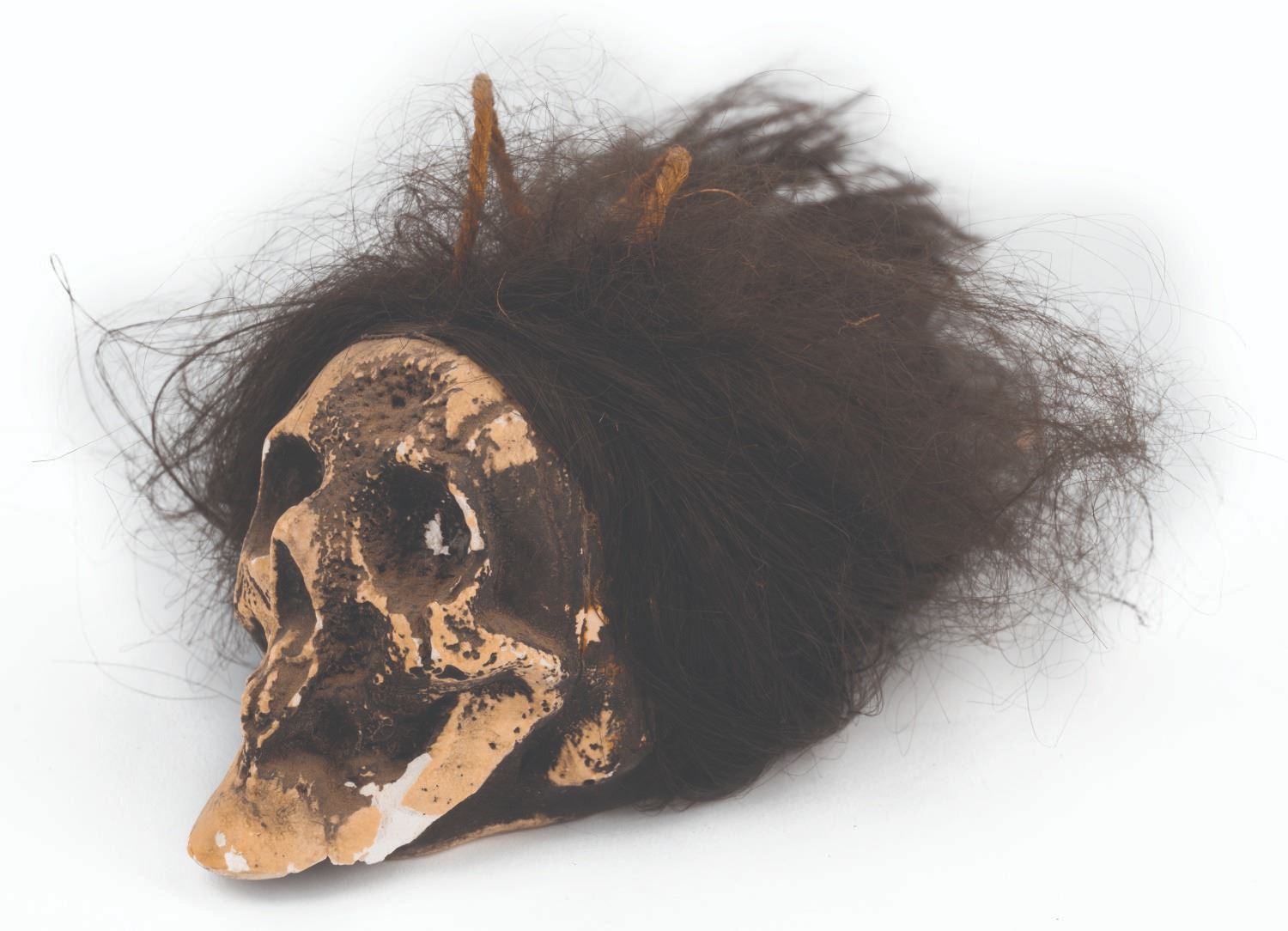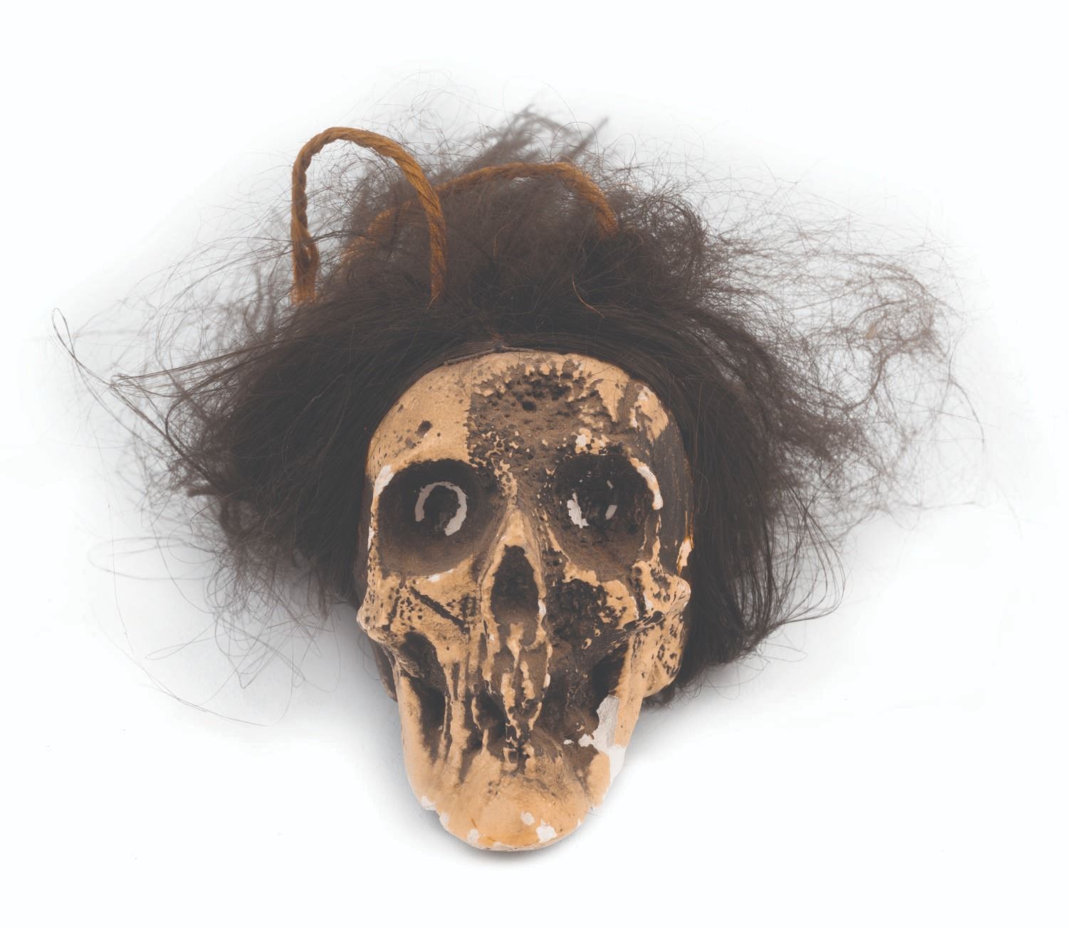 (Disneyland, 1960s-70s) A small glow-in-the-dark Voodoo Skull by Randotti. Souvenir skulls by Randotti were among the popular merchandise once offered in Adventureland at Disneyland. This vintage resin skull has a twine rope for hanging. Measuring 3.75"x4.75", the decorative souvenir is in good condition, retaining an original Disneyland merchandise price label, and exhibiting wear to its hair and several chips to the jaw, eyes, and throughout.
