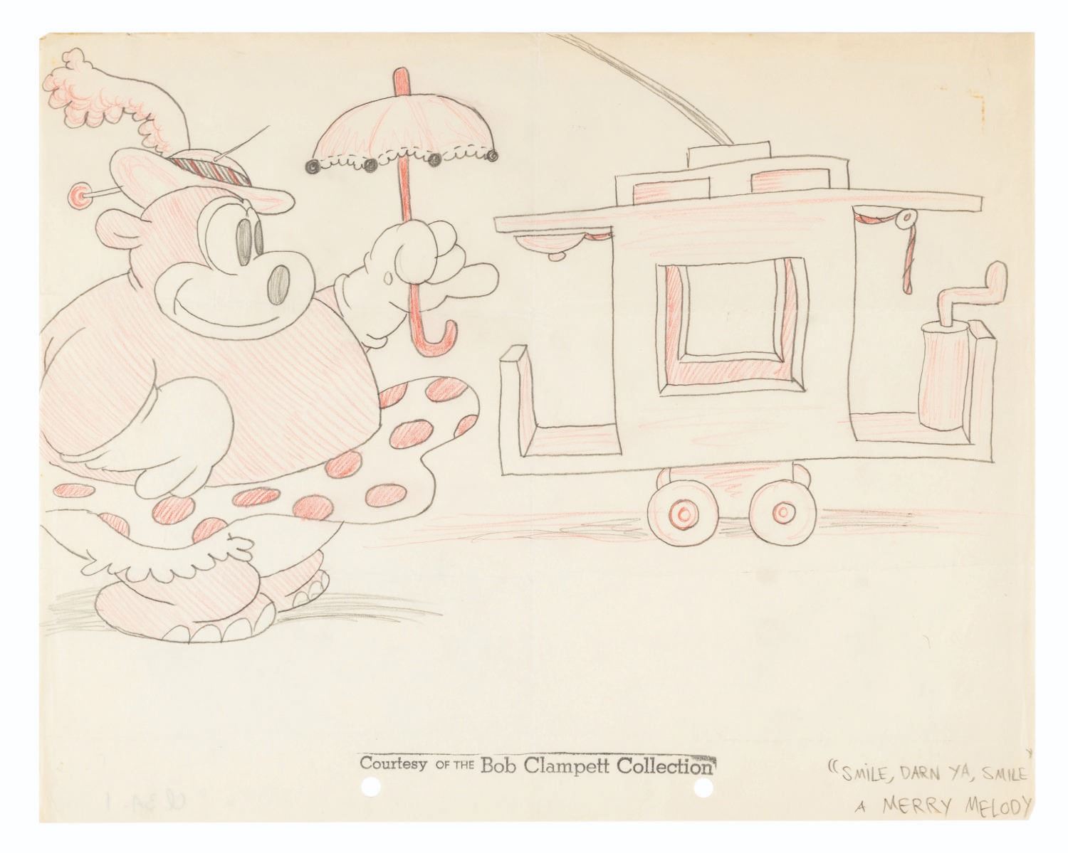 (Harman-Ising, 1931) An original layout drawing from the Merrie Melodies short, “Smile, Darn Ya, Smile.” Measuring 9.5” x 12” with an image size of 7” x 11.5”, the graphite and colored pencil drawing is in good condition with light edge wear, three horizontal creases and one vertical crease from being folded into eighths, and light discoloration from age. The drawing has been stamped “Courtesy of the Bob Clampett Collection.”