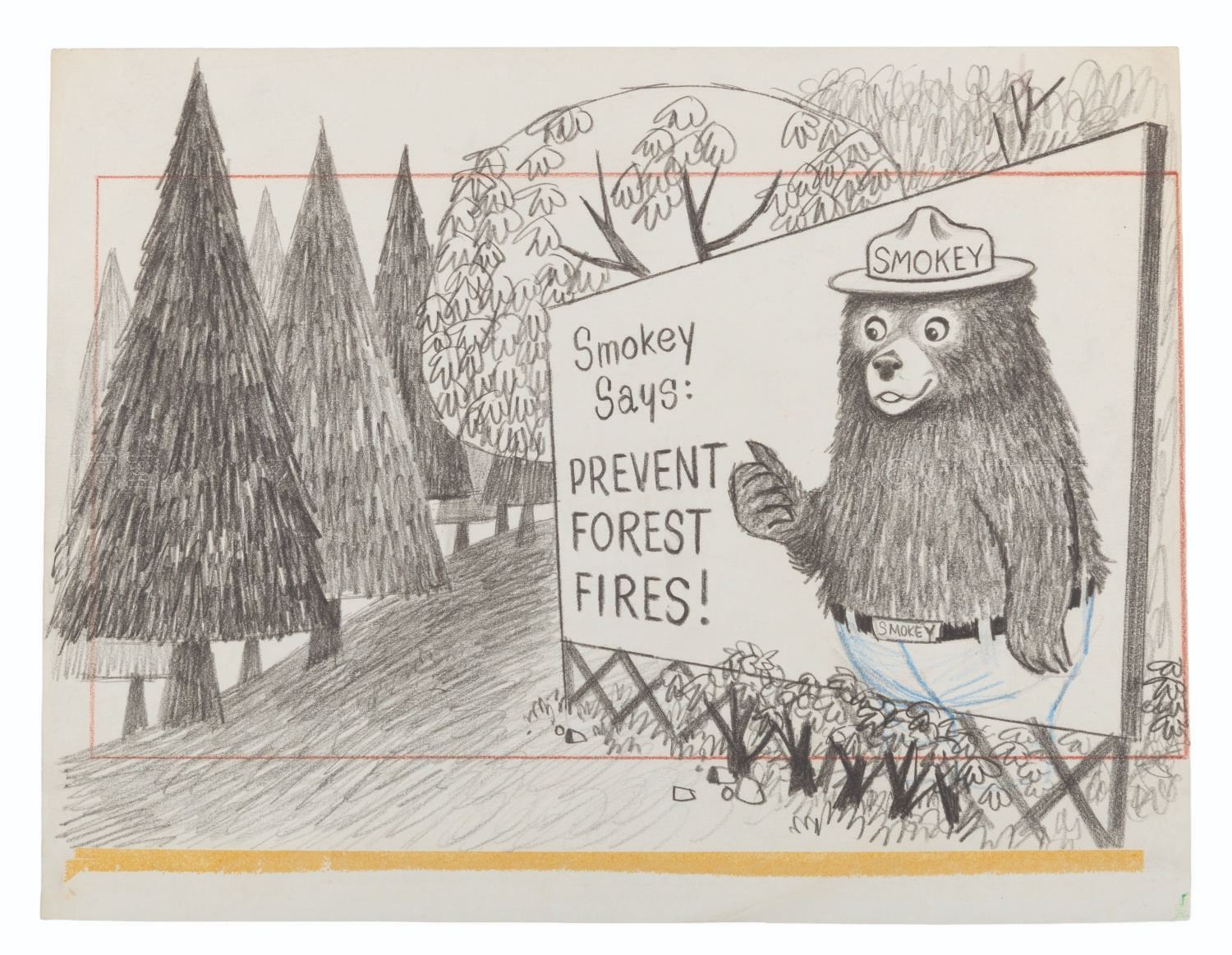 (1960s-80s) An original hand-drawn layout drawing of Smokey the Bear for a public service announcement. Measuring 9.5" x 12.5" the graphite drawing is in good condition with light discoloration, soiling, and edge wear.