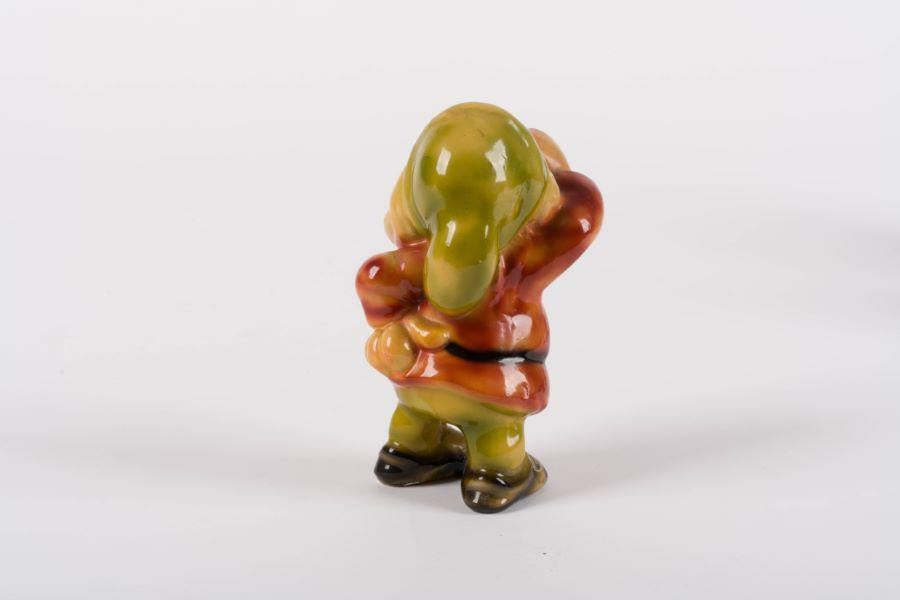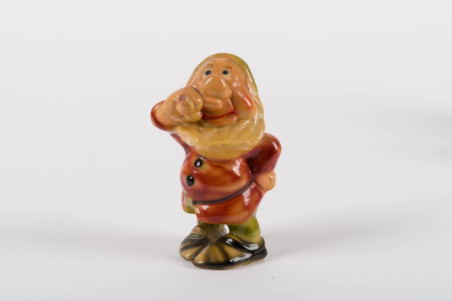 (Galligani, 1930s-40s) A ceramic figurine of Sneezy from Walt Disney’s"Snow White and the Seven Dwarfs," manufactured by Galligani of Norway. Measuring 3" x 3.25" and 5.5" tall, the figurine is in very good condition with some light wear and worn-down areas in the glaze.