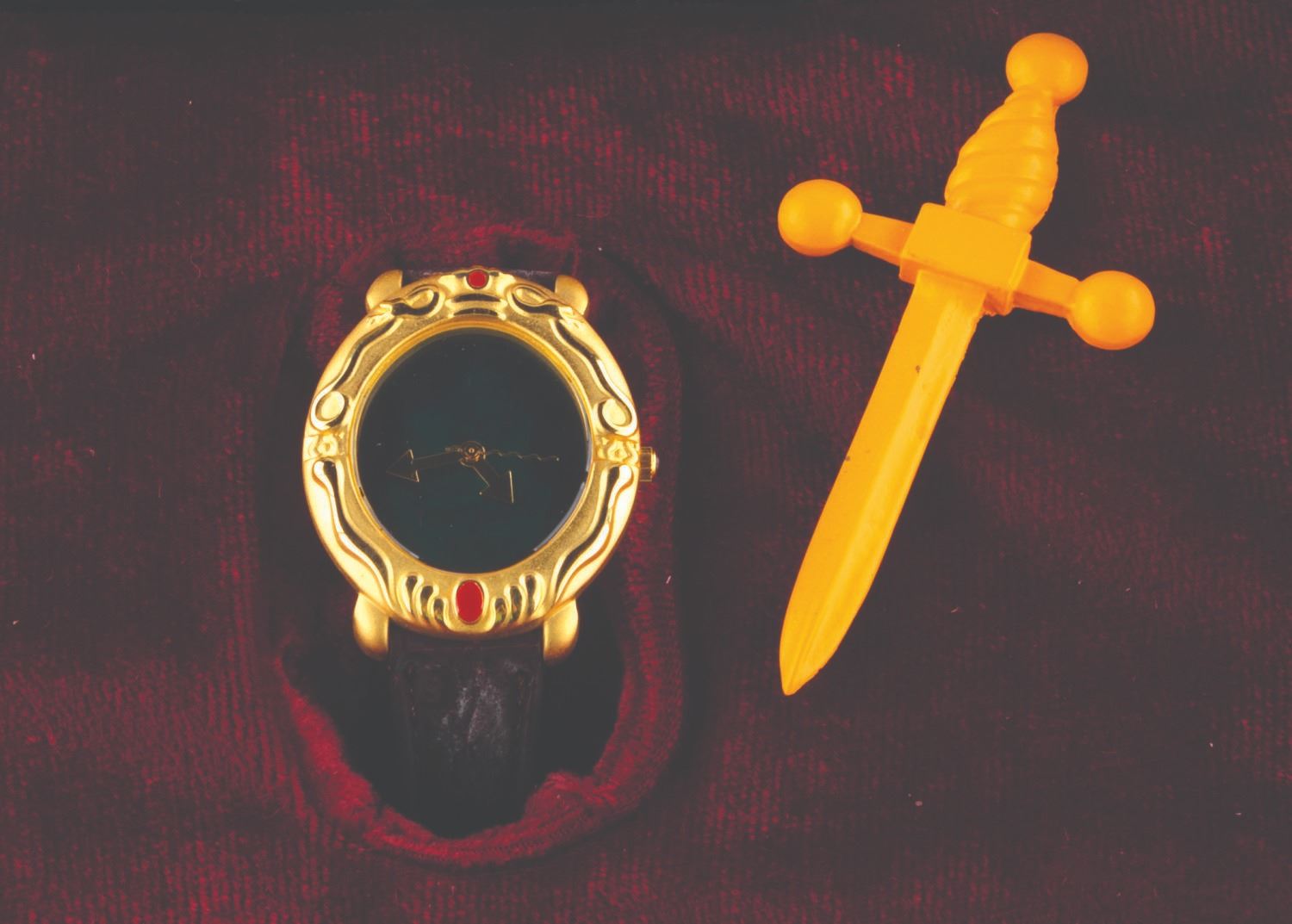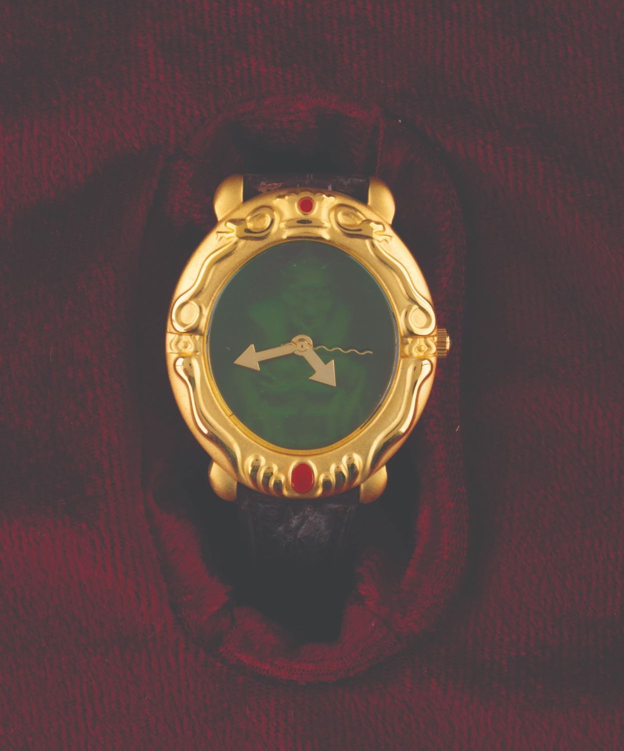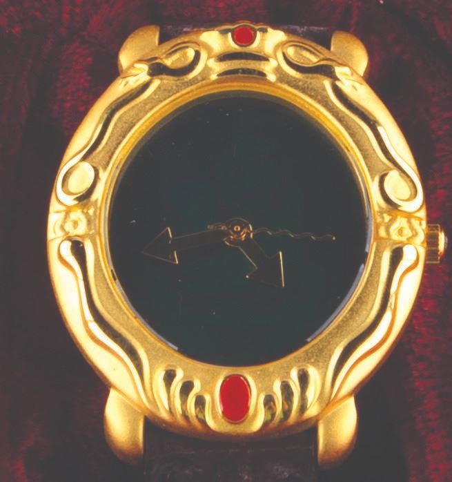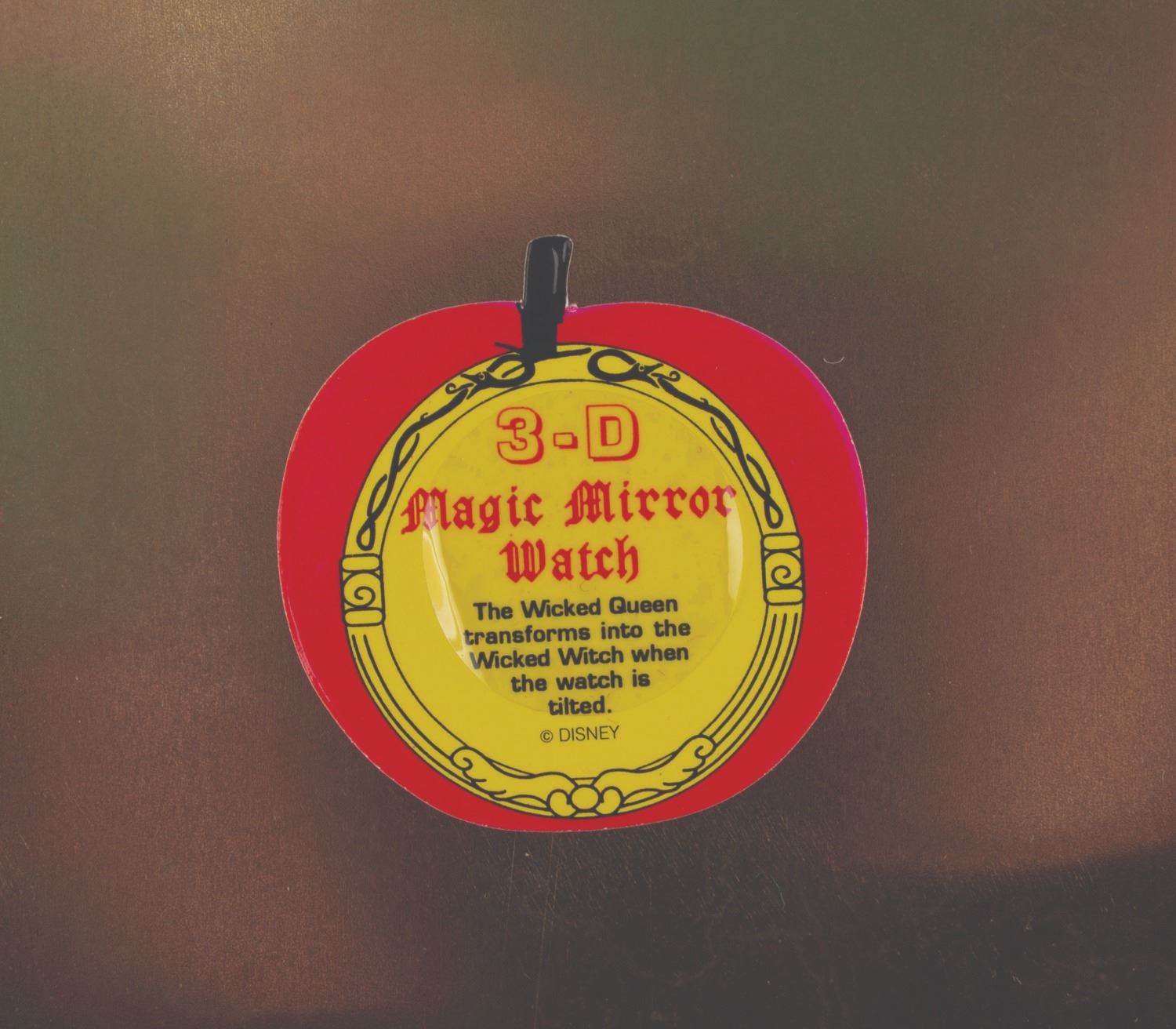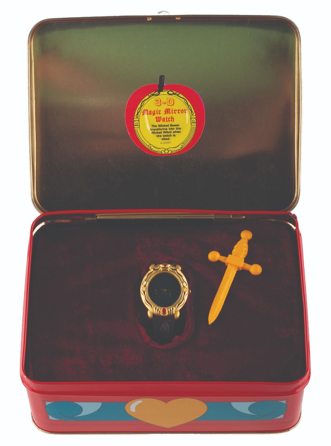 (Disney Store, 1993) A 3-D Magic Mirror watch of the Magic Mirror from "Snow White and the Seven Dwarfs, " presented in a tin shaped as her "Bring back her heart box " from the film. A hologram on the face changes between the beautiful Queen and her alter ego, the Hag. The watch and tin are in very good condition, with the watch requiring a battery and possibly service to function. The original band has deteriorated with age, suitable for display in the tin but requiring replacement to wear.