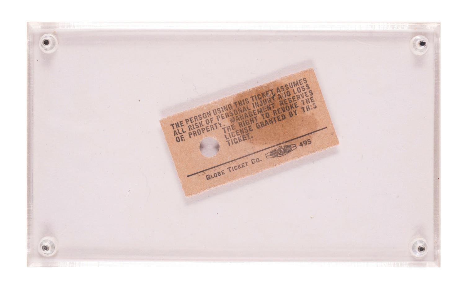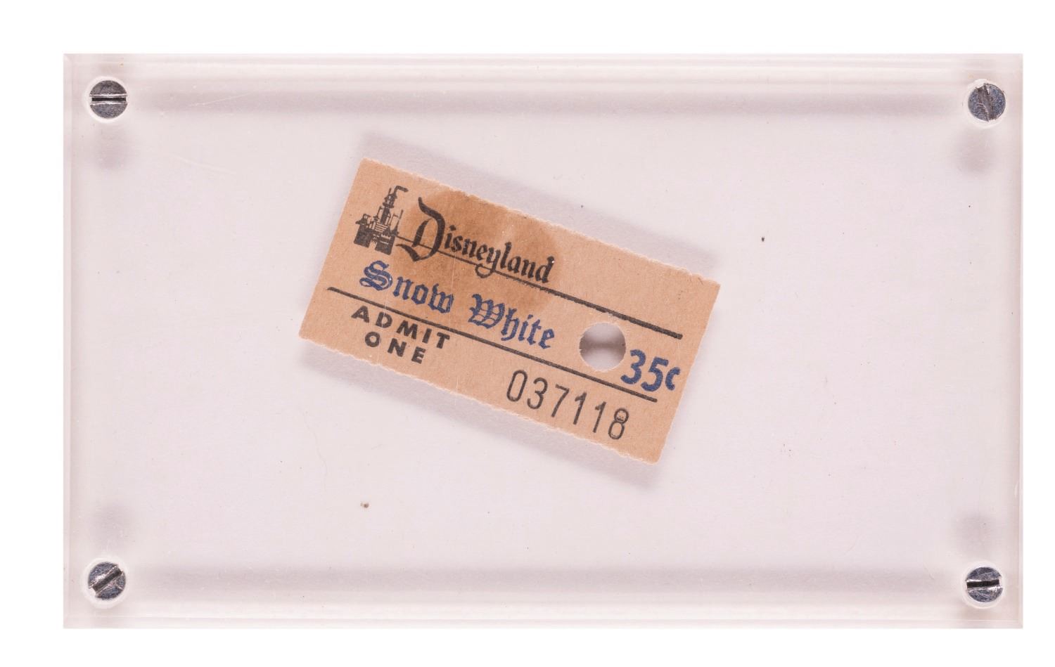(Disneyland, 1950s) A rare ticket booth ticket for the Snow White attraction at Disneyland. This mid-to-late 1950s globe admission ticket has admission value of 35 cents, was purchased from a booth in Fantasyland and is a rare piece of early Disneyland ephemera. Measuring 2"x1", the ticket is in good condition, with a spot of discoloration and wear from handling and age.