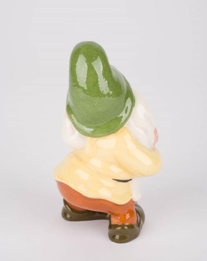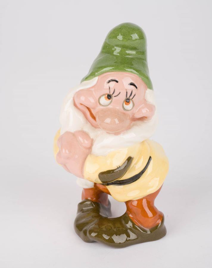 (Shaw, 1946) A painted and glazed ceramic figurine of Bashful from"Snow White and the Seven Dwarfs" manufactured by Evan K. Shaw. Measuring 3.5" x 3.5" and 6" tall, the figurine is in very good condition with crazing throughout.