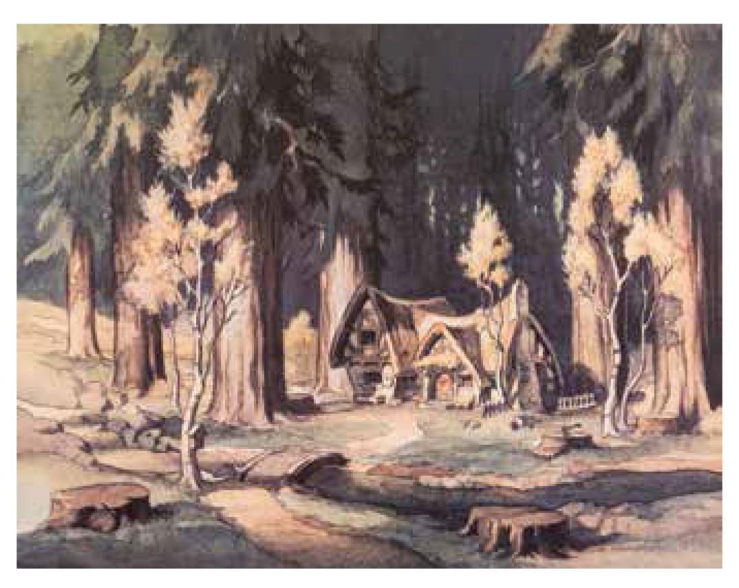 (Disneyland, 2000s) A print of the Dwarf's Cottage, framed for display at the Disneyland Resort. Used at the Grand Californian Hotel at Disneyland Resort, the piece has a 18.5"x14.5" mat opening within its 31"x27" wooden frame, displaying in very good condition, exhibiting wear to the frame from original display.