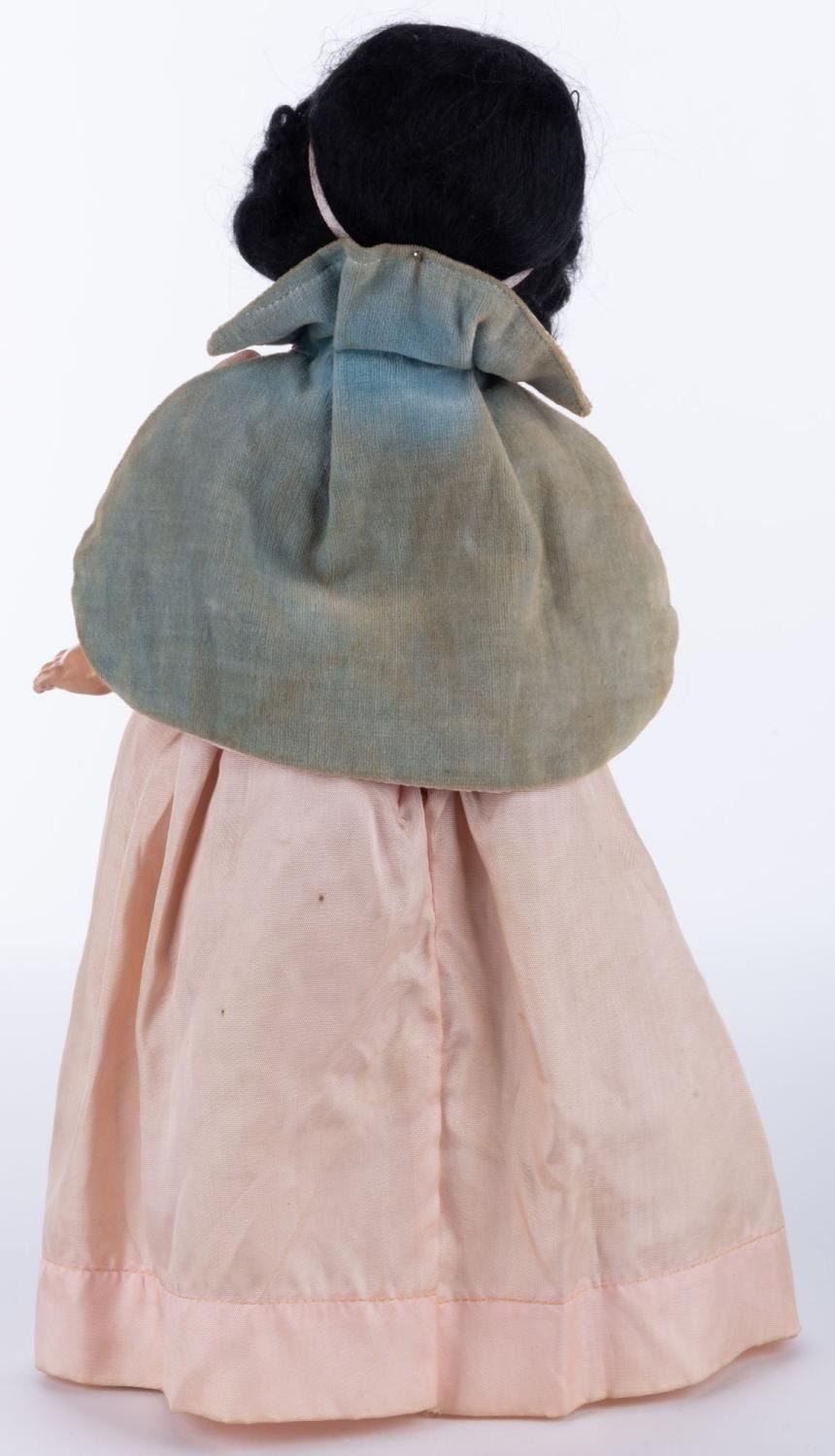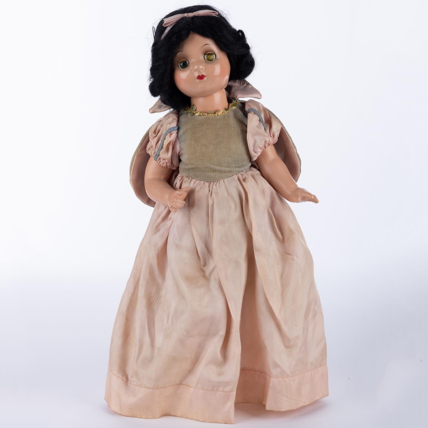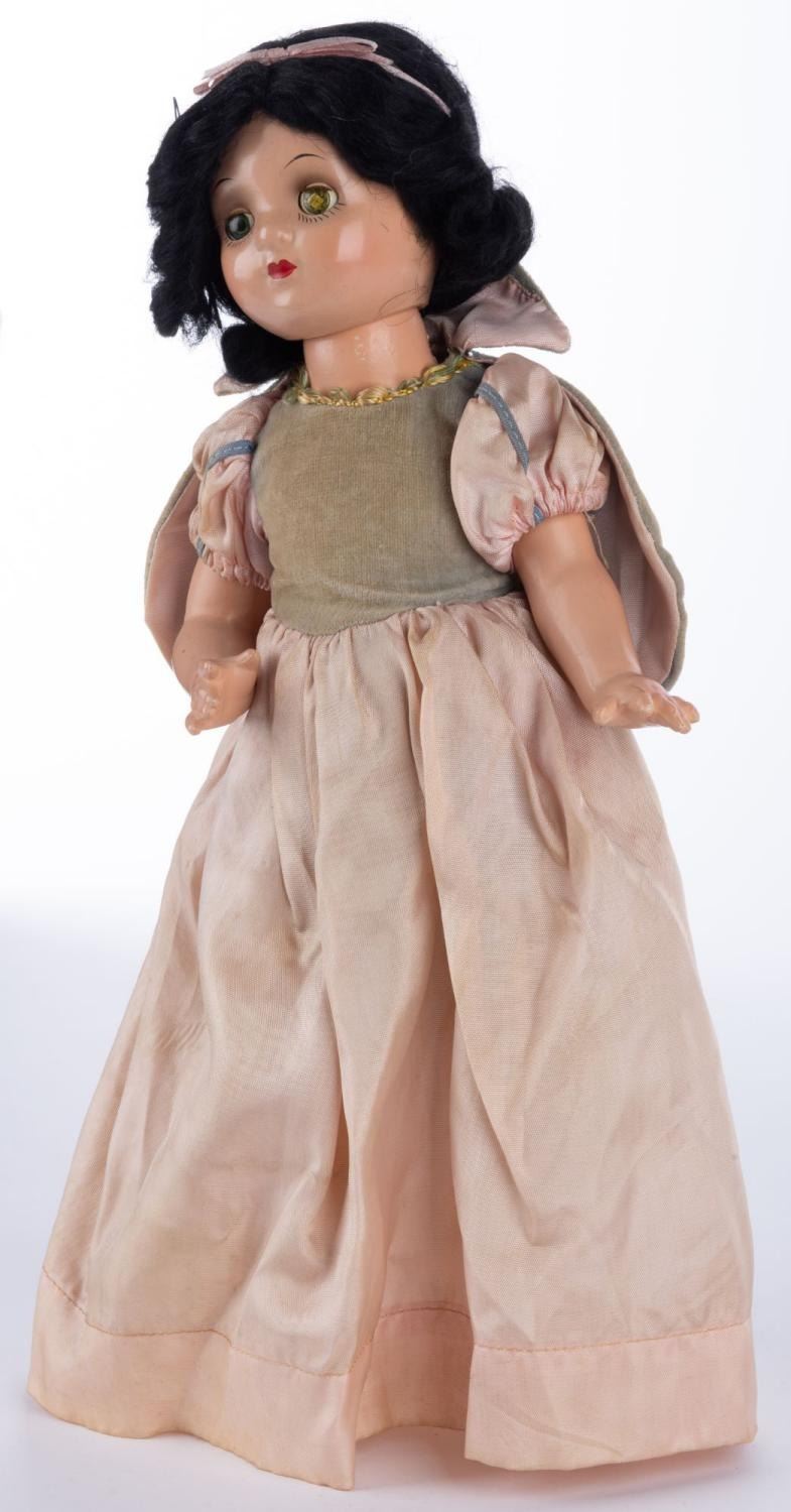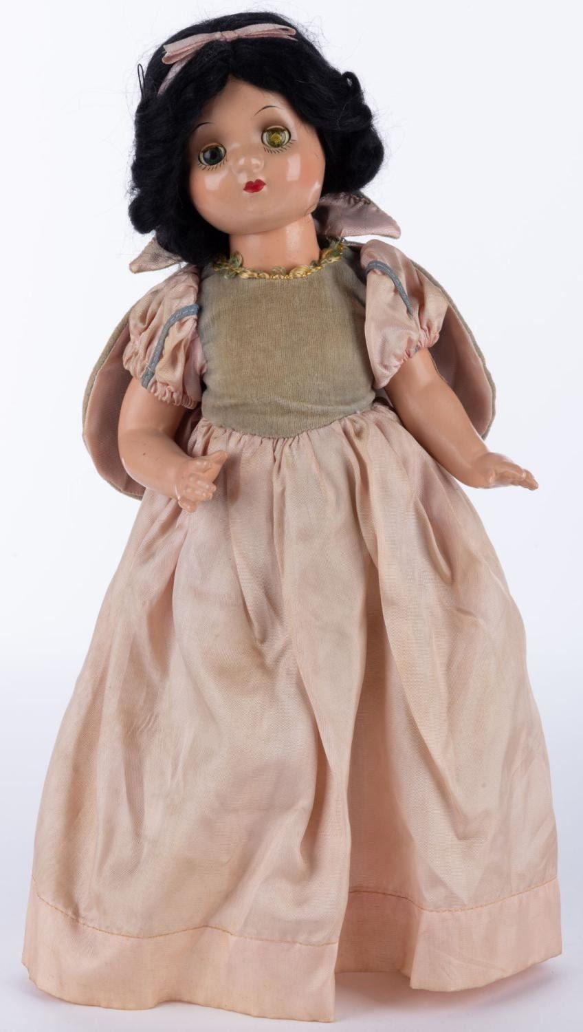 (Knickerbocker, 1938) A Snow White doll by Knickerbocker Toy Company featuring a taffeta dress and cape with velveteen accents, a mohair wig, and blinking glass eyes. Measuring 15" in length, the doll is in good condition with visible fading, staining, and discoloration to the fabric elements, paint wear on the face, minor deterioration to the mohair wig and eyelashes, and damage to the left eye.