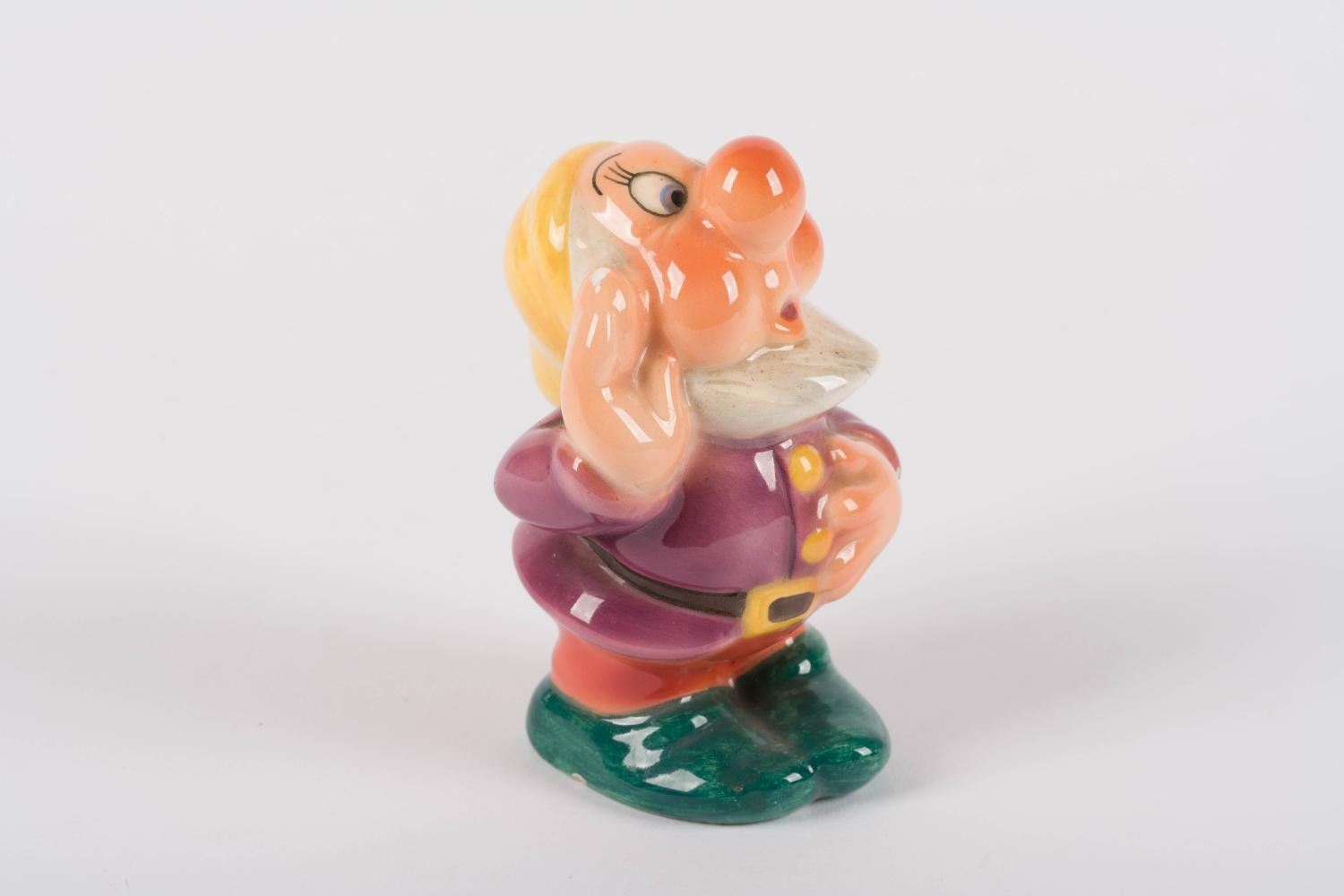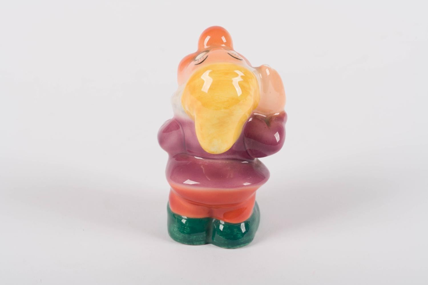 (Zaccagnini, 1940s) A ceramic figurine of Sneezy from "Snow White and the Seven Dwarfs." Zaccagnini figures are praised for their stylistic interpretations of characters and vibrant colors. Figures by Zaccagnini are rare finds. Measuring 2.25" x 2" x 3.75" tall, the figure is in very good condition with a chip to the paint on the left wrist and right hand.
