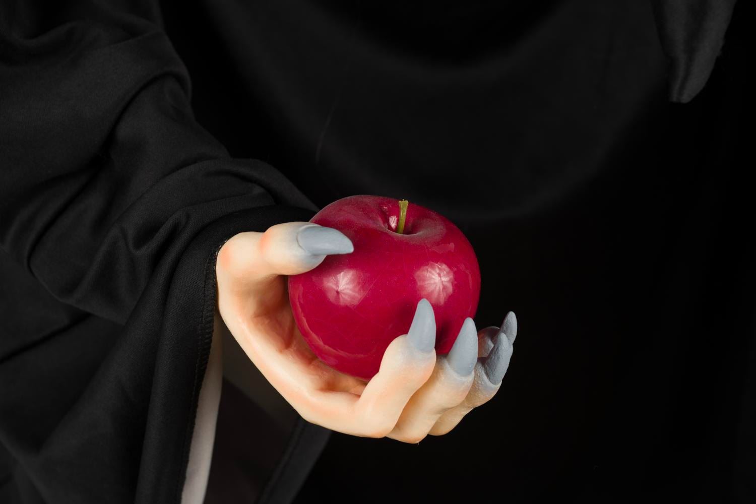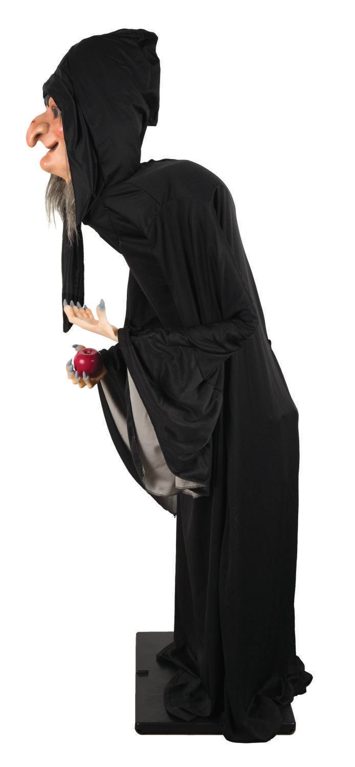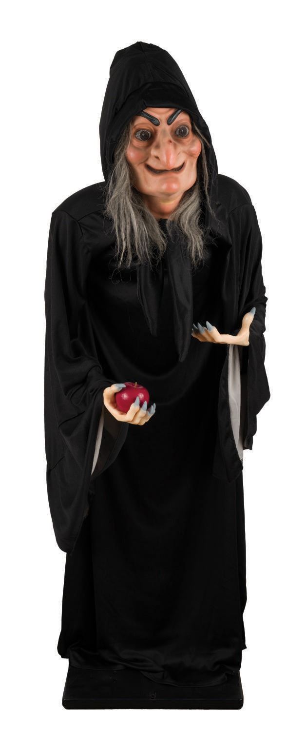 (Disneyland, 2010s-20s) A Witch Disney Parks Character Head inspired by Walt Disney's Snow White and the Seven Dwarfs. Character Heads of this type have been seen most recently during Disneyland After Dark Villains Nite at Disneyland Resort in 2022. The Character Head has been mounted for display atop a custom frame featuring hands with poisoned apple and animation. Frame included the piece measures approximately 63" tall, 25.5" at its widest points, atop a base measuring 18"x15". The entire piece requires a 240 Volt AC adapter (included) and source, and displays in fine working condition, while the Character Head is in very good condition, exhibiting slight wear from Park use.