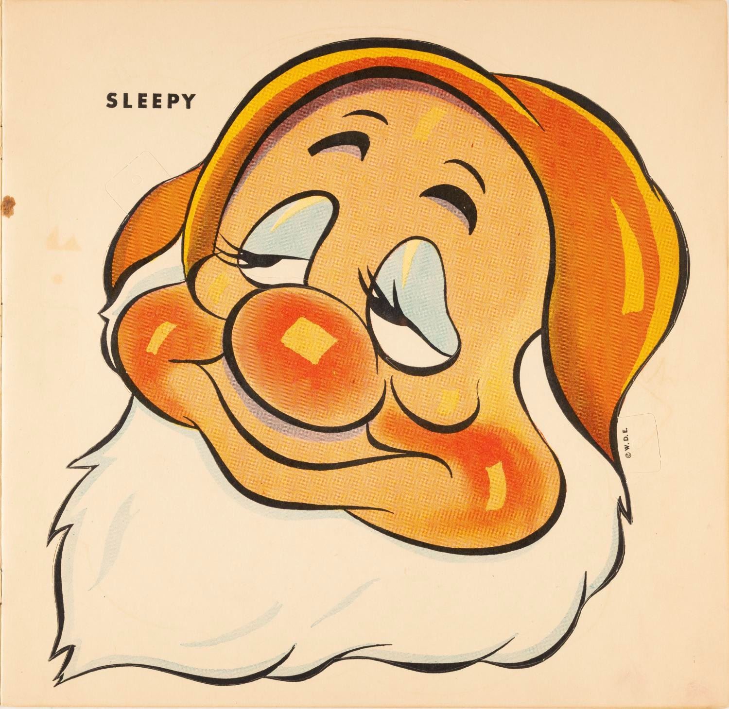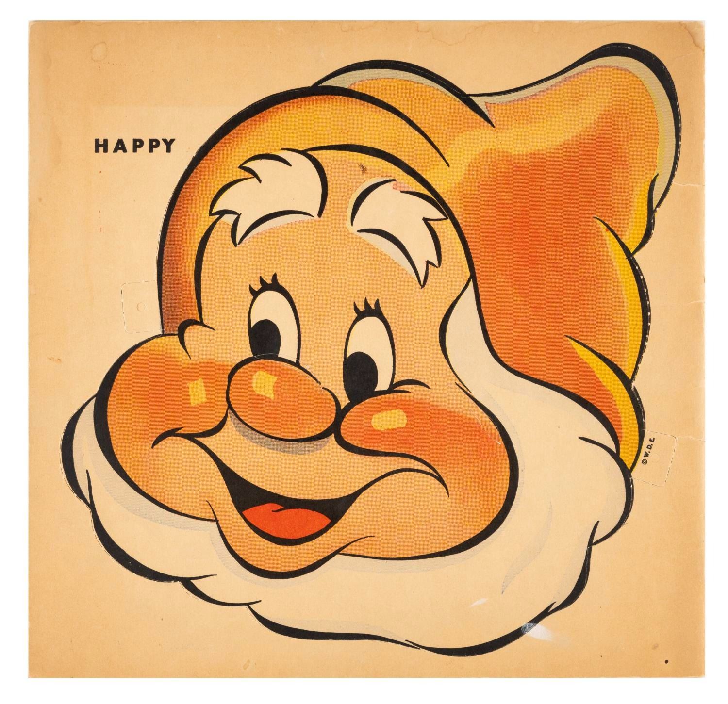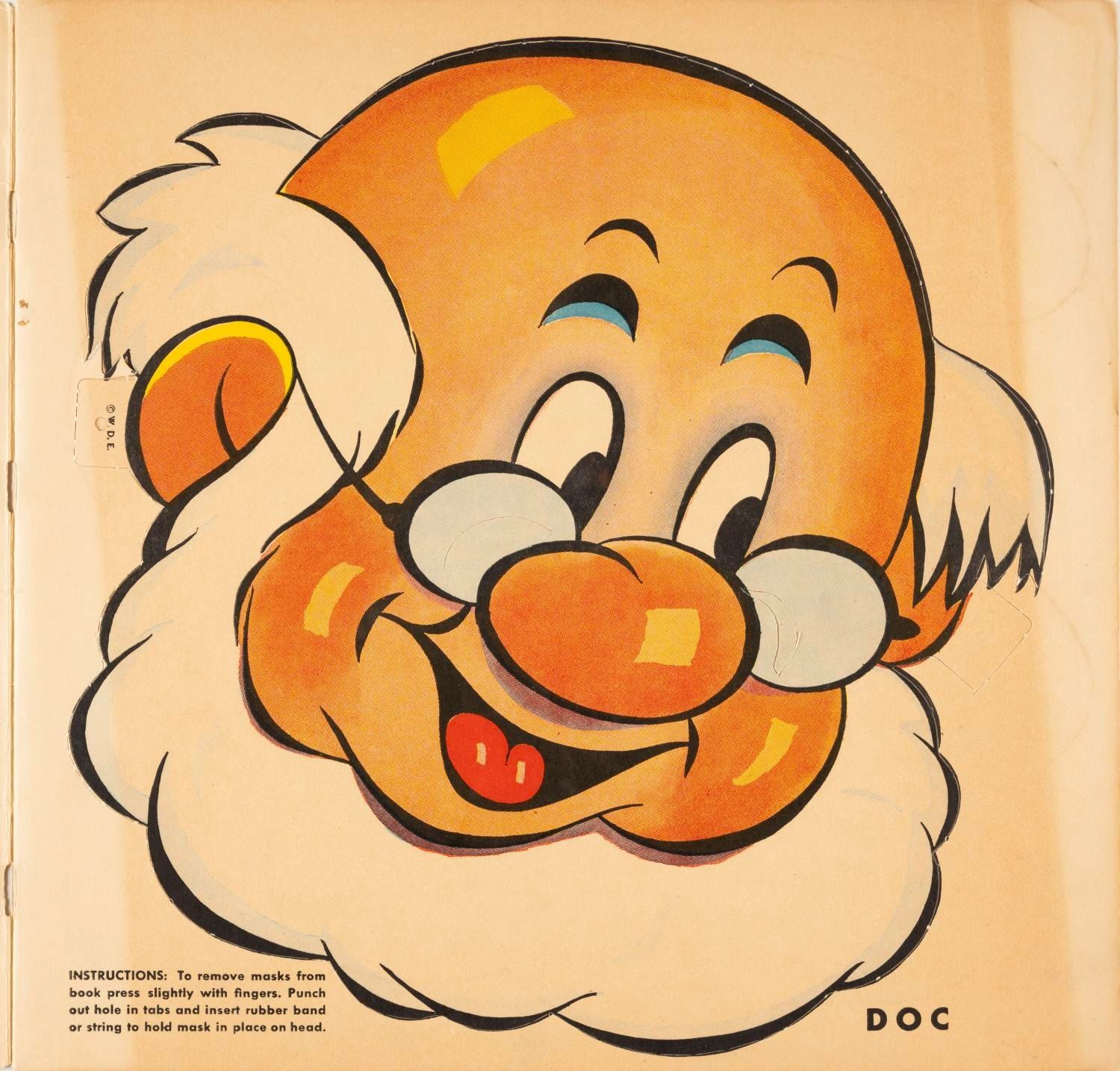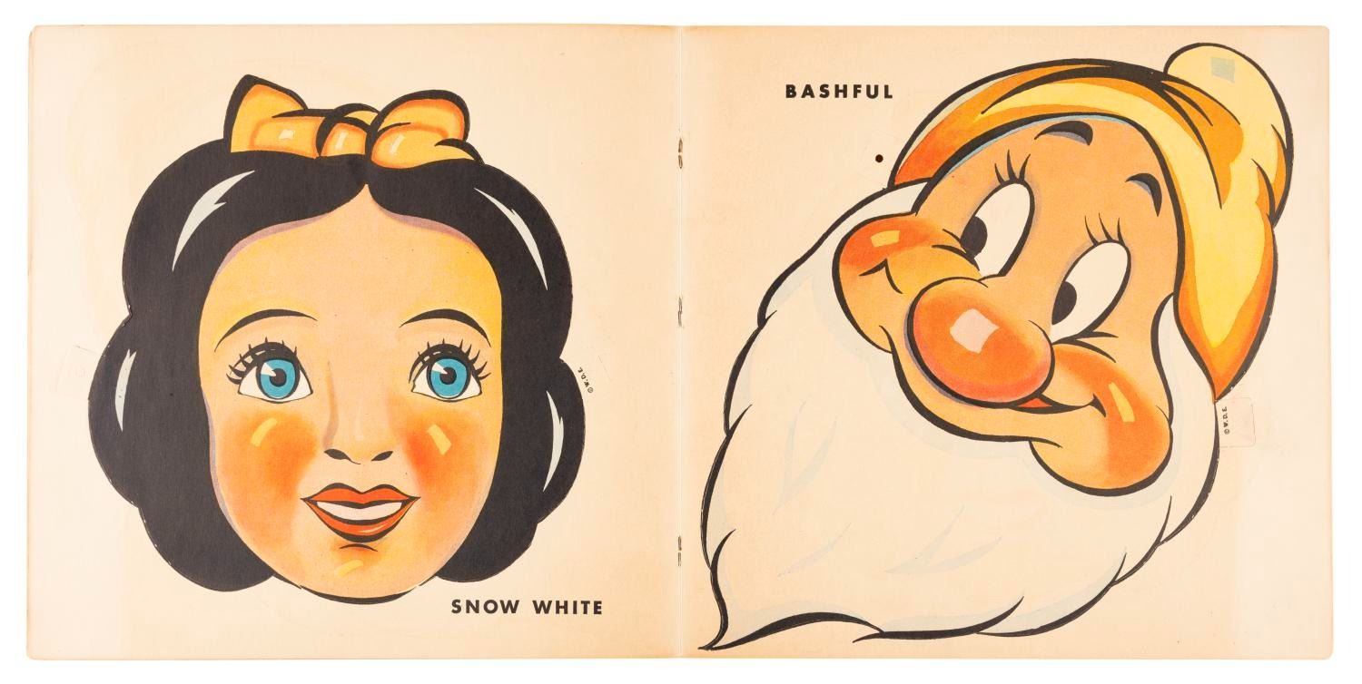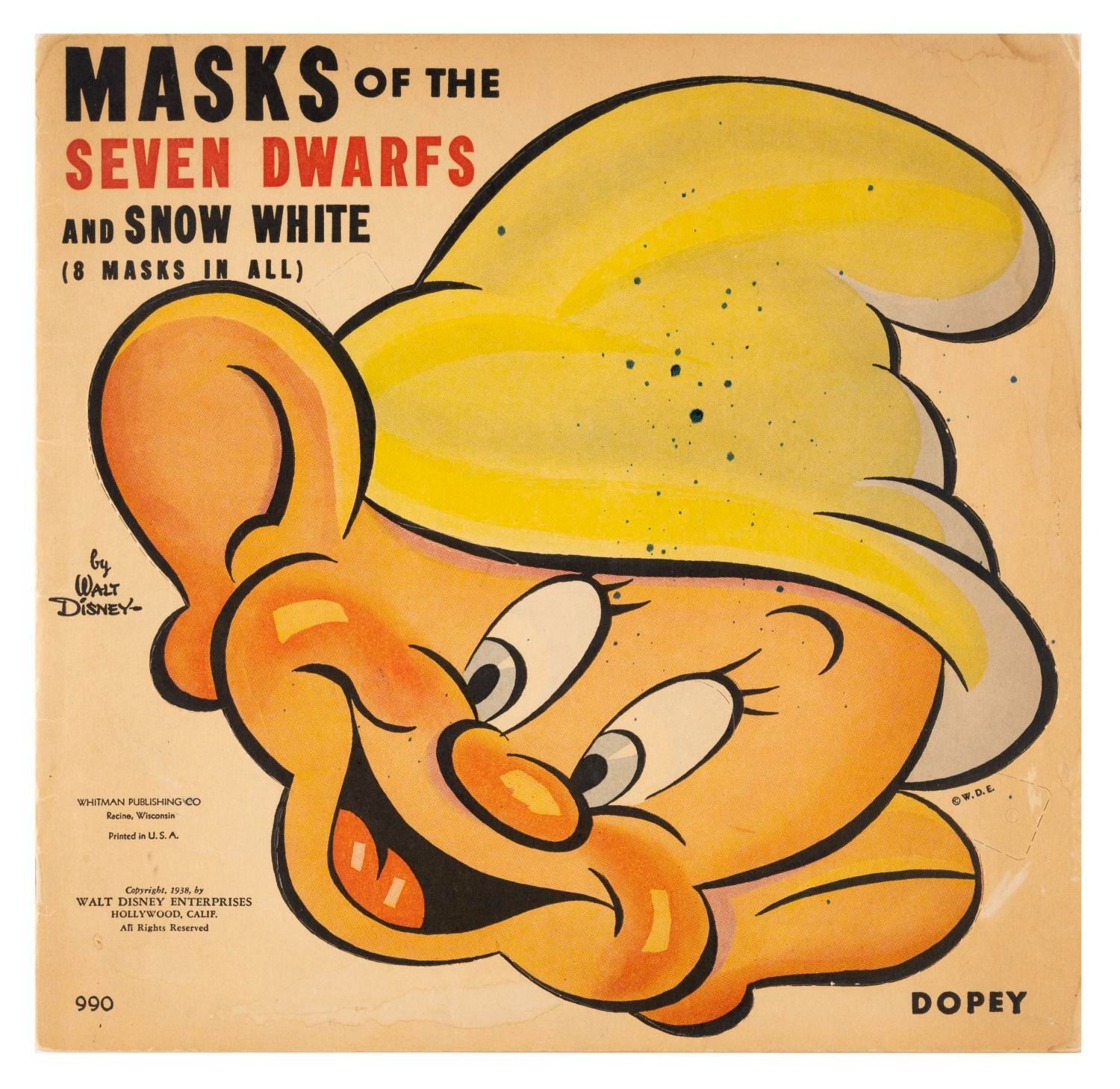 (Disney, 1938) An early book of “Snow White and the Seven Dwarfs” full-color paper masks. Each Dwarf and Snow White mask can be punched out of the page along the perforation along the contour. Measuring 10.5” x 10.75” the book is in good condition with ink stains on the cover, water stains along the front and back cover, and stains on the page with the “Sleepy” mask that do not affect the image, some masks are partially detached from the perforation, separation at the binding staple, two 0.5” tears along the right edge of the back cover, and discoloration from age.