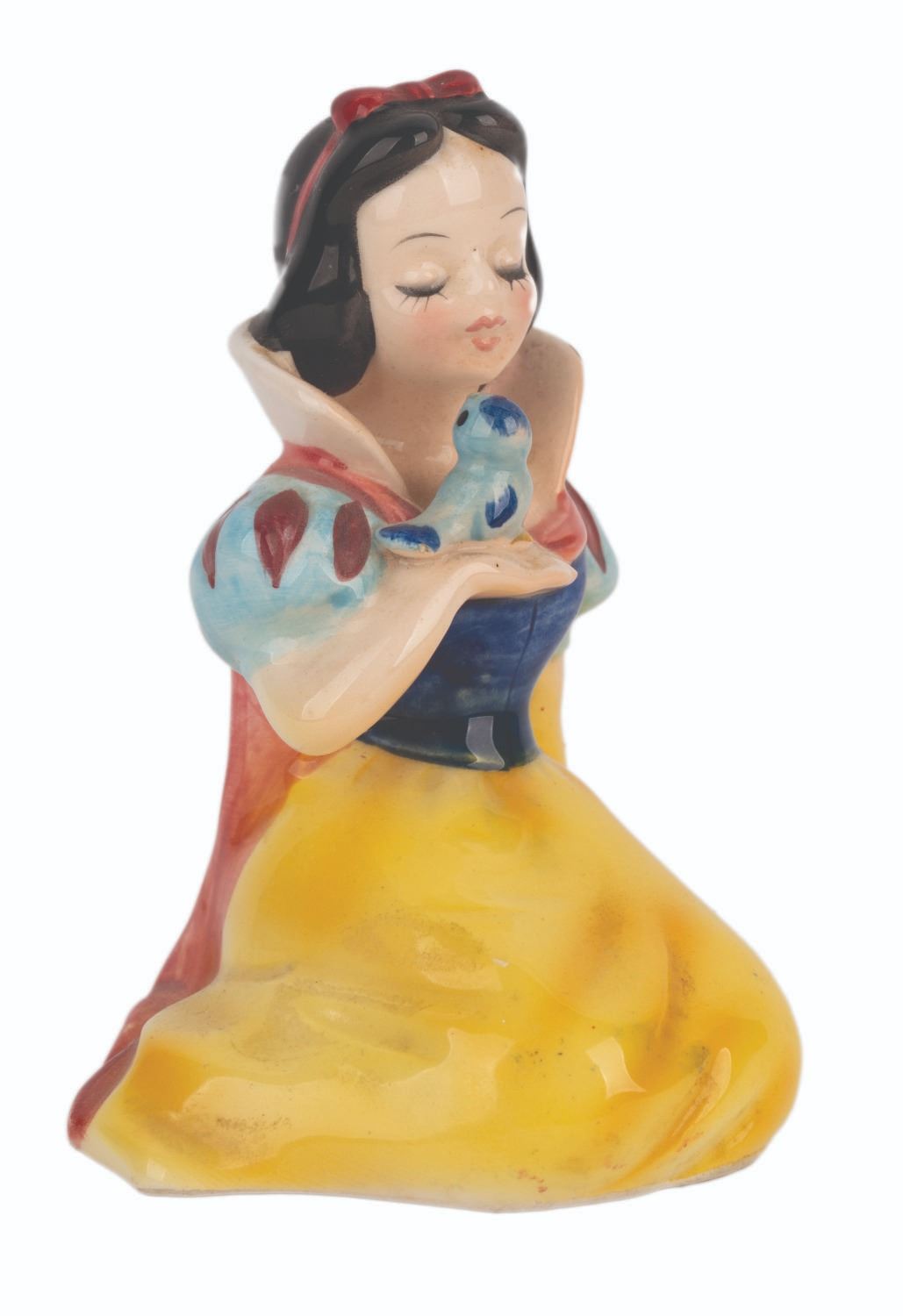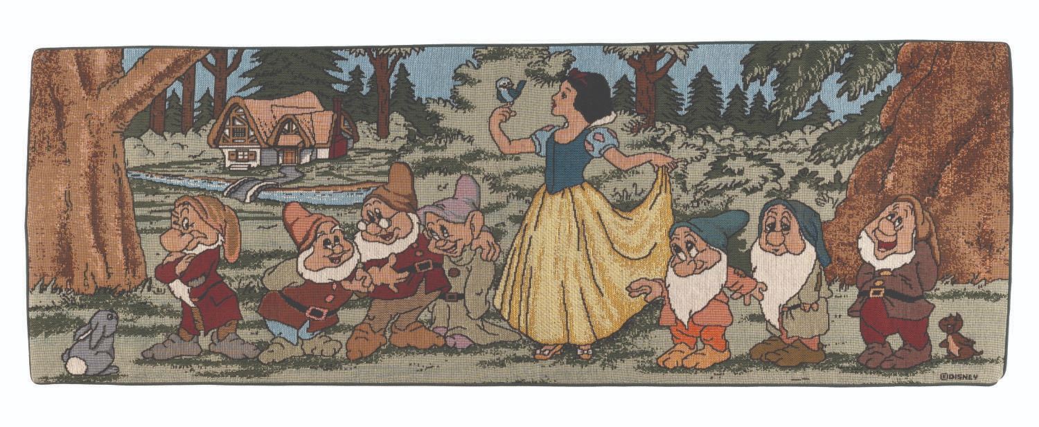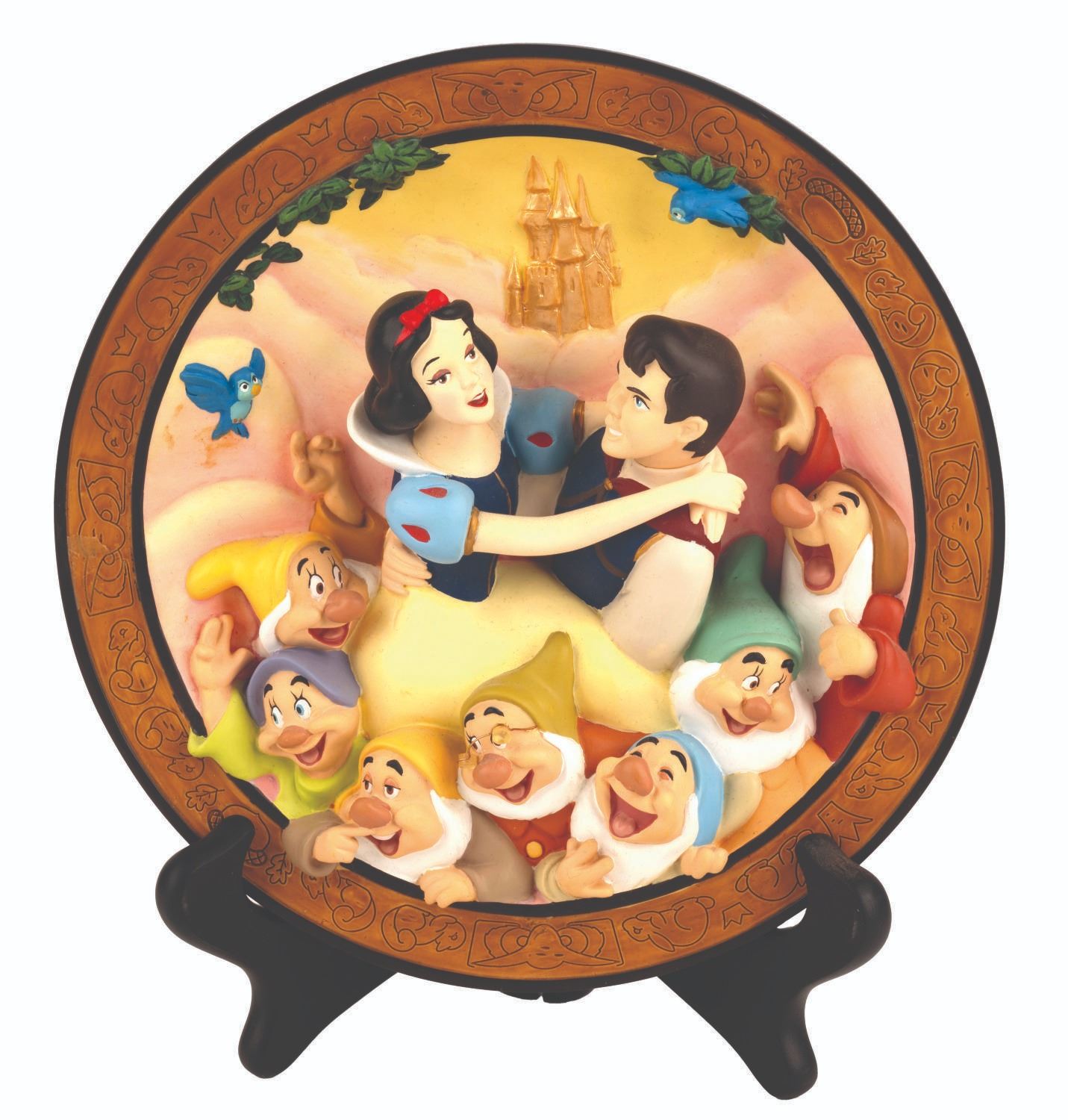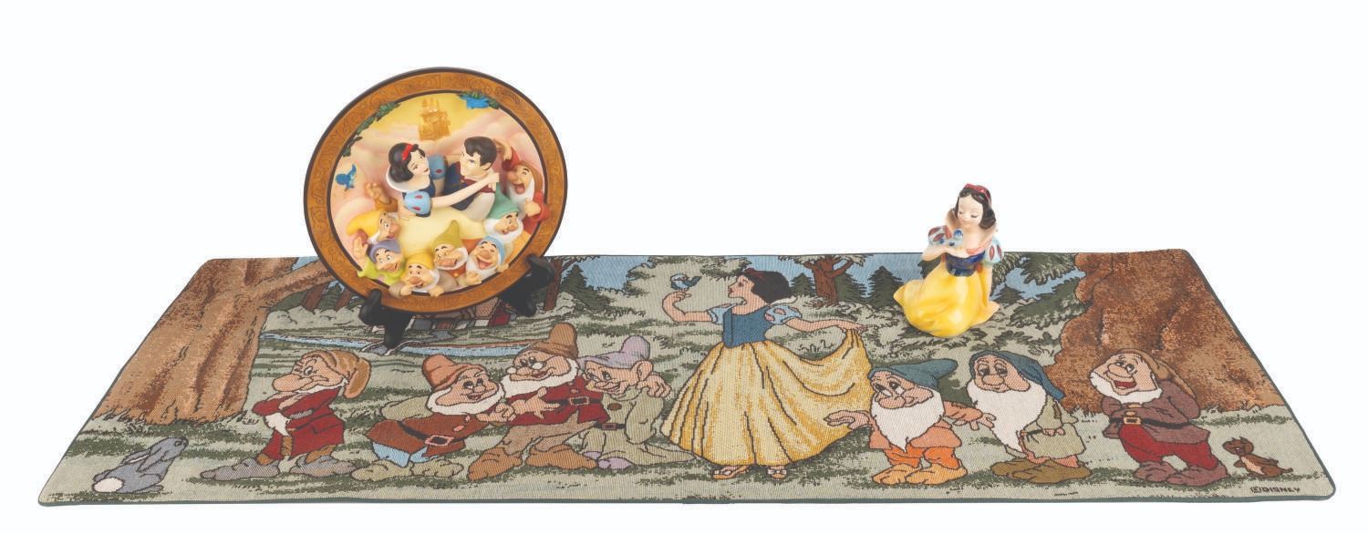 (Disney, 1980s-1990s) A "Snow White and the Seven Dwarfs" plate, ceramic figure, and tapestry. The Snow White 60th anniversary plate is a limited edition, titled "True Love, At Last," and is numbered 2449/10000 with a certificate of authenticity. Measuring 8.5" in diameter, the plate is in very good condition with a 0.75" stain under the bird. The ceramic figure measures 3.5" x 5" and is in good condition with a chip on the collar, paint loss from age, wear from use, and tape residue on the skirt. The 12.5" x 36" tapestry is in very good condition with light color loss from age and folds from storage.