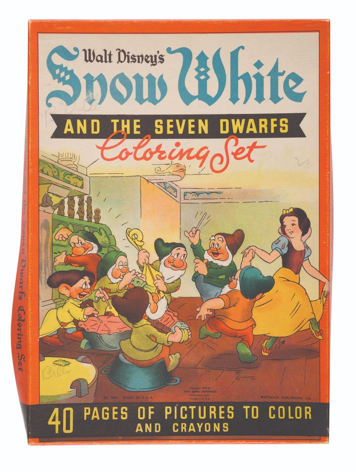 (Whitman, 1938) A Snow White and the Seven Dwarfs Coloring Set Box. Featuring colorful graphics on the box lid, the box once contained crayons and 40 pages of pictures to color, but this lot is for the box only. Measuring 8"x11.25" and .75' wide, this cardstock box exhibits creases, a minor warp to the box, and wear to edges and corners, but otherwise displays in good condition with vibrant colors.