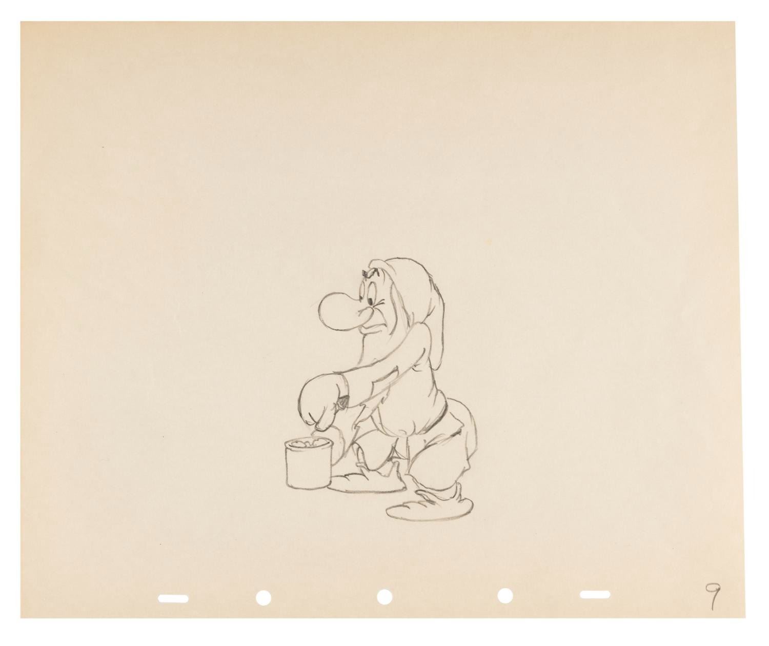 (Disney, 1937) An original production drawing of Grumpy from “Snow White and the Seven Dwarfs.” With a character image size of 3.25” x 4.25” on 10” x 12” animation paper, the drawing accomplished in graphite is in very good condition.
