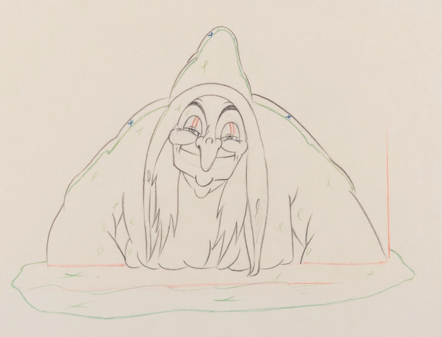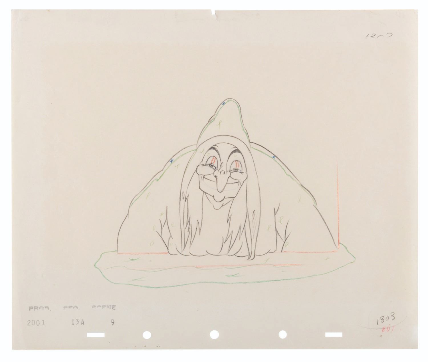 (Disney, 1937) An original production drawing of the Evil Queen as the Old Hag from Walt Disney's "Snow White and the Seven Dwarfs." With an image size of 5.5" x 7.5" on 10" x 12" animation paper, the graphite and colored pencil drawing is in very good condition with creases, edge tears up to 0.25" long, and wear from production use.