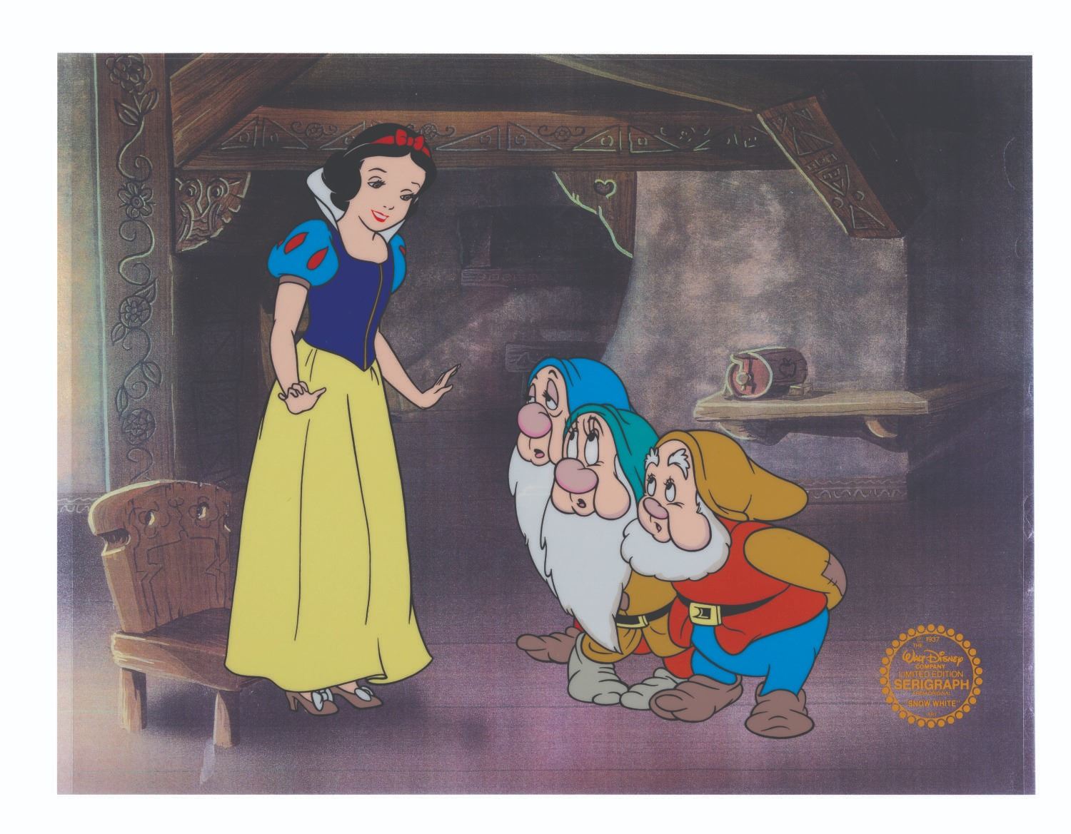 (Disney, 1988) A Serigraph cel of Snow White with Sleepy, Bashful, and Happy. This cel was produced in an edition size of 9,500, and comes with a color copy background. With an image size of 9"x9.25" on a 10.75"x14" cel, the cel is in fine condition.