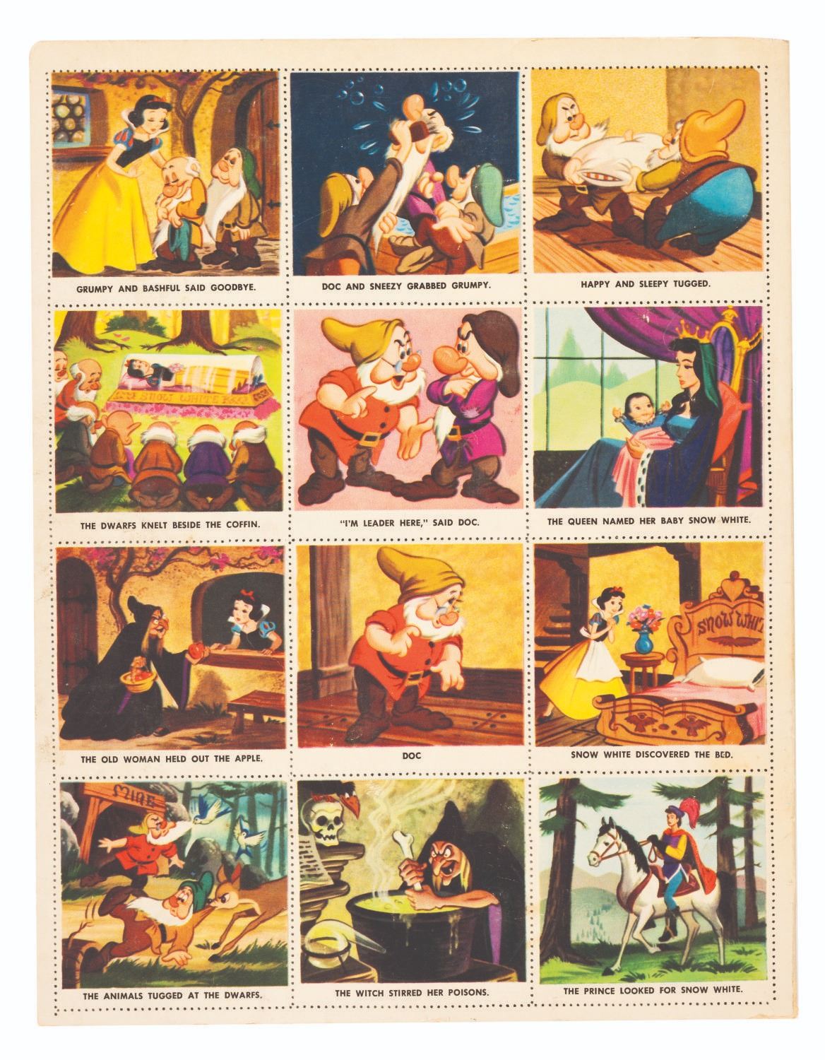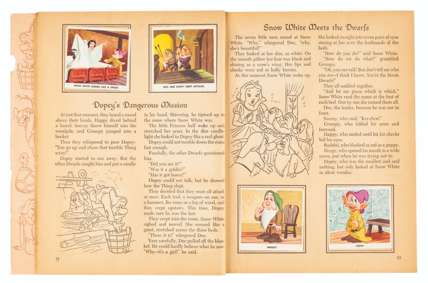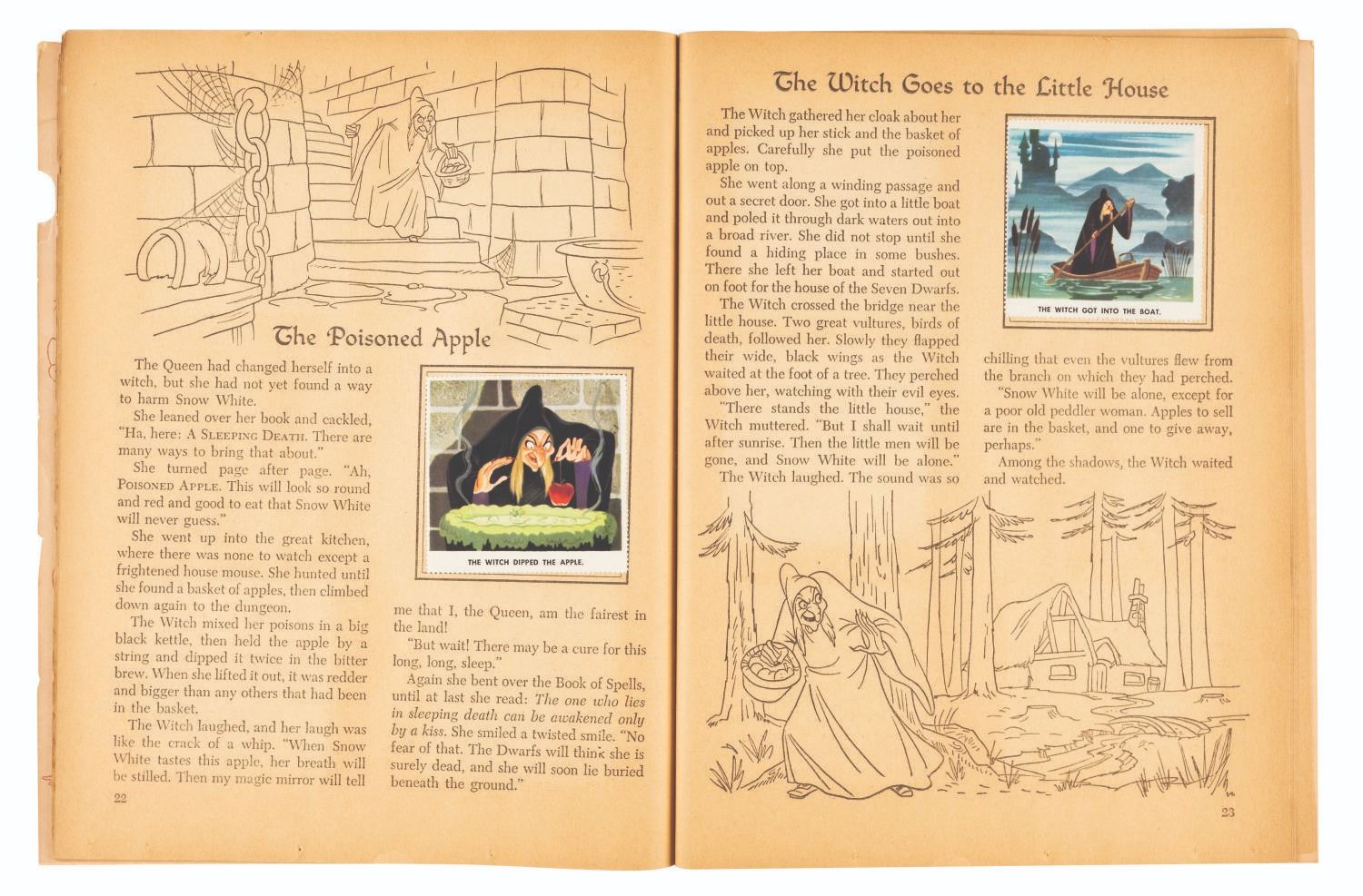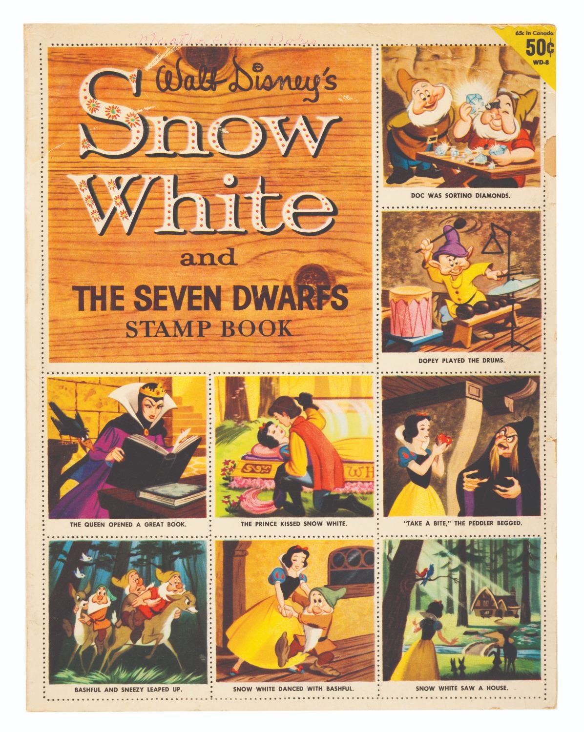 (Simon and Schuster, 1957) A Walt Disney’s "Snow White and the Seven Dwarfs" stamp book. The 32-page book includes all 48 full-color stamps adhered in place. Measuring 8.5" x 11", the book is in fair to good condition with soiling, discoloration, small chips out of the cover, and pen marks inside and out.