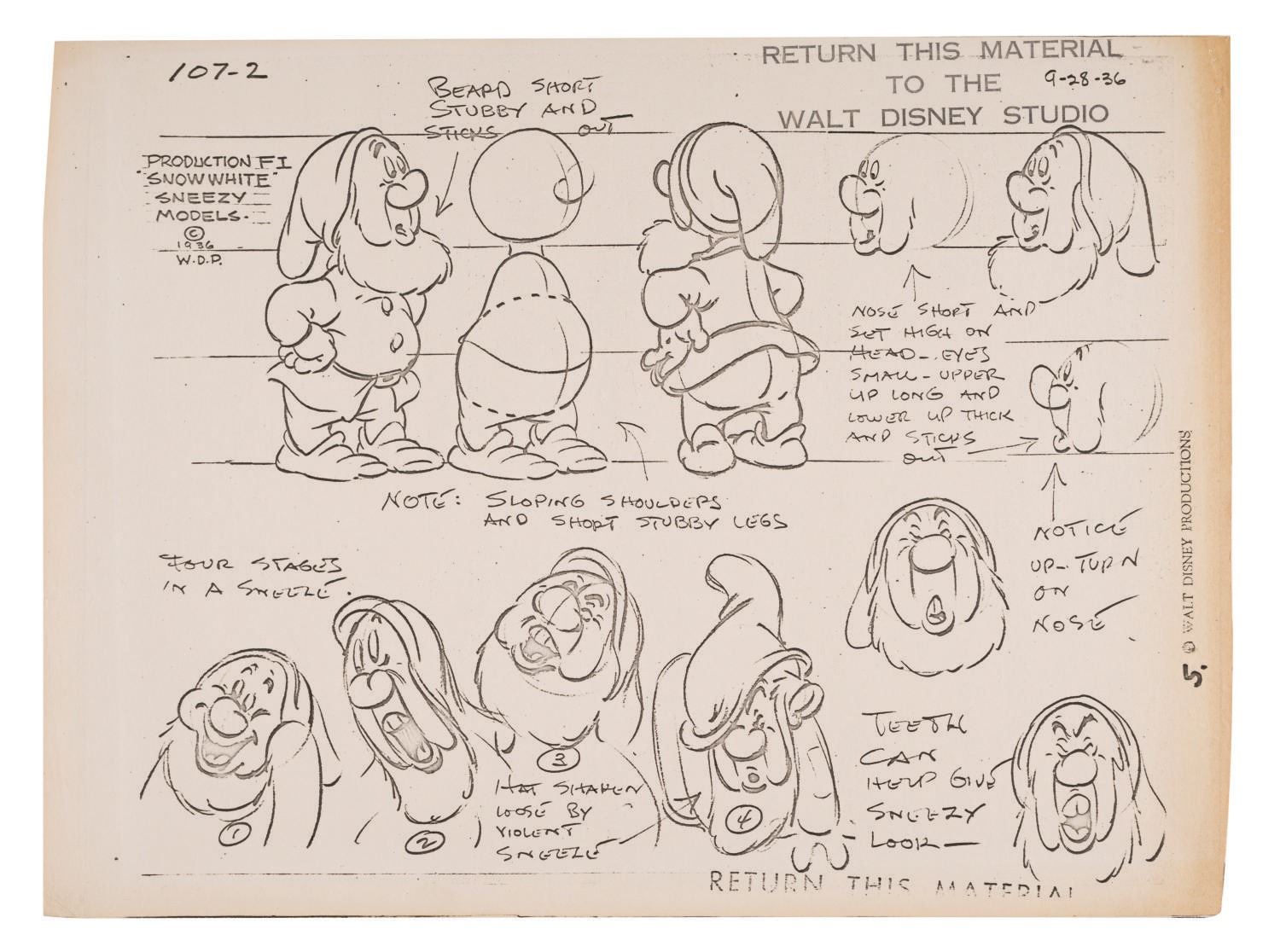 (Disney) A photostat model sheet of Sneezy from Walt Disney's "Snow White and the Seven Dwarfs." Model sheets like these were created during the production of the film as a reference for animators. This particular one is a later copy of the original and was probably used as a reference for later productions. Measuring 11"x14", the sheet is in very good condition, despite slight wear and yellowing to edges and corners.