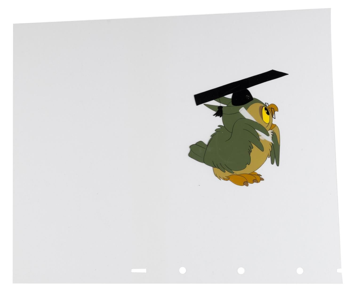 (Disney, 1949) An original production cel of Wise Old Owl from Walt Disney's "So Dear To My Heart." The owl has an image size of 3.25" x 4" on a trimmed 9.25" x 11" animation cel. The cel is in good condition with a spot of paint lifting in the hat.