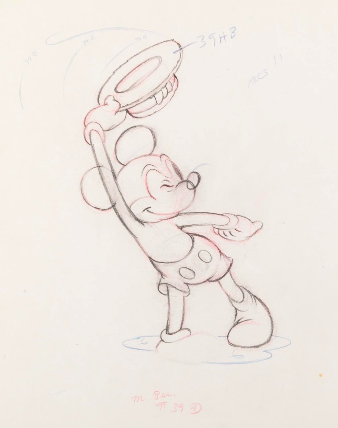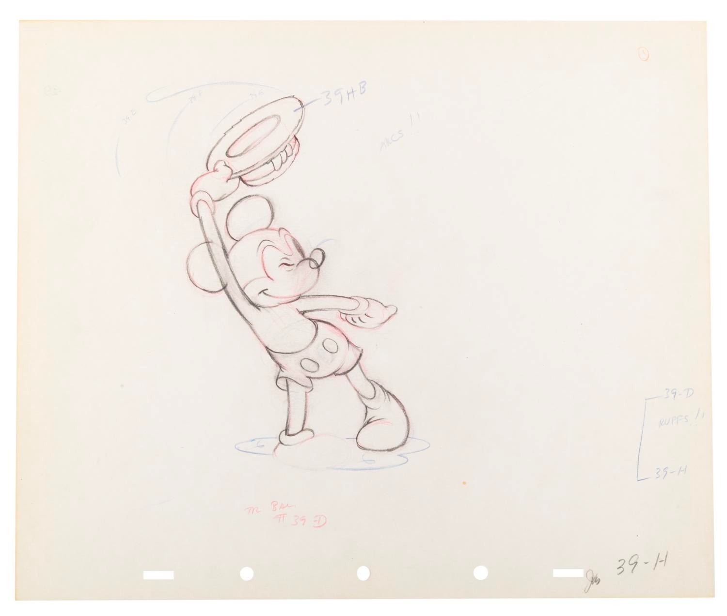 (Disney, 1939) An original production drawing of Mickey from "Society Dog Show. " Mickey has an image size of 4 " x 6.5 " on 10 " x 12 " animation paper. The drawing is in very good condition with light creasing and discoloration.