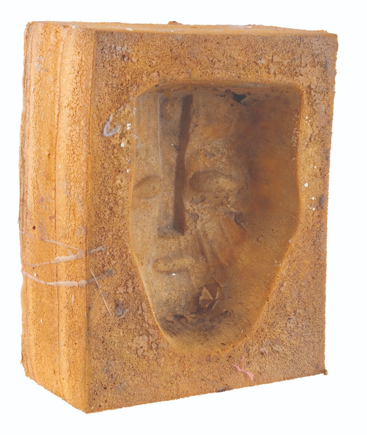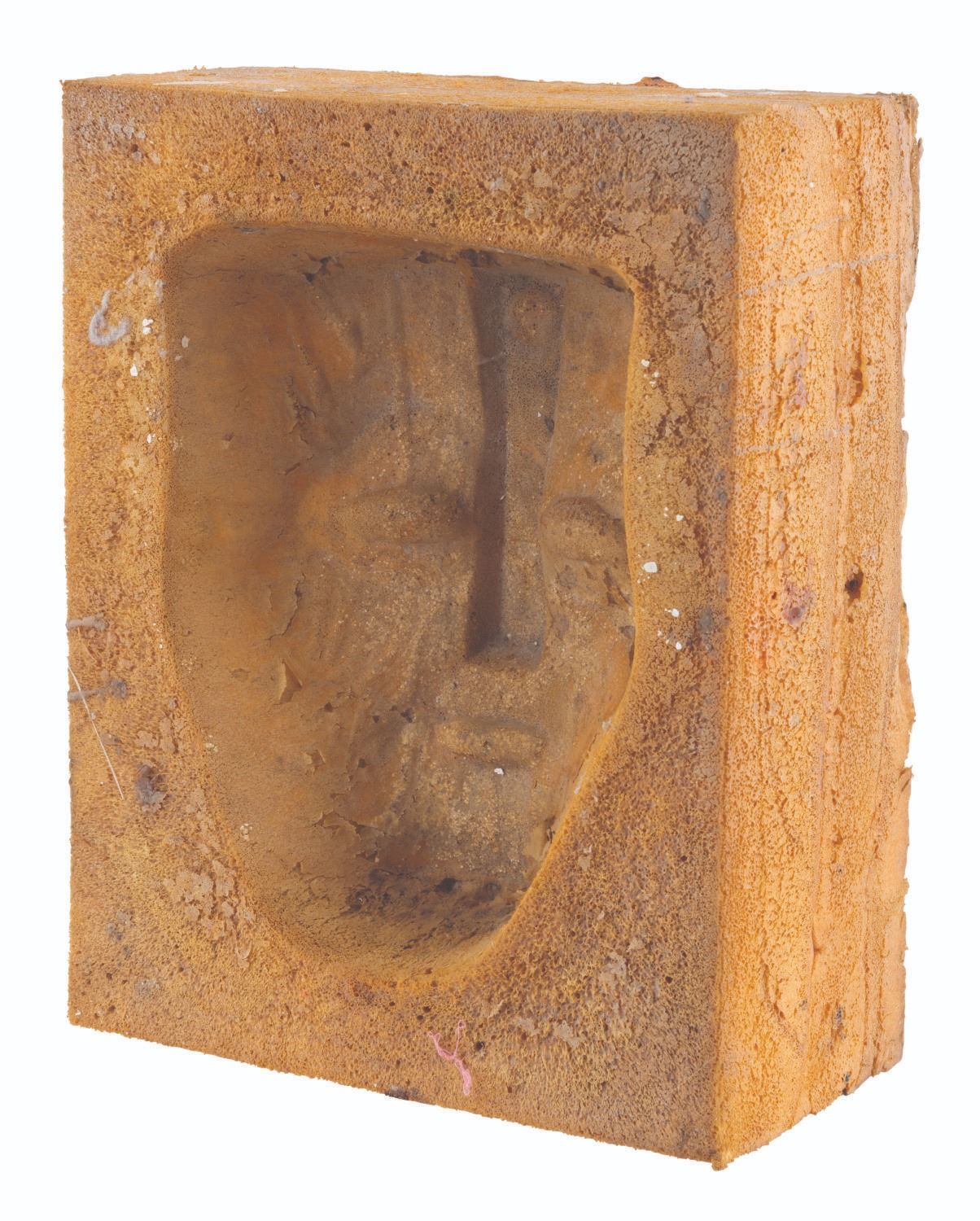 (New Line Cinema, 2005) A foam protection casing for a Mask of Loki prop from production of "Son of The Mask.” This casing was used to protect the mask prop, which is vital to the plot of this sequel and the original film. Measuring 10” x 5” x 12.5” tall, the casing is in fair condition with heavy material loss, tears, stains, discoloration from age, and wear from production use.