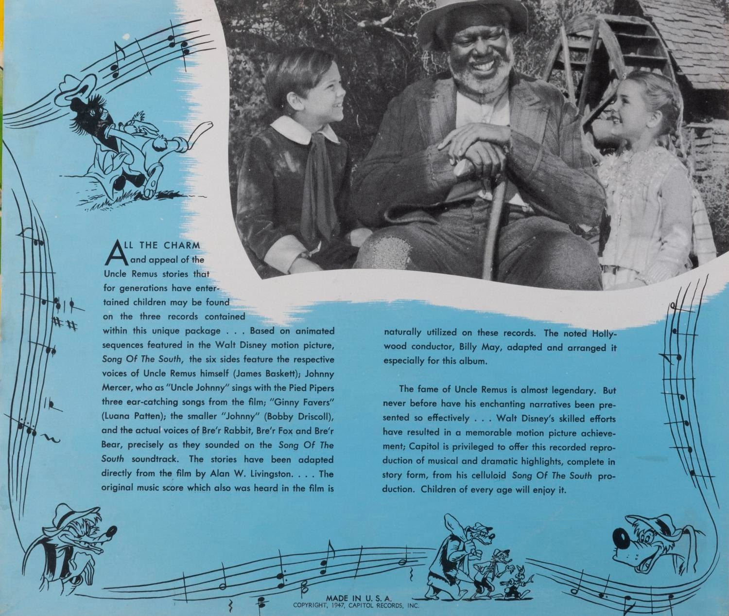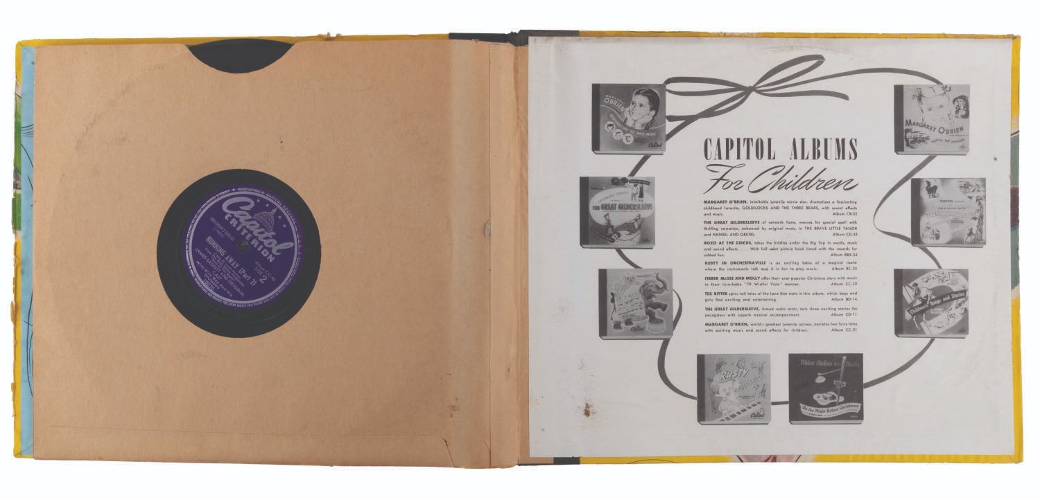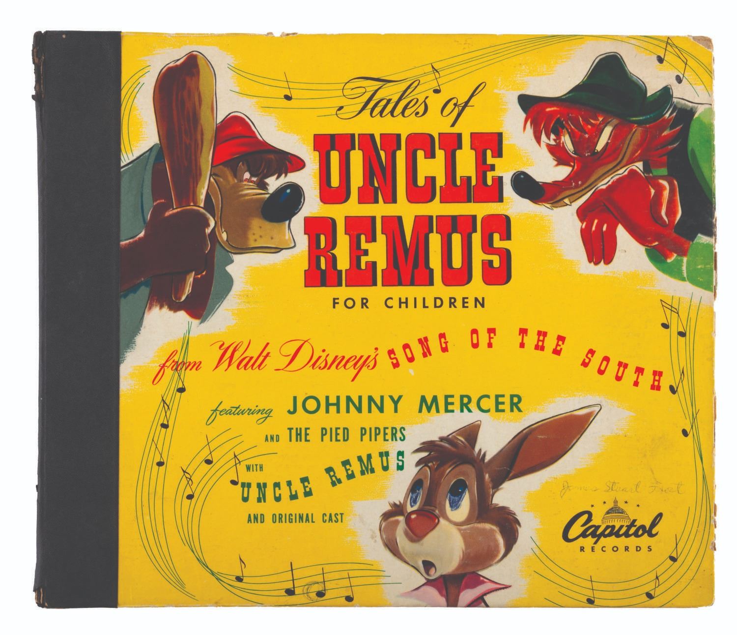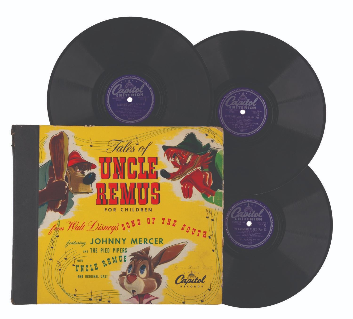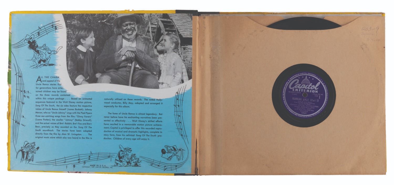 (Capitol Records, 1947) A Tales of Uncle Remus from Walt Disney’s "Song of the South" 78 RPM three-record album featuring Johnny Mercer and the Pied Pipers, and Academy-award winner James Baskett. Measuring 10” in diameter in their 10.5” x 12” sleeve, the shellac records are playable in good condition with heavy scratches and smudges, pencil and pen inscriptions to the cover, and edge wear including 1.25” of separation at the spine.