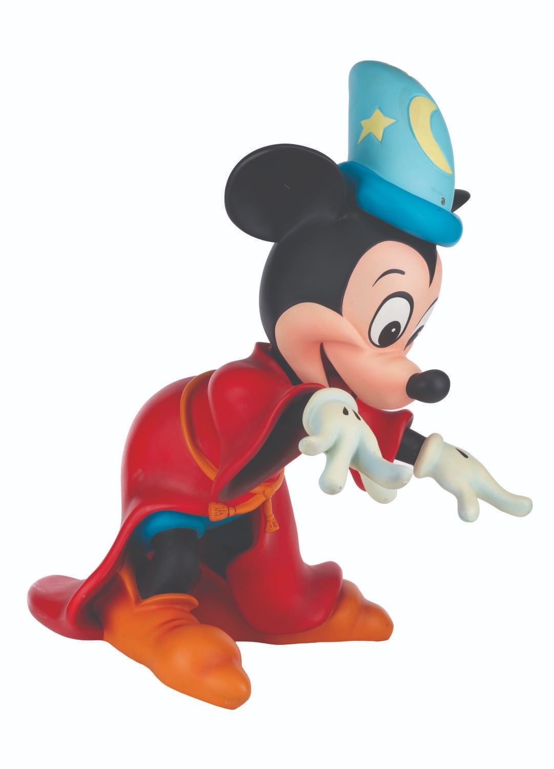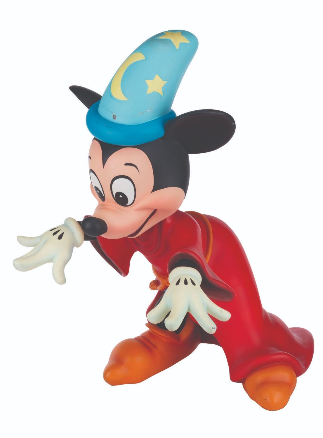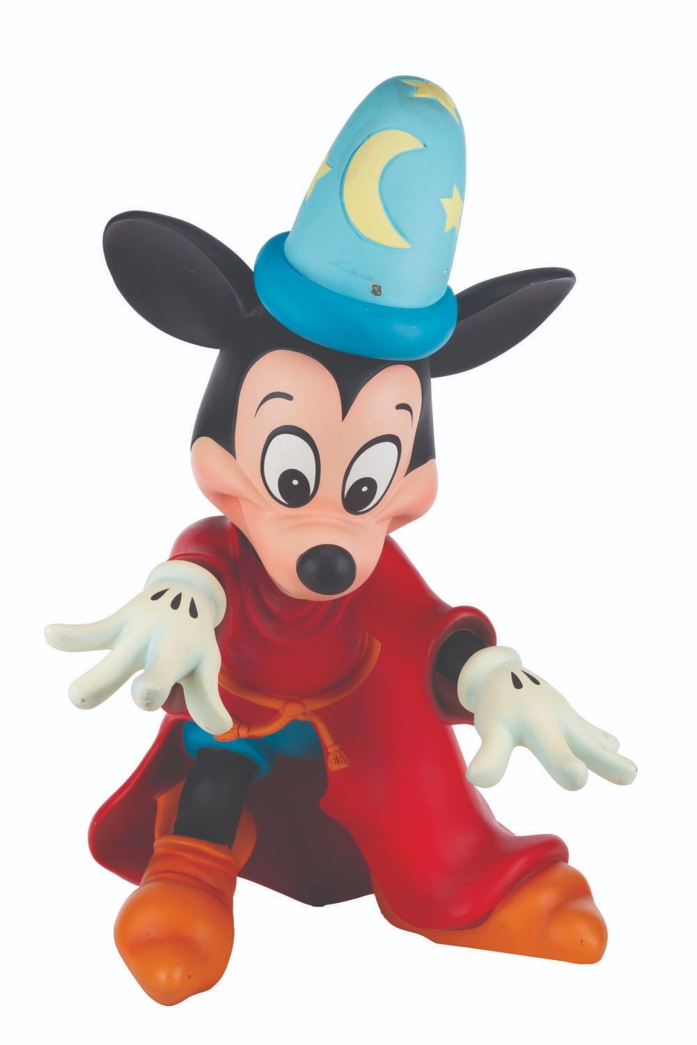 (Disney, 1987-2000s) An original Disney Store display figure of Sorcerer’s Apprentice Mickey from "Fantasia." Measuring 16” x 26” x 28” tall, the fiberglass figure displays in very good condition with typical scuffs, scratches, paint chipping, and discoloration from age and store display. Due to size and weight, this item will require special shipping arrangements. Please inquire before bidding.