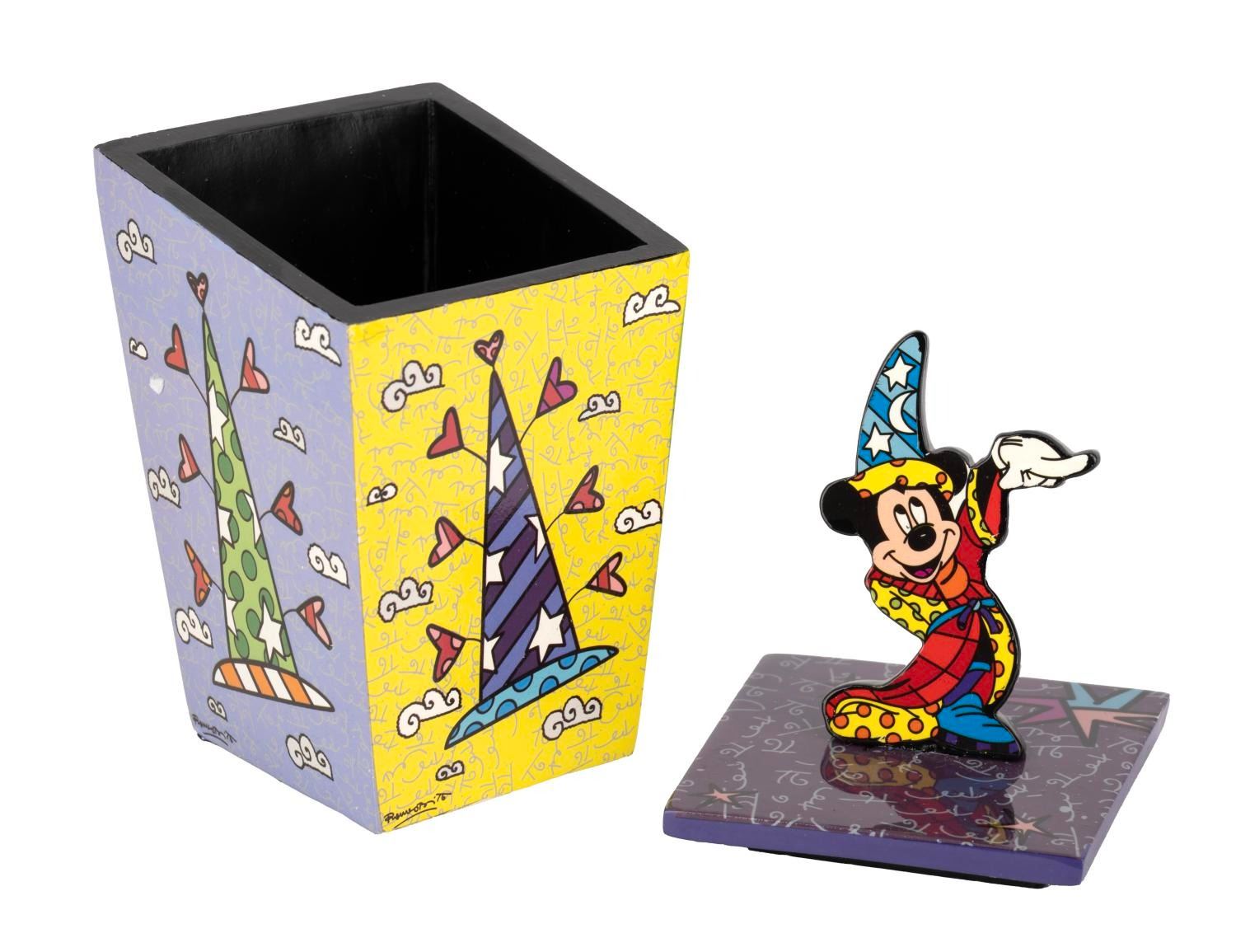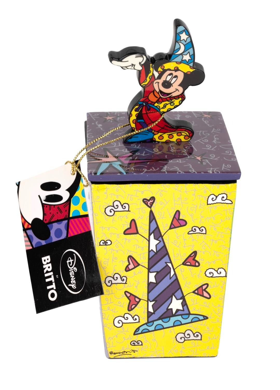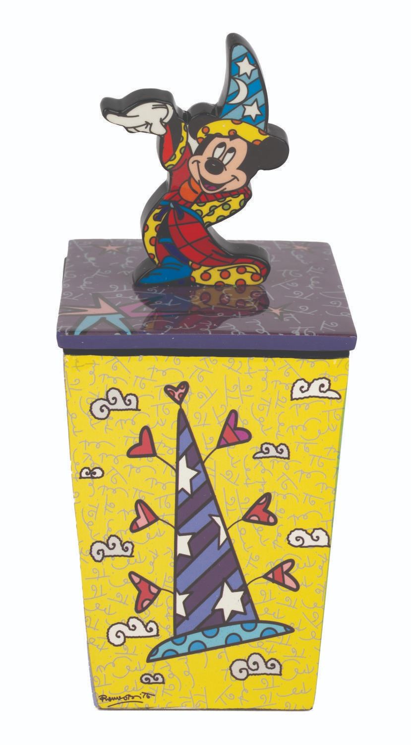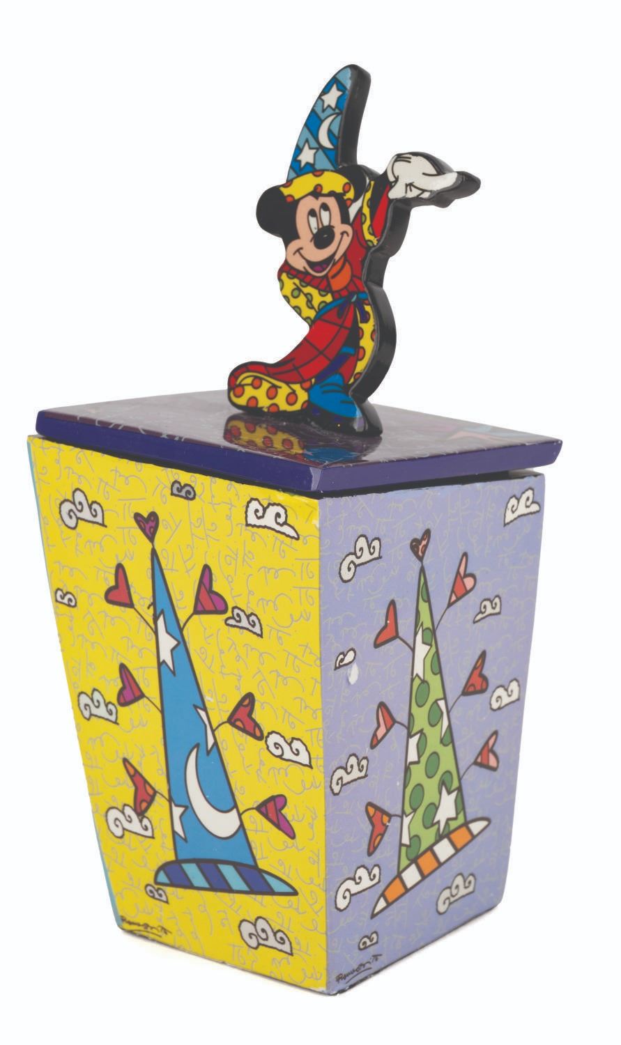 (Britto, 2010) A lidded box featuring Sorcerer Mickey designed by pop artist Romero Britto. Measuring 6.25” x 2.75” x 2.75”, the box displays in very good condition with a light black mark on Mickey’s right eye and small scuff on his sleeve.