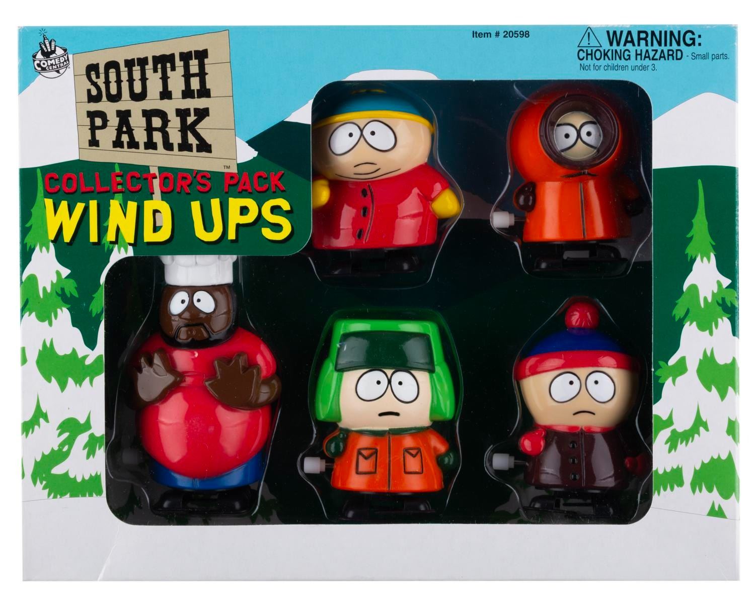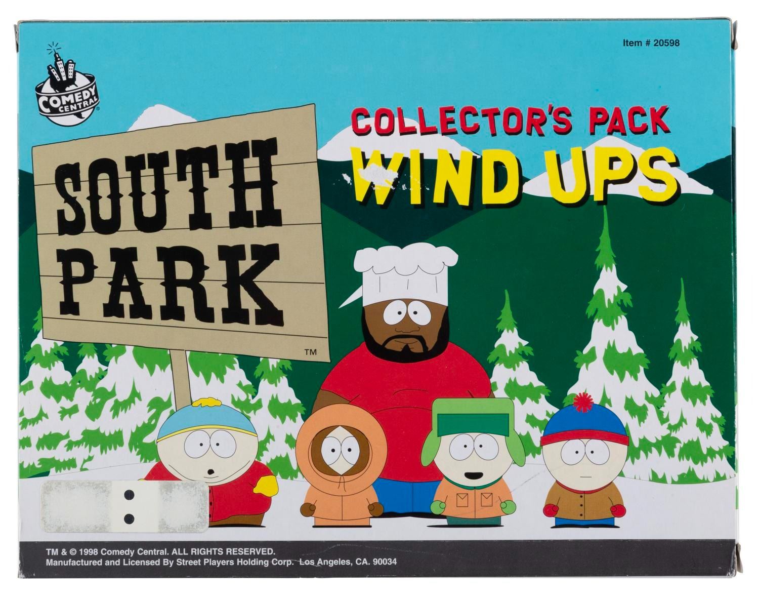 (Comedy Central, 1998) A "South Park" Collector's Pack Wind Ups set, including wind-up walking figures of Cartman, Kenny, Kyle, Stan, and Chef. Measuring from 2.75" to 4" tall, the toys are in fine unused condition in the 10.5" x 8" x 2" good condition box.