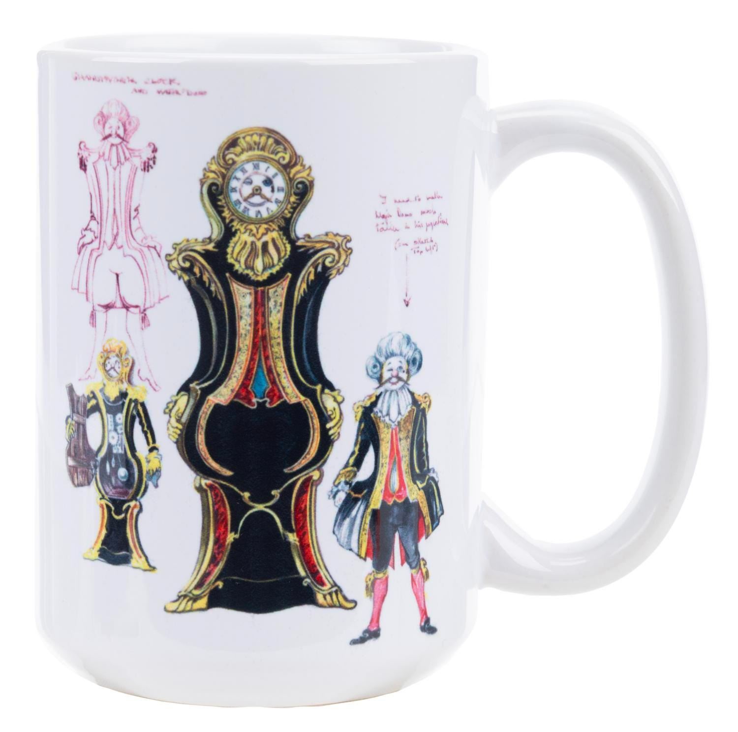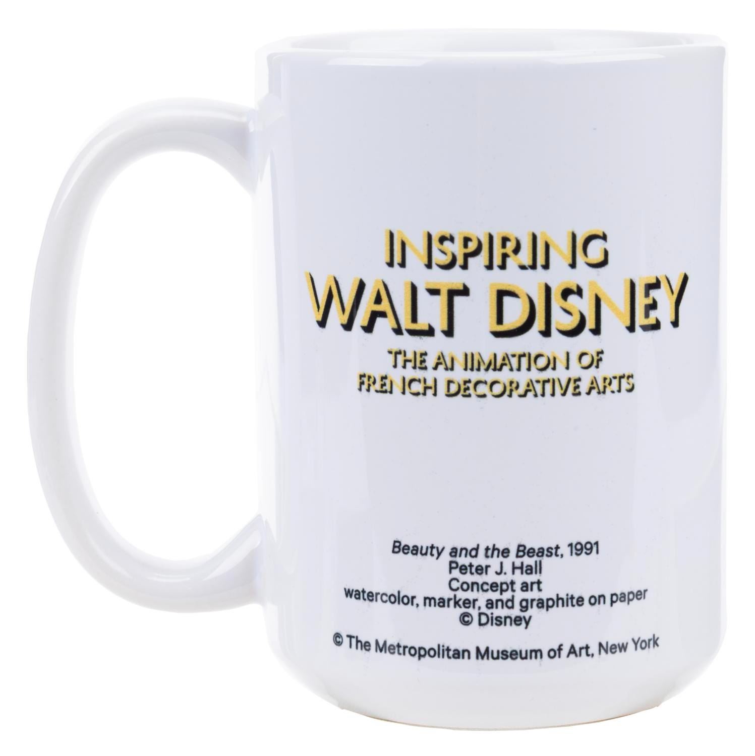 (The Met, 2021) A souvenir "Beauty and the Beast" Cogsworth concept art mug from the Inspiring Walt Disney: The Animation of French Decorative Arts exhibition at the Metropolitan Museum of Art. Measuring 5" tall and 3.5" in diameter, the mug is in fine condition.