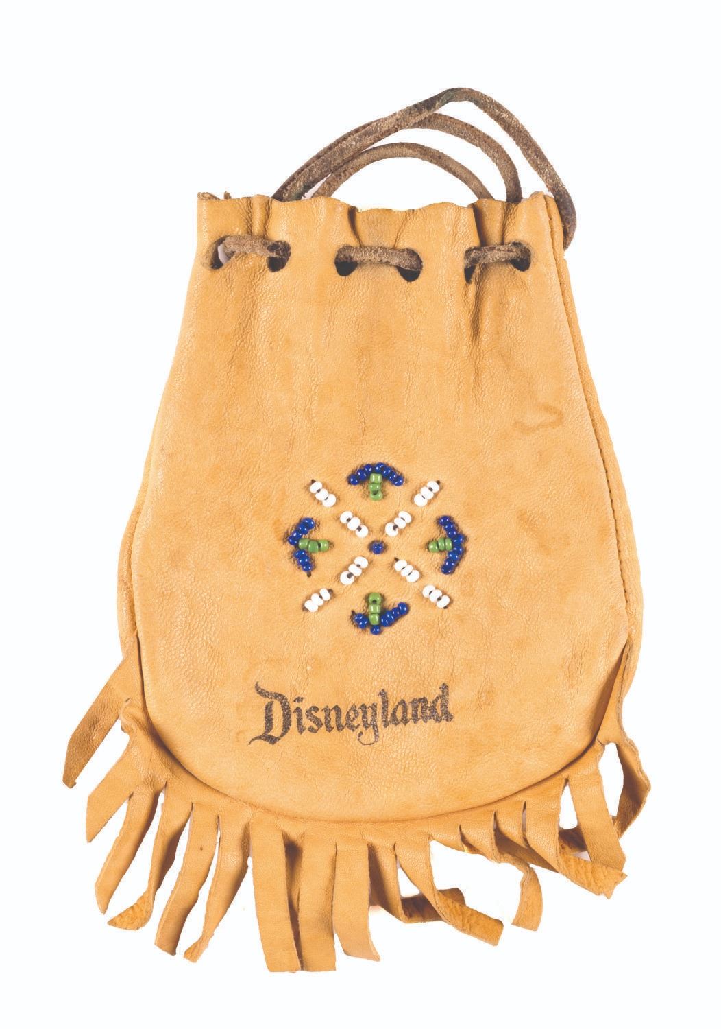 (Disneyland, 1955-60s) A souvenir beaded leather pouch stamped "Disneyland." Measuring 7" x 3", the pouch is in very good condition, with some scuffs and spotting from age, and wear to the drawstring.