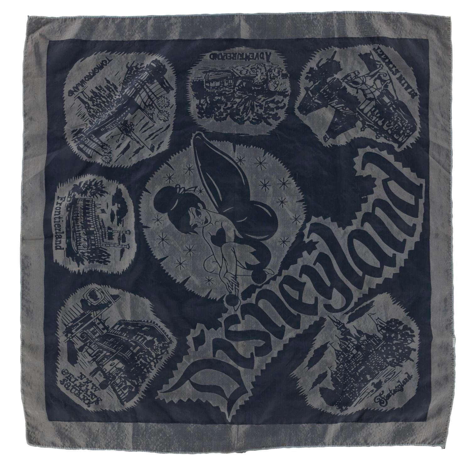 (Disneyland, 1960s-80s) A Disneyland scarf featuring the Park’s lands around the borders and Tinker Bell in the center. Measuring 27” x 27”, the scarf is in good condition with scratches, fraying, and wear.