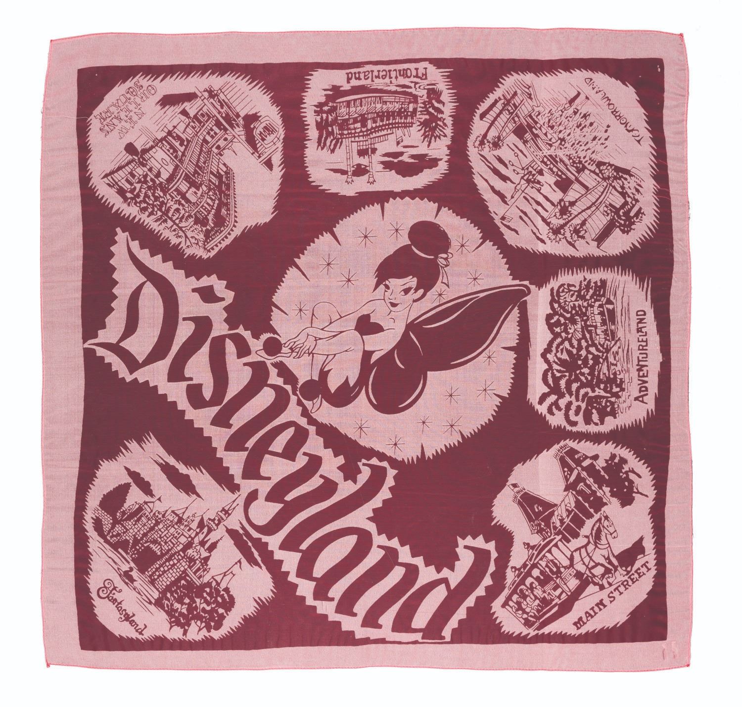 (Disneyland, 1960s) A Disneyland scarf featuring the Park’s lands around the borders and Tinker Bell in the center. Measuring 26" x 26", the rayon-silk scarf displays in very good condition with light fraying and two 0.75" areas of discoloration to the corner under Main Street.