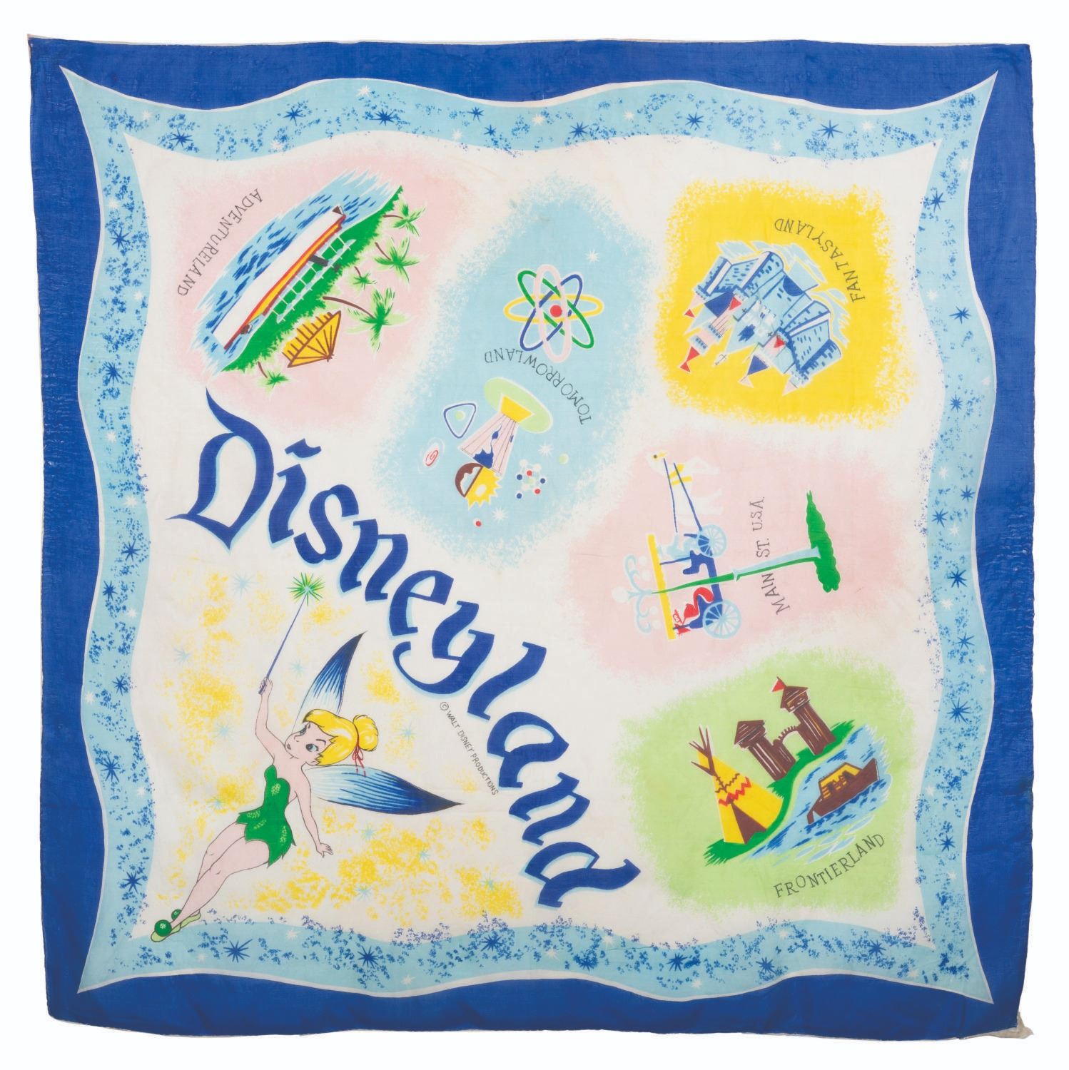 (Disneyand, 1955-66) A souvenir of Disneyland silk scarf featuring Tinker Bell and each of the Park’s original 5 lands. Measuring 31" x 31", the scarf is in good condition with wear from use showing especially around the edges.