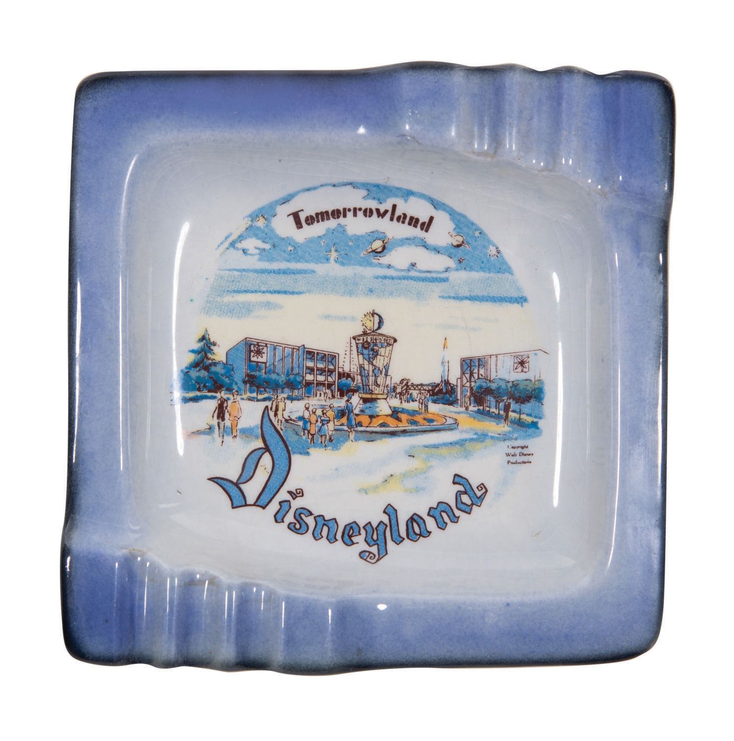 (Disneyland, 1955) A large Disneyland souvenir ashtray manufactured by Eleanor Welborn. The entryway to Tomorrowland, Exhibit Halls, and Clock of the World are beautifully represented within this early souvenir of Disneyland. The glazed ceramic ashtray measures 6.25"x6.25" and is in very good condition with crazing throughout.