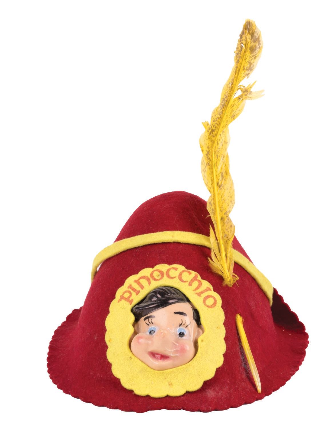 (Disneyland, 1950's-1960's) A feathered cap decorated with a figural Pinocchio face. Measuring 9" in diameter and 5.5" high, the cap is in good condition, with slight stress lines visible in the plastic Pinocchio face.