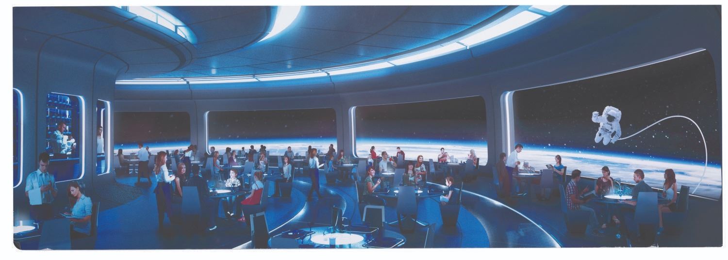 (Epcot, 2021) A conceptual presentation poster for Space 220, a futuristic restaurant at Epcot modeled after a space station and featuring simulated celestial daytime and nighttime views of the Earth. Measuring 23.25” x 69.5”, the foam core-backed poster is in good condition with small tears, light edge wear along the bottom, and small creases and folds at the bottom and top right corners.