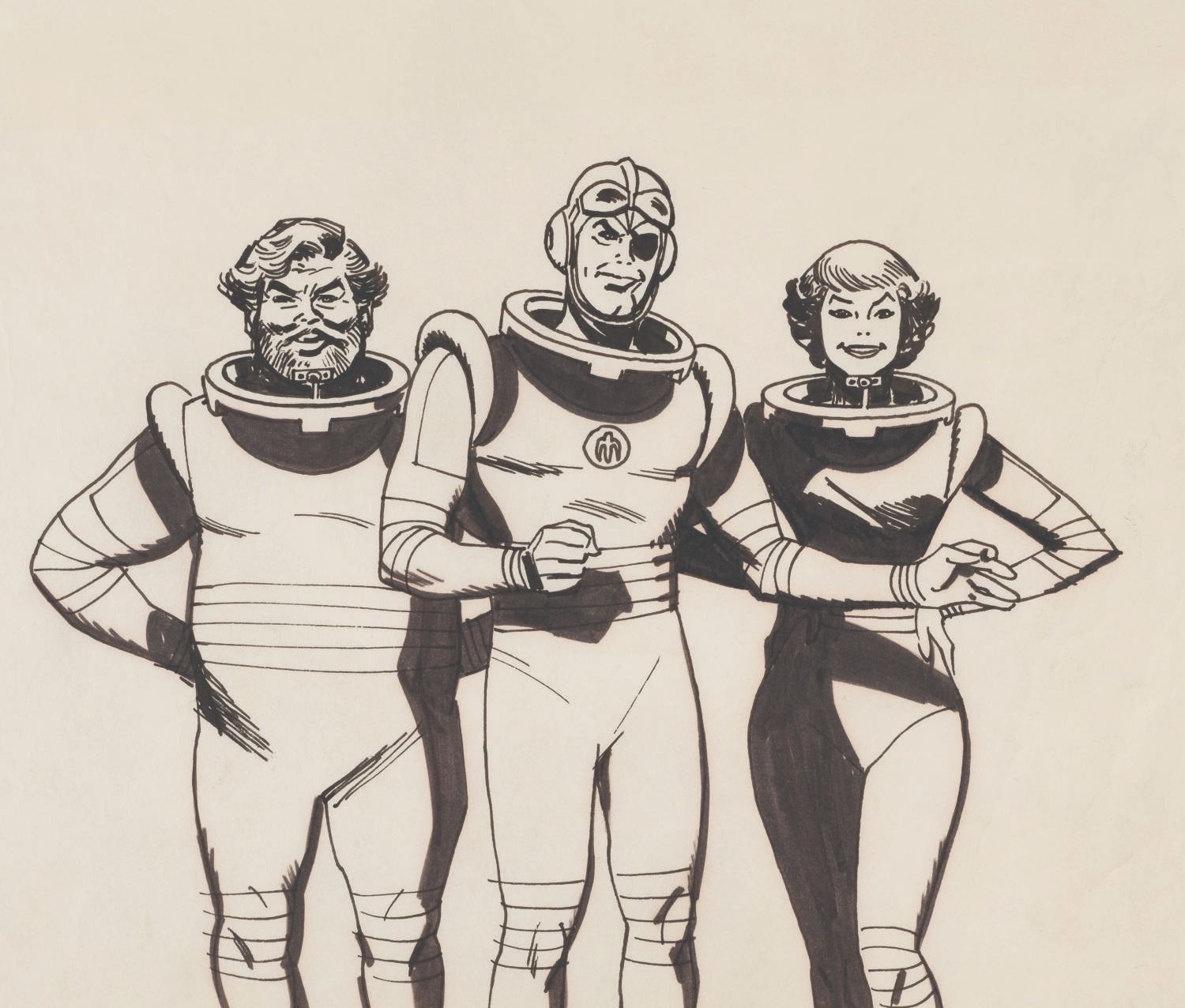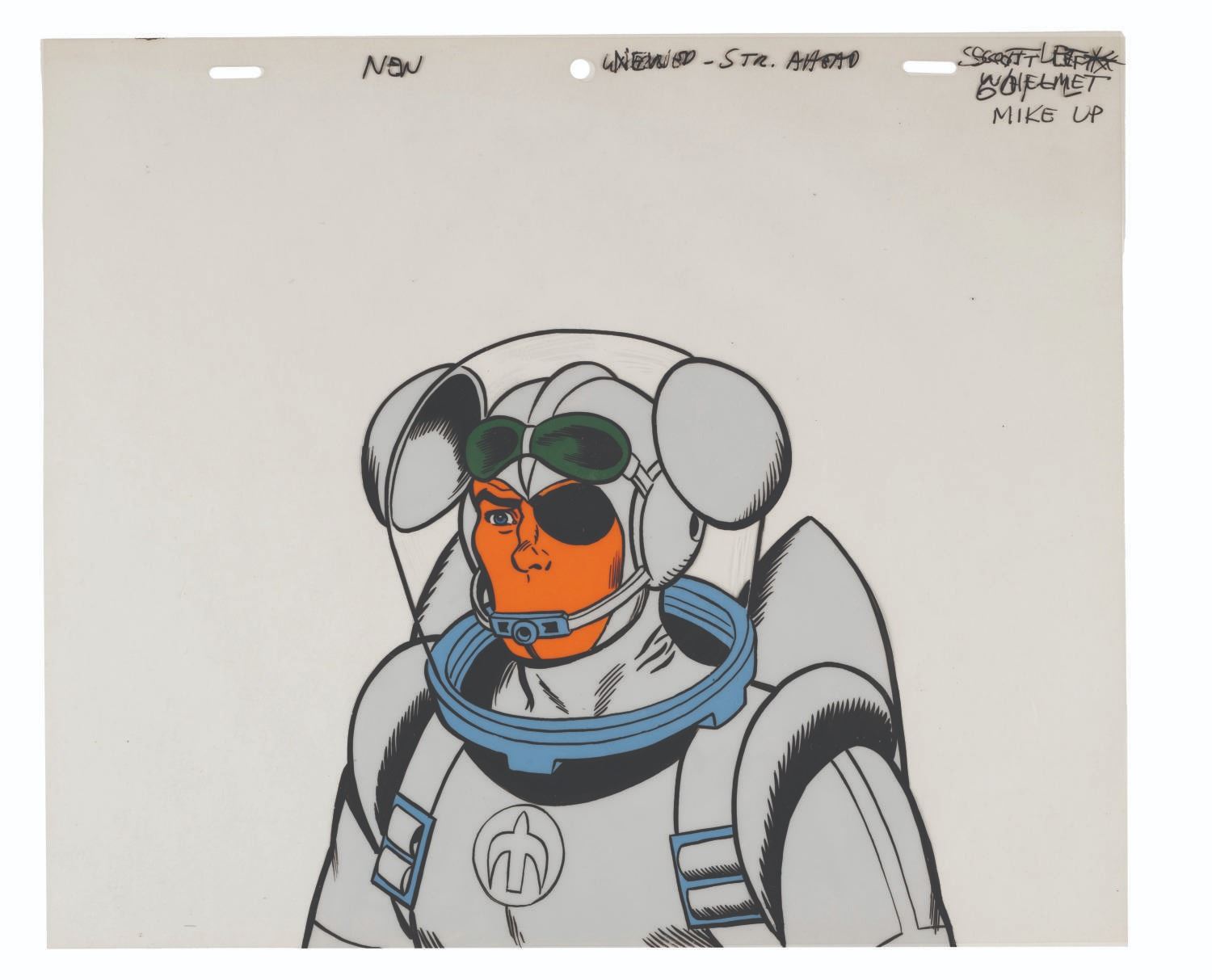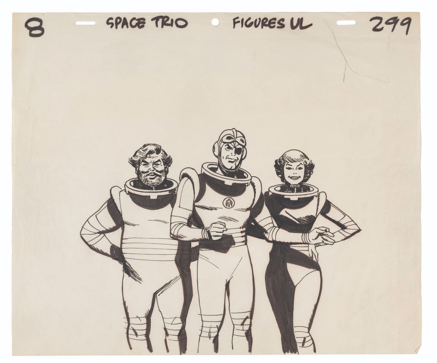 (Cambria Productions, 1962-64) A multi-layer production cel and drawing from the sci-fi TV series, “Space Angel”. The ink drawing is by the show’s co-creator and comic book hall of famer Alex Toth. The multi-layer cel measures 10.5” x 12.5” with a character image size of 7.25” x 7.5” and is in very good condition with the exception of one cel layer which has had a 1” wide strip torn off the right side. This layer contains only a single eye and is not affected by the tear. The drawing features all three of the show’s core characters and measures 10.5” x 12.5” with an image size of 7” x 8.5” and is in very good condition with very light creases from production use. Alex Toth is best known for his iconic character designs for Hanna Barbera including Space Ghost, The Herculoids, and Birdman and the Galaxy Trio. His talent was obvious from an early age, as a teacher in his Junior High poster class urged him to devote himself to art. Through the late 1940s and 1950s he drew for top comic books including Flash and Green Lantern for DC Comics, and Disney’s Zorro for Dell. It was as Art Director for the Space Angel animated sci-fi show that he entered the world of animation. Even with a very limited animation style, Toth’s richly detailed drawings gave the series the look of an animated comic book.