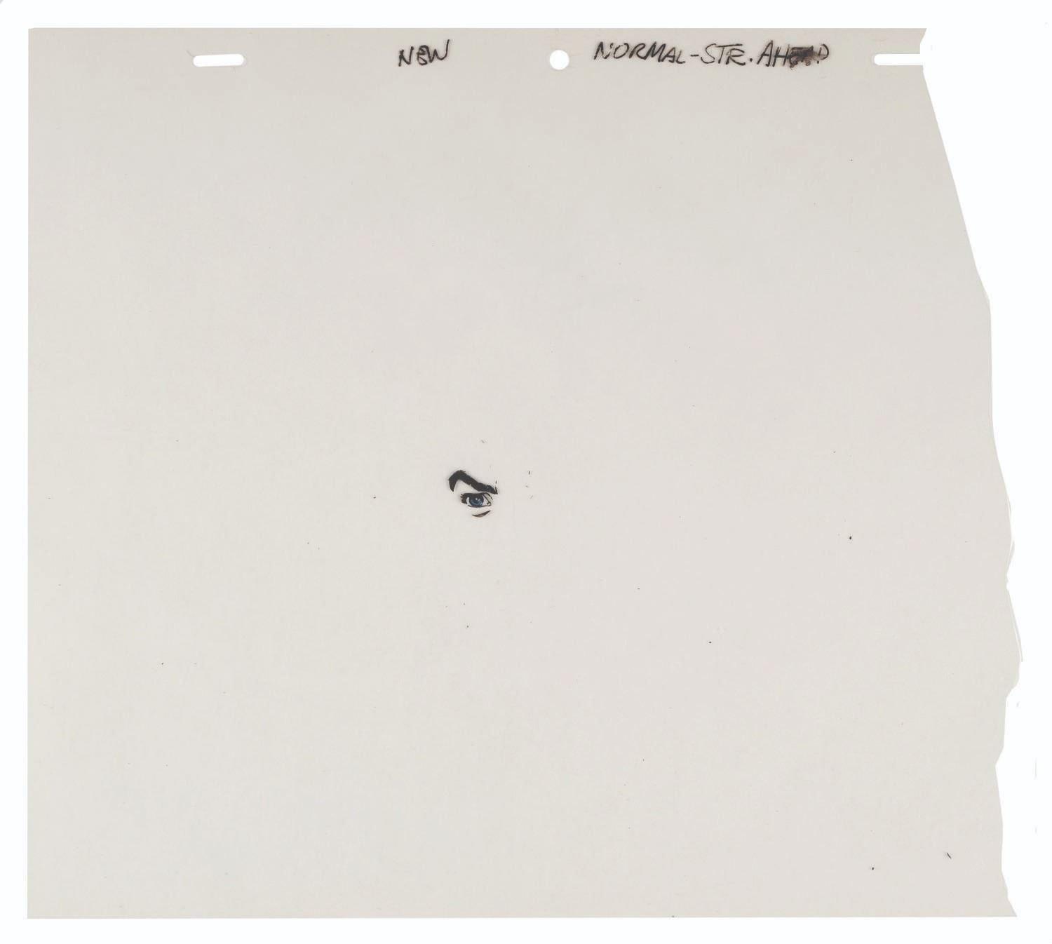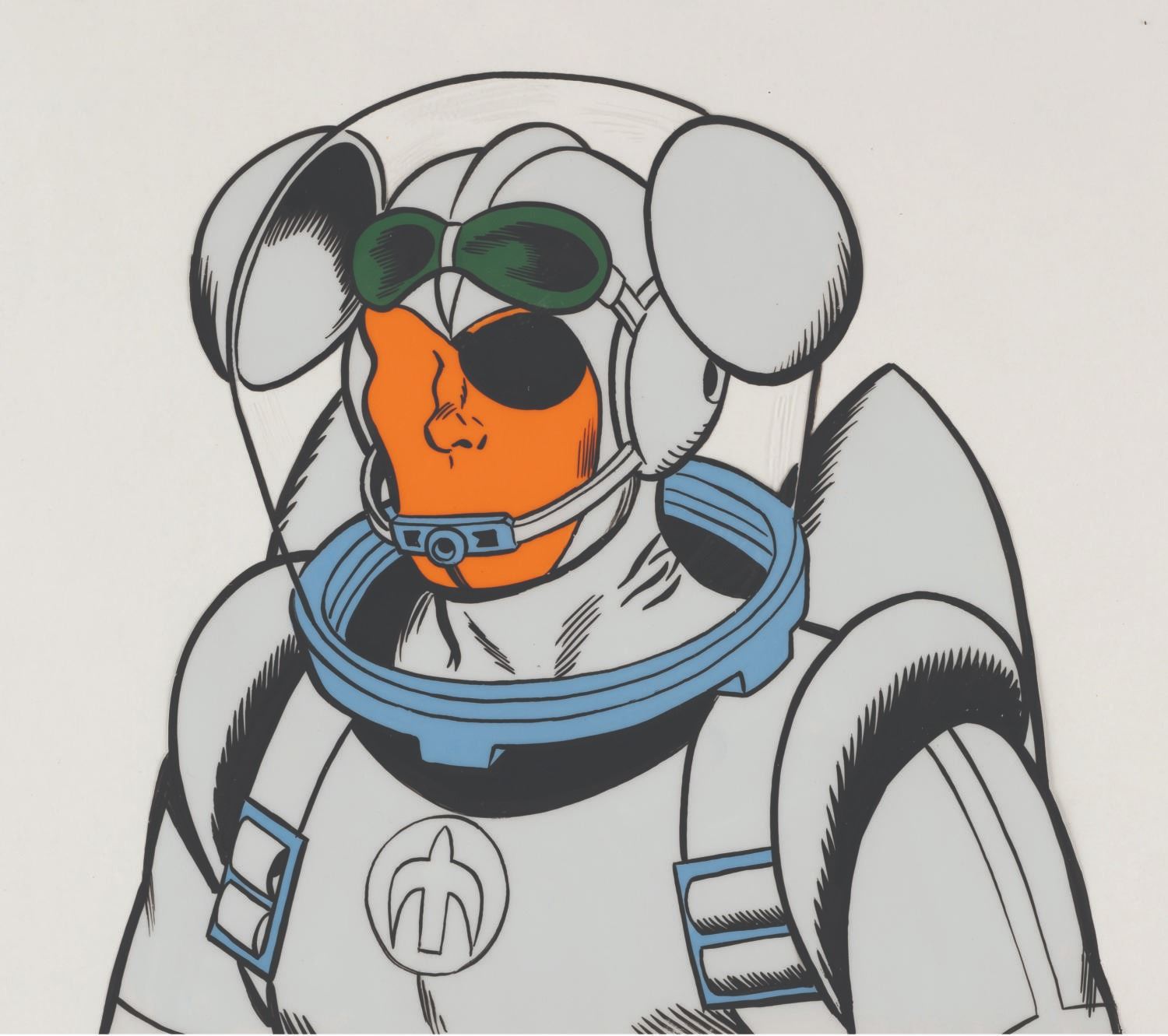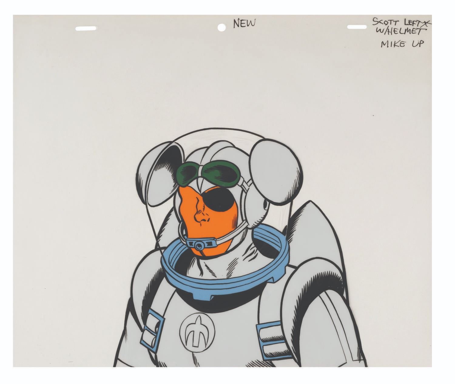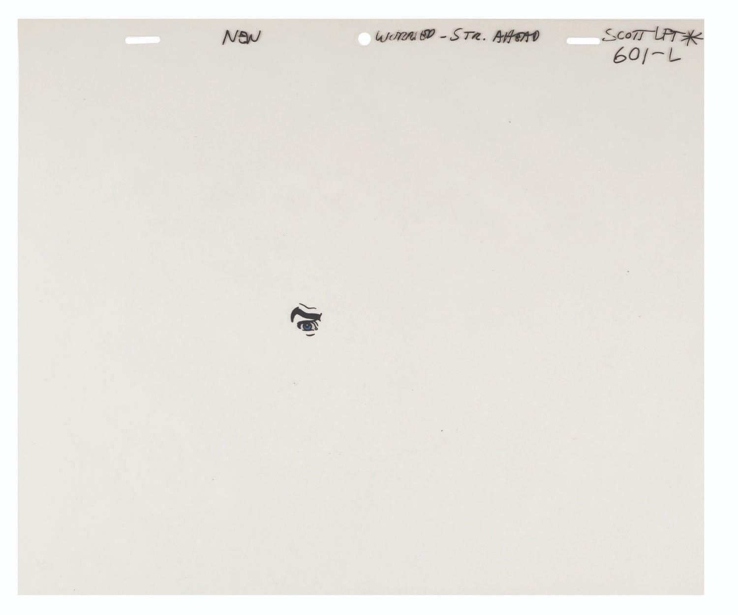 (Cambria Productions, 1962-64) A multi-layer production cel and drawing from the sci-fi TV series, “Space Angel”. The ink drawing is by the show’s co-creator and comic book hall of famer Alex Toth. The multi-layer cel measures 10.5” x 12.5” with a character image size of 7.25” x 7.5” and is in very good condition with the exception of one cel layer which has had a 1” wide strip torn off the right side. This layer contains only a single eye and is not affected by the tear. The drawing features all three of the show’s core characters and measures 10.5” x 12.5” with an image size of 7” x 8.5” and is in very good condition with very light creases from production use. Alex Toth is best known for his iconic character designs for Hanna Barbera including Space Ghost, The Herculoids, and Birdman and the Galaxy Trio. His talent was obvious from an early age, as a teacher in his Junior High poster class urged him to devote himself to art. Through the late 1940s and 1950s he drew for top comic books including Flash and Green Lantern for DC Comics, and Disney’s Zorro for Dell. It was as Art Director for the Space Angel animated sci-fi show that he entered the world of animation. Even with a very limited animation style, Toth’s richly detailed drawings gave the series the look of an animated comic book.