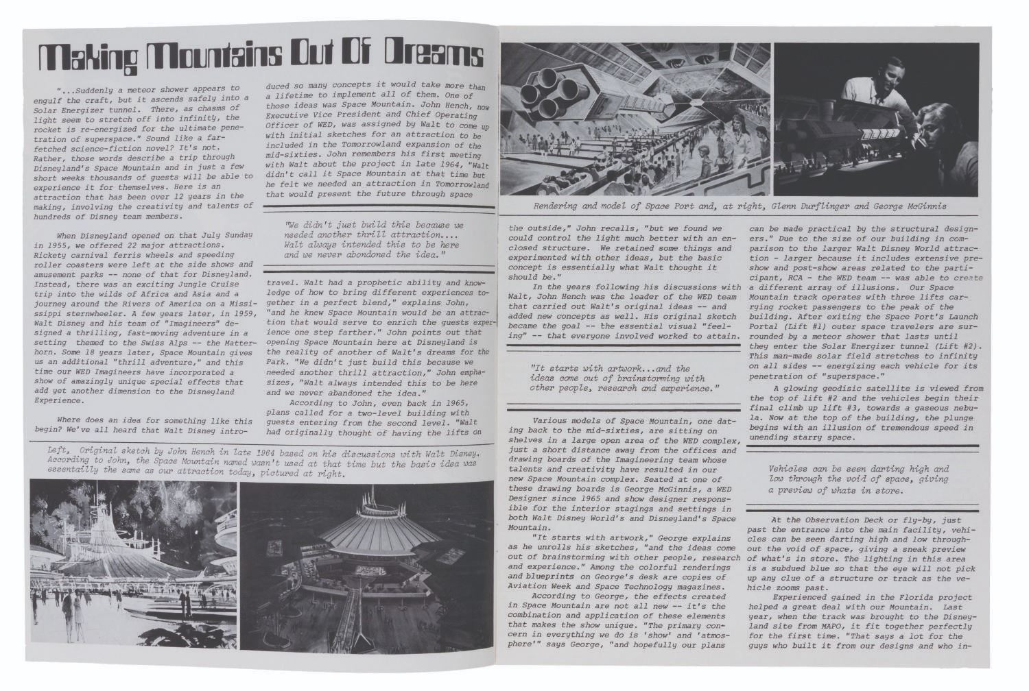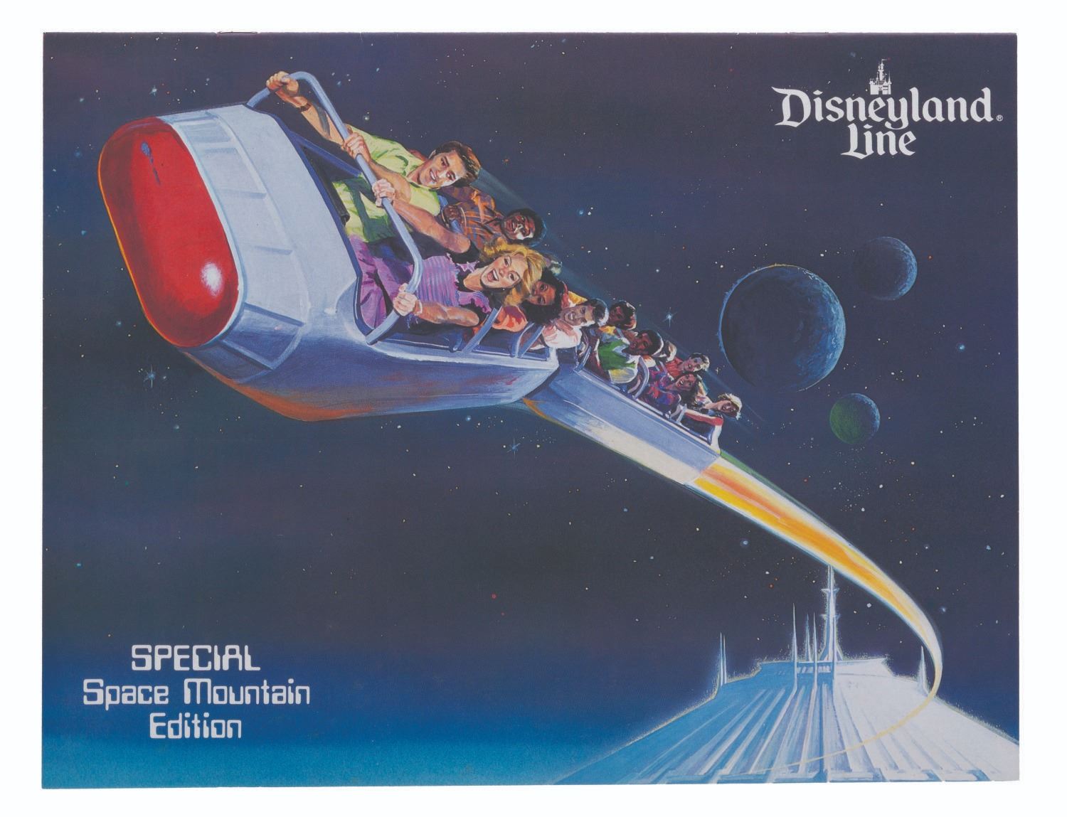 (Disneyland, 1977) A Cast Member Folder for the Space Mountain Inaugural Flight Event in the summer of 1977. Included inside are the special Space Mountain issue of Disneyland Line, the Cast Member newsletter, and an "I Conquered Space Mountain Disneyland " bumper sticker. The 3.75 " x 14 " bumper sticker and 8.5 " x 11 " Disneyland Line are in very good condition with very light handling wear, and the 9 " x 12 " folder is in good condition with light wear and spotting to the back cover.