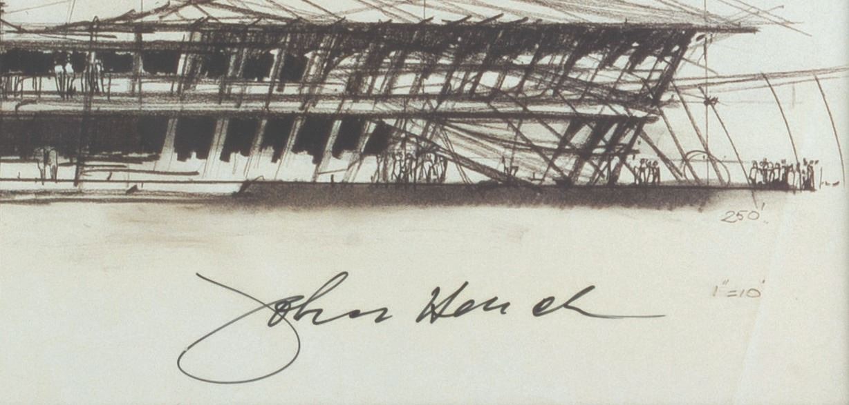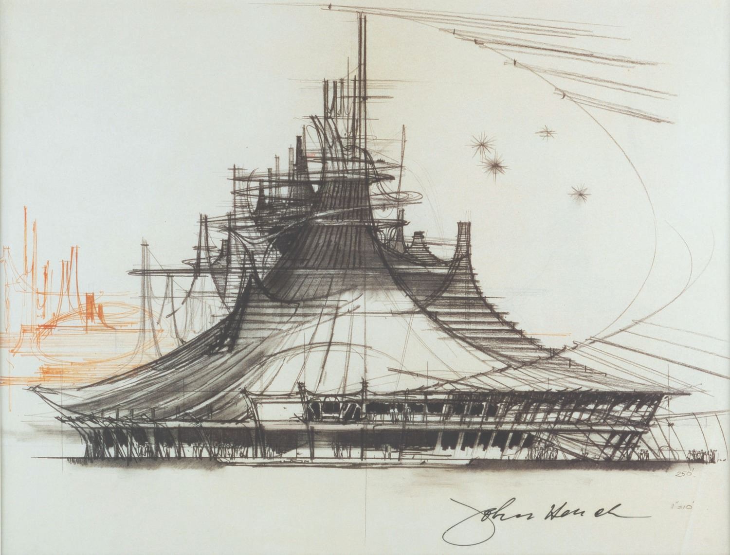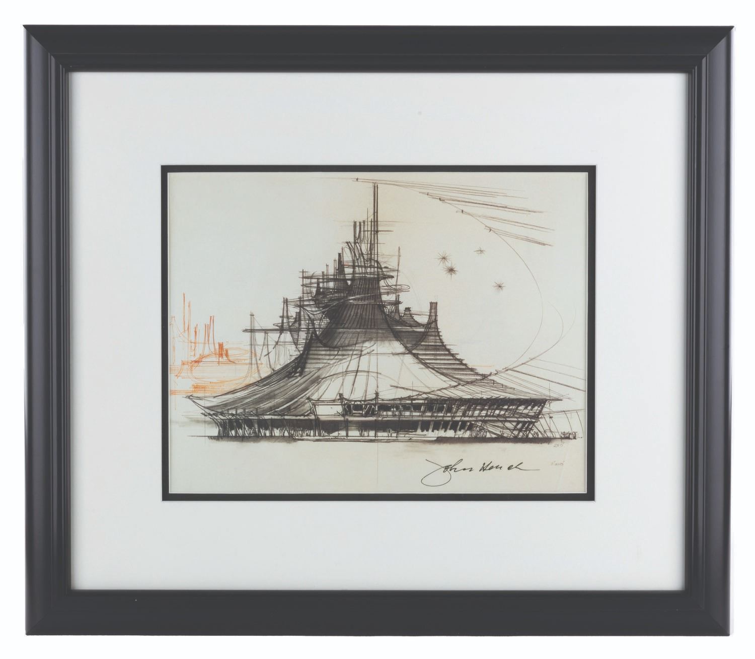 (Disneyland, 1997) A signed John Hench "Space Mountain Concept" limited edition print, sold through The Disney Gallery at Disneyland. With an image size of 9.75” x 12.5” in a frame and matte measuring 18.5” x 21.5”, the print displays in fine condition.