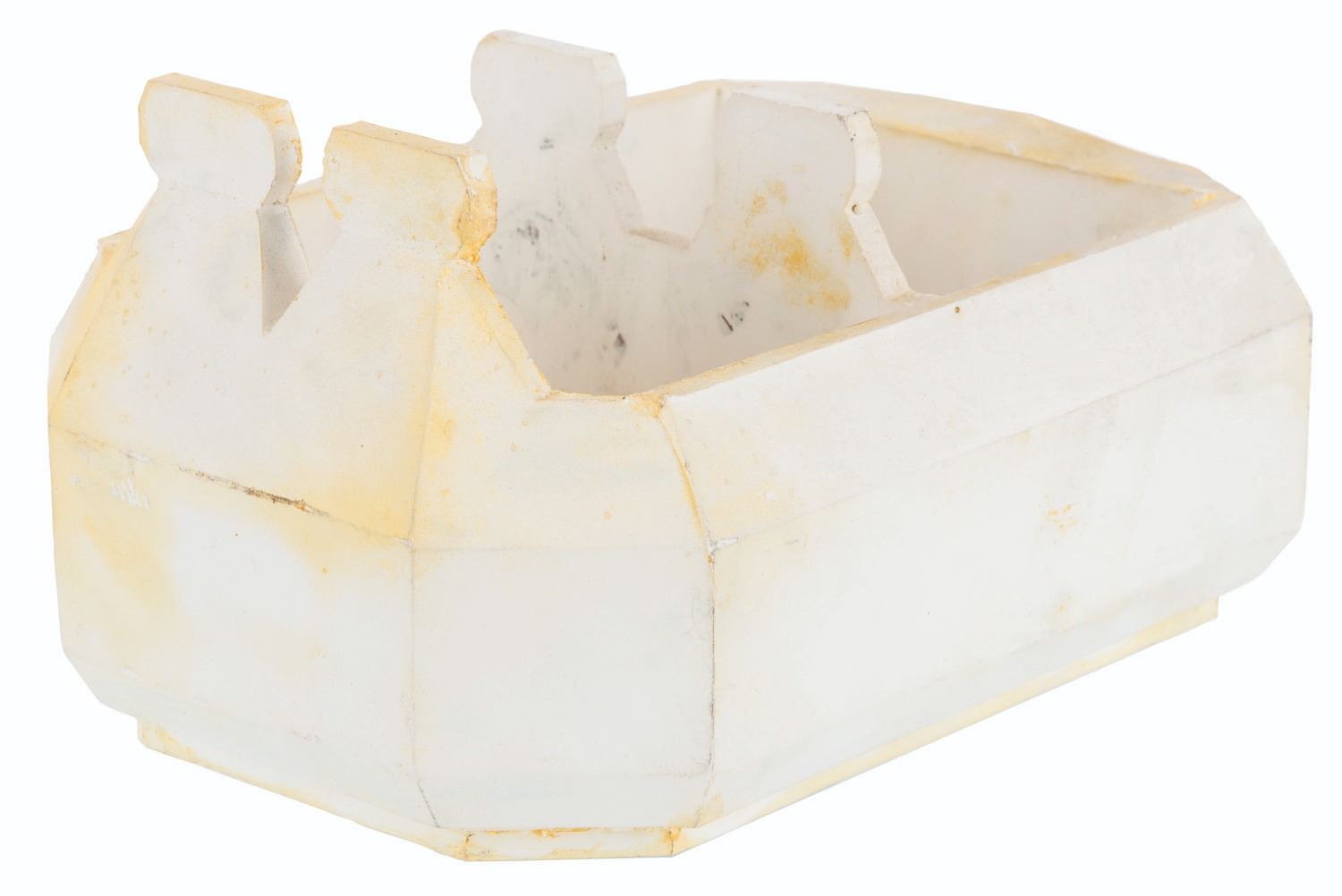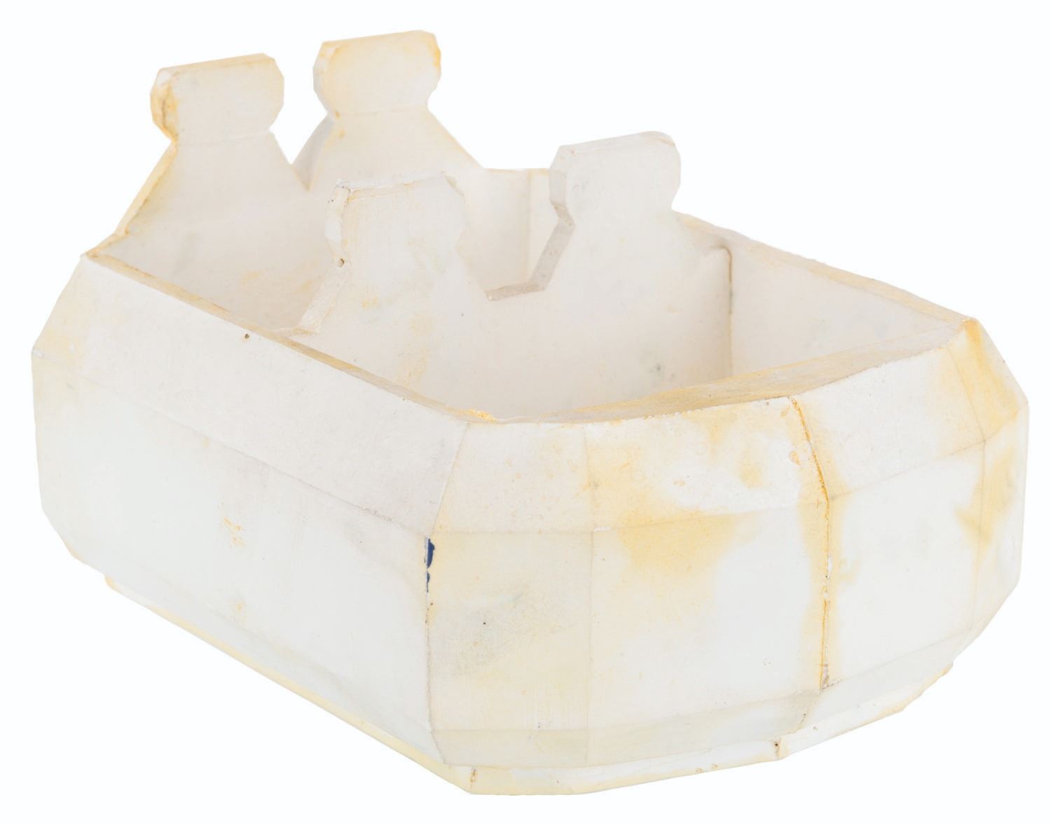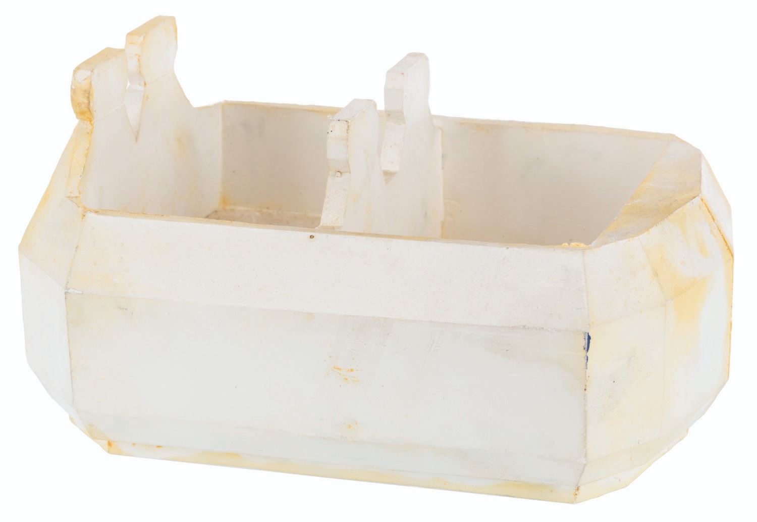 (EPCOT Center, 1980s) A hand-crafted Spaceship Earth ride vehicle model created by Walt Disney Imagineering. Known for the giant geodesic dome that dominates the EPCOT skyline, Spaceship Earth takes Guests on a time-travelling journey as they explore human communications through the ages. The unfinished resin model gives designers a rough approximation of the size, scale, and layout of the ride vehicle. Measuring 5" x 6.5" x 3.5" tall, the model is in good, production-used condition with soiling, discoloration, adhesive residue, and edge wear.