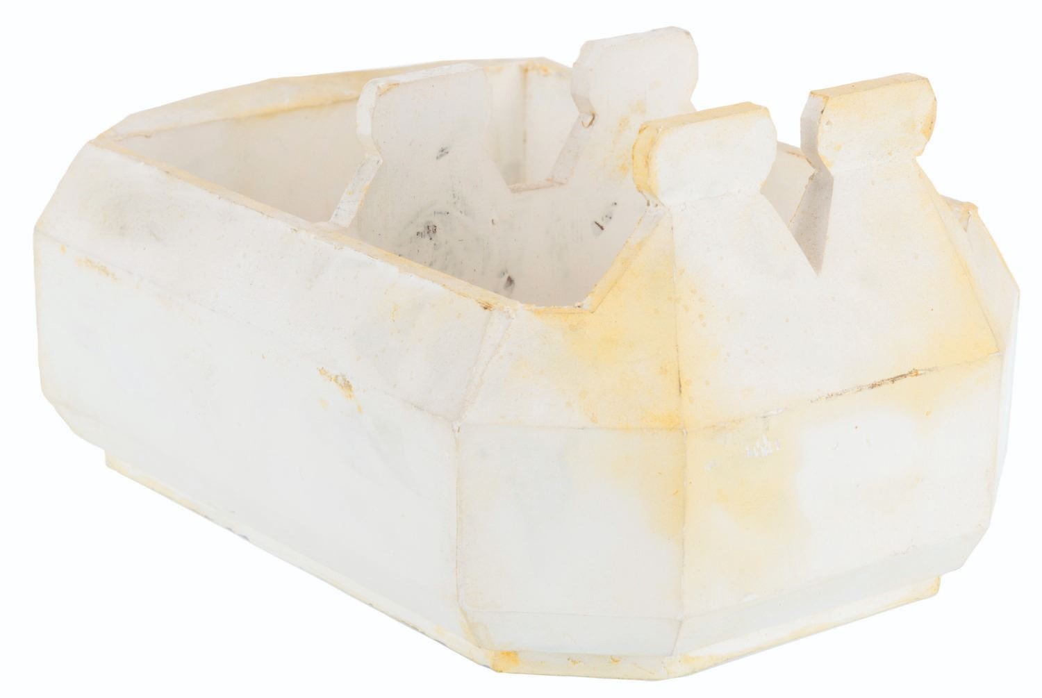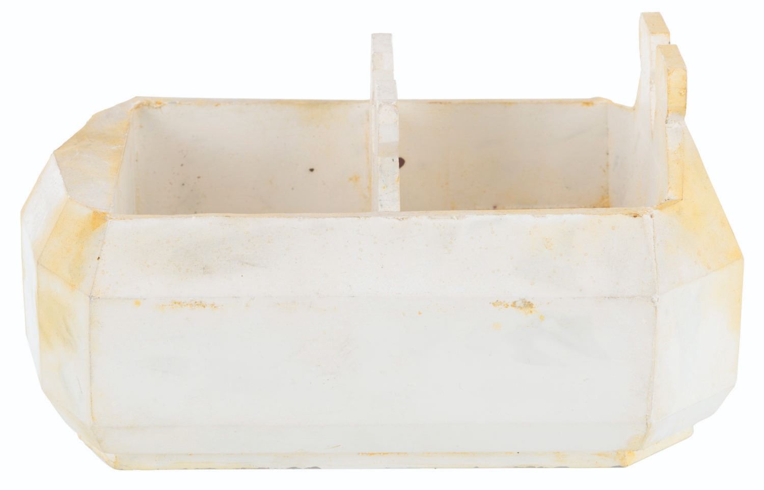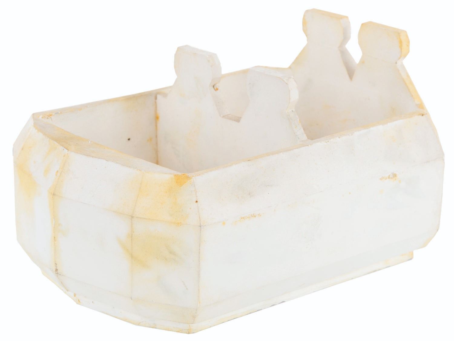 (EPCOT Center, 1980s) A hand-crafted Spaceship Earth ride vehicle model created by Walt Disney Imagineering. Known for the giant geodesic dome that dominates the EPCOT skyline, Spaceship Earth takes Guests on a time-travelling journey as they explore human communications through the ages. The unfinished resin model gives designers a rough approximation of the size, scale, and layout of the ride vehicle. Measuring 5" x 6.5" x 3.5" tall, the model is in good, production-used condition with soiling, discoloration, adhesive residue, and edge wear.
