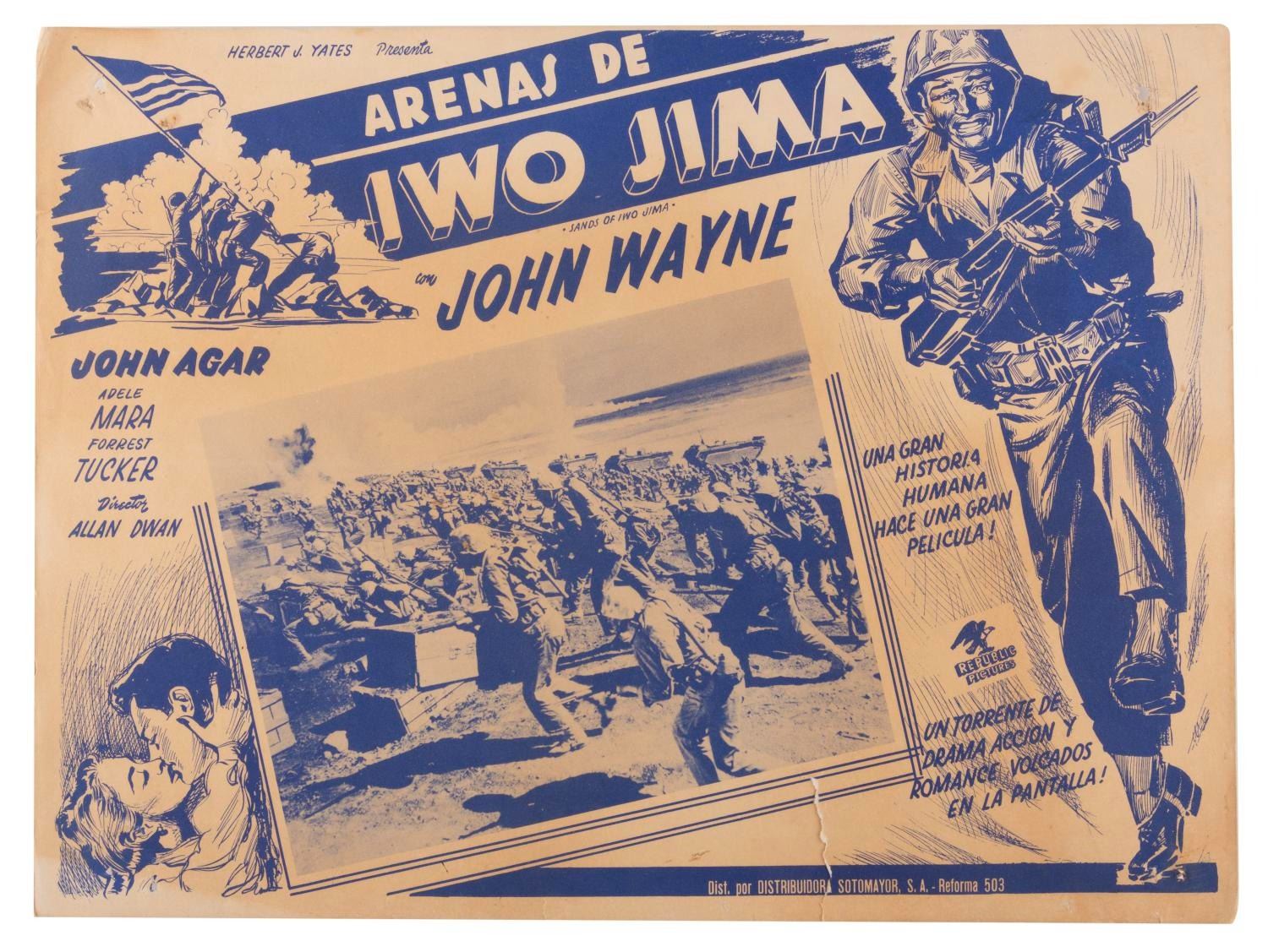 (Republic Pictures, 1949) A Spanish-language lobby card for the theatrical release of "Sands of Iwo Jima," starring John Wayne. Measuring 12.5" x 16.5", the card is in fair condition with edge wear, several holes near all corners, and a 2" tear into the bottom edge.