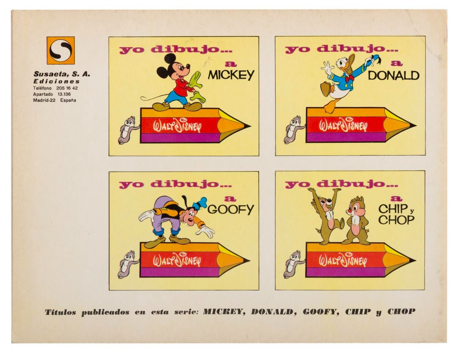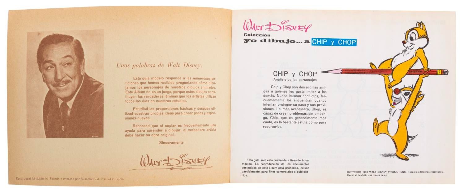 (Disney, 1970) A "Yo Dibujo a Chip y Chop" spanish drawing book featuring a foreword by Walt Disney. Measuring 8.25" x 10.75" the book is in very good condition with discoloration, light creasing and soiling.