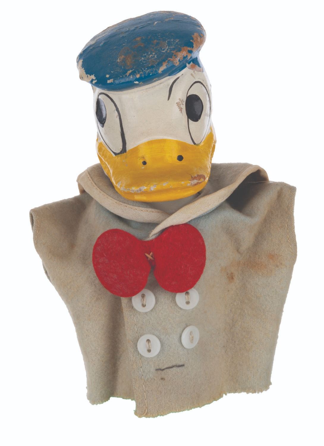 (Spear, 1940s) An early Donald Duck fabric toy, originally part of a Spear jack-in-the-box. Measuring 4.5" x 6", this toy is in poor condition with paint chipping on Donald's hat and beak and discoloration and fading throughout from age.